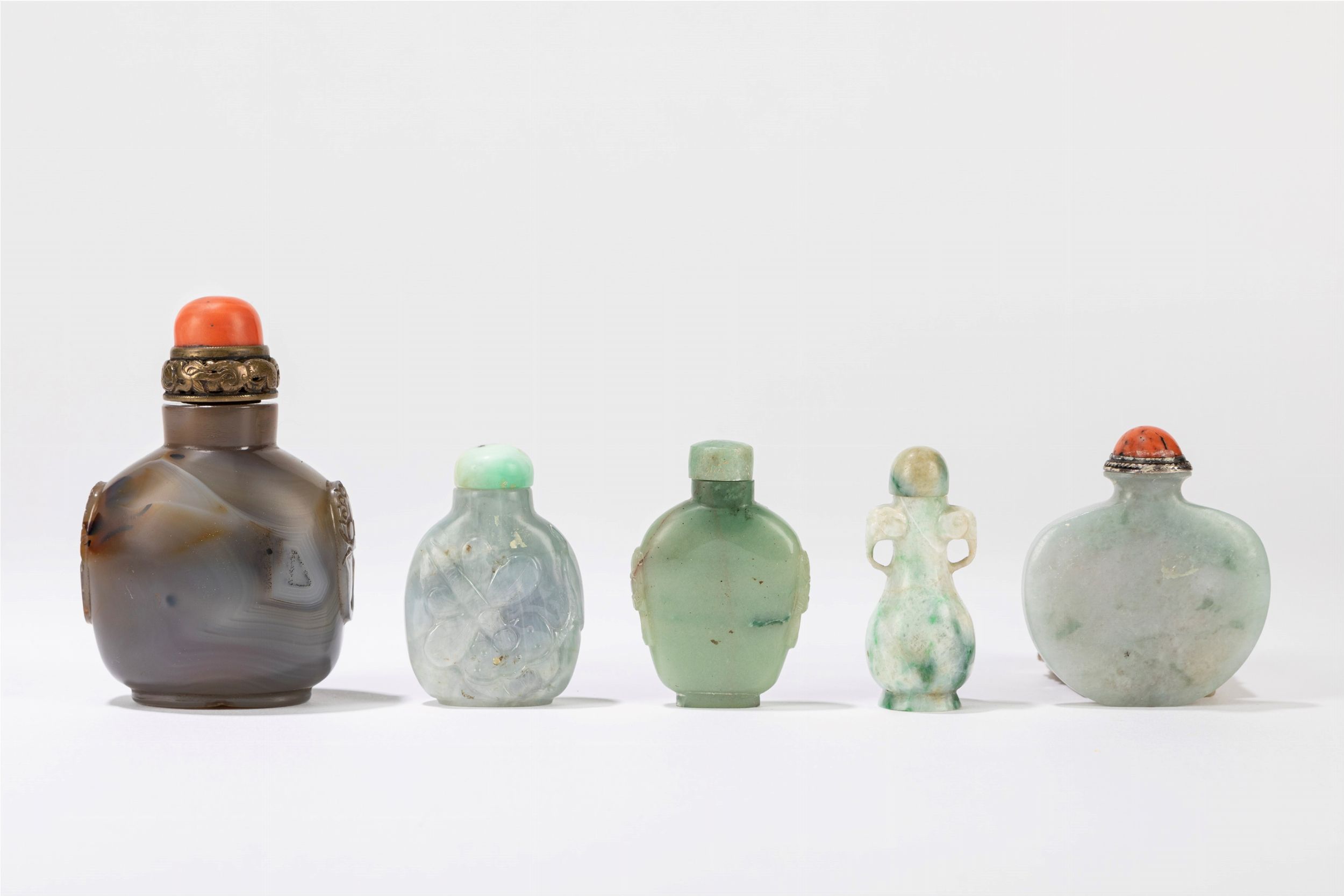 Cina, secolo XIX/XX di cui tre in giadeite, una in pietra dura e una in agata con tappo in argento e corallo. ☼鼻烟壶一组五只,中国,十九/二十世纪初