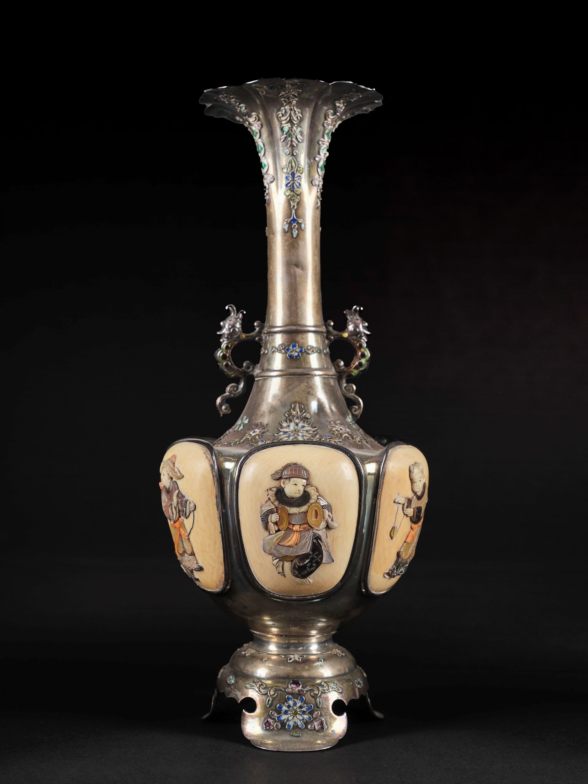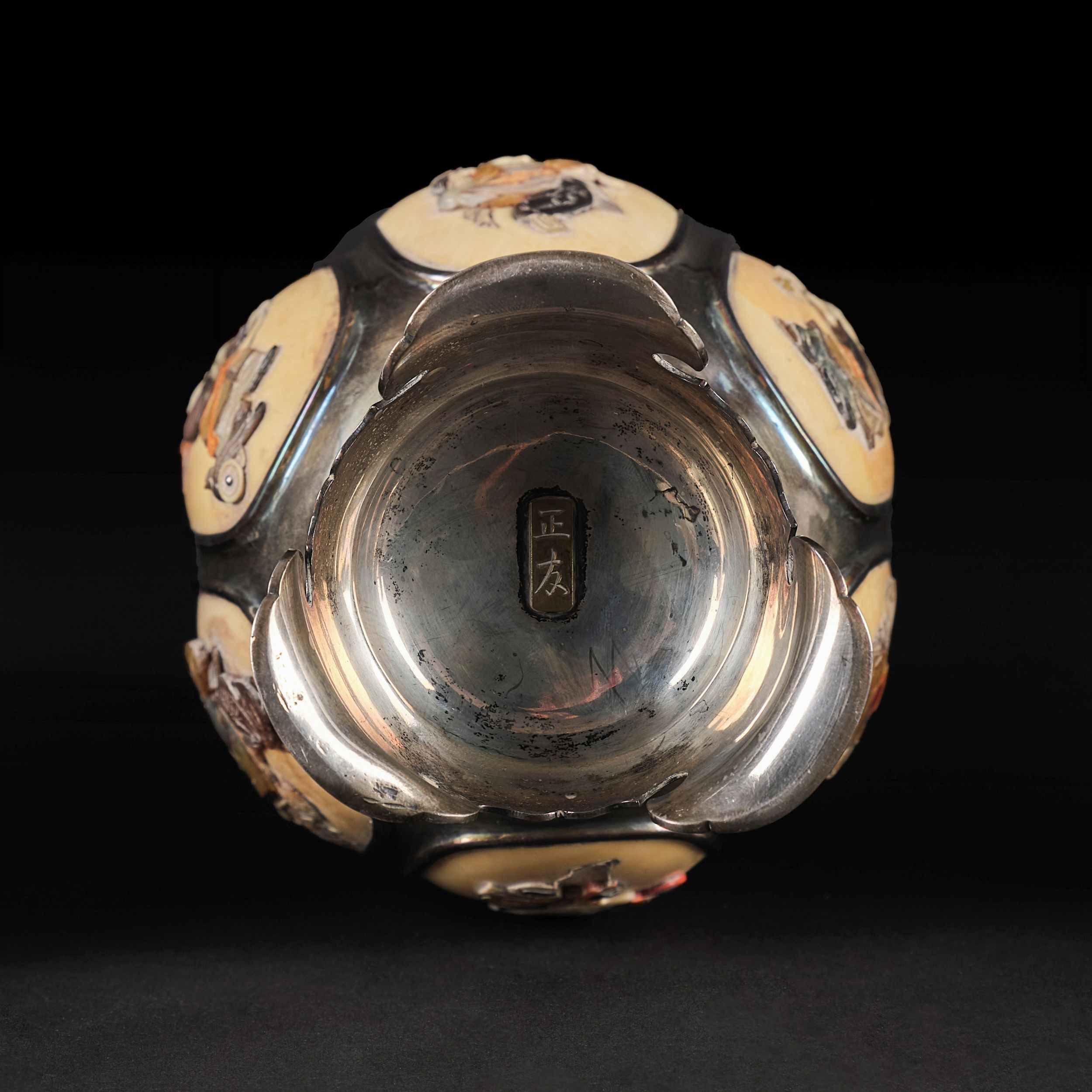 h cm 23,8 x l cm 10,5 x p cm 9,5; g. 364 Giappone, periodo Meiji (1868-1912) il corpo di forma esagonale con sei riserve in avorio lobate e bordate d'argento, ciascuno delle quali raffigura figure giapponesi intarsiate in madreperla; il collo del vaso allungato è finemente decorato con fiori e due anse a guisa di mostro marino. Firmato alla base Per il seguente lotto è disponibile la certificazione CITES ☼芝山银花瓶,日本,明治时期 (1868-1912)