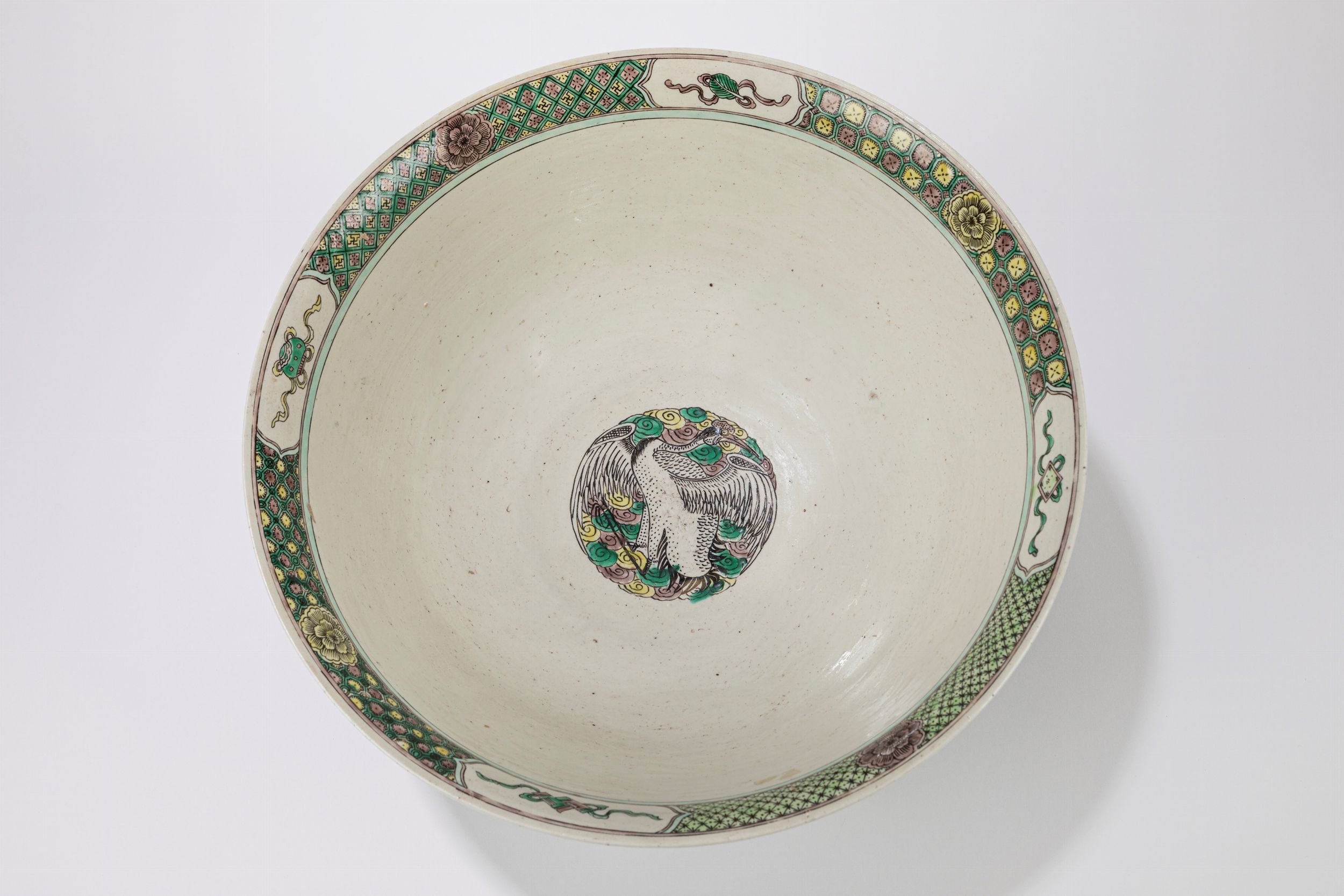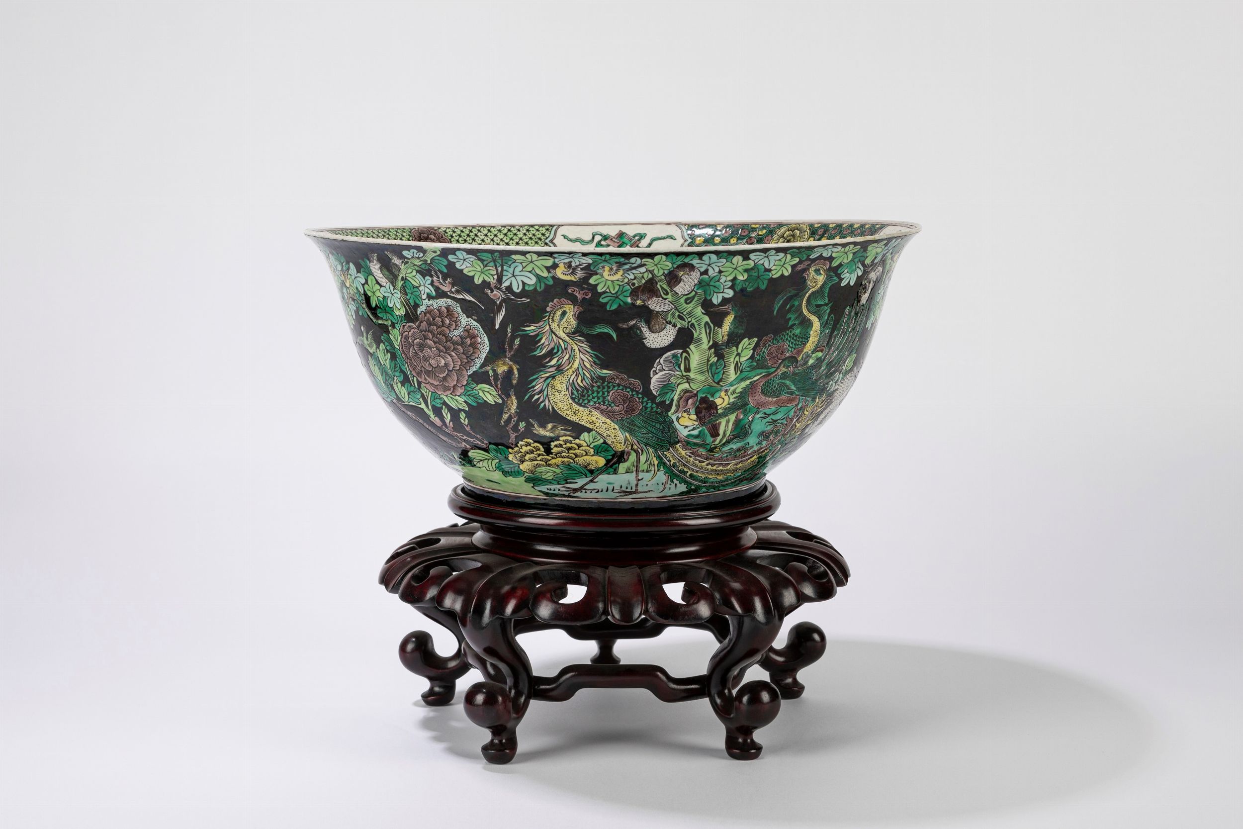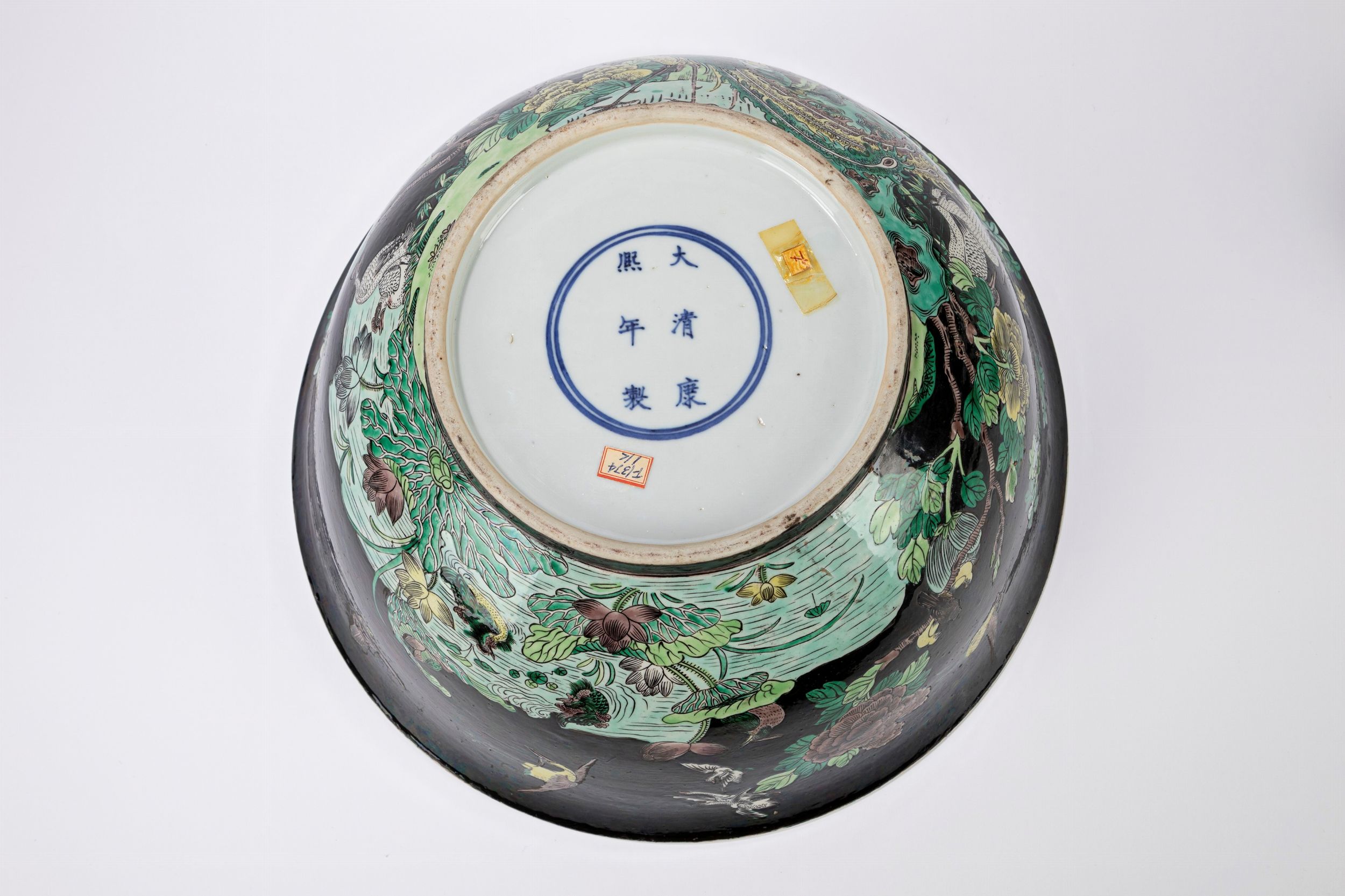 d cm 37 Cina, secolo XIX dipinta sul corpo a fondo nero con fiori e uccellini in un paesaggio floreale, all'interno una fascia a motivi geometrici è intervallata da riserve con oggetti buddisti beneauguranti e centrata da una gru tra nuvole; alla base reca marchio apocrifo a sei caratteri entro doppio cerchio Kangxi (con base in legno) 墨地素三彩大型陶瓷碗,中国, 十九世纪