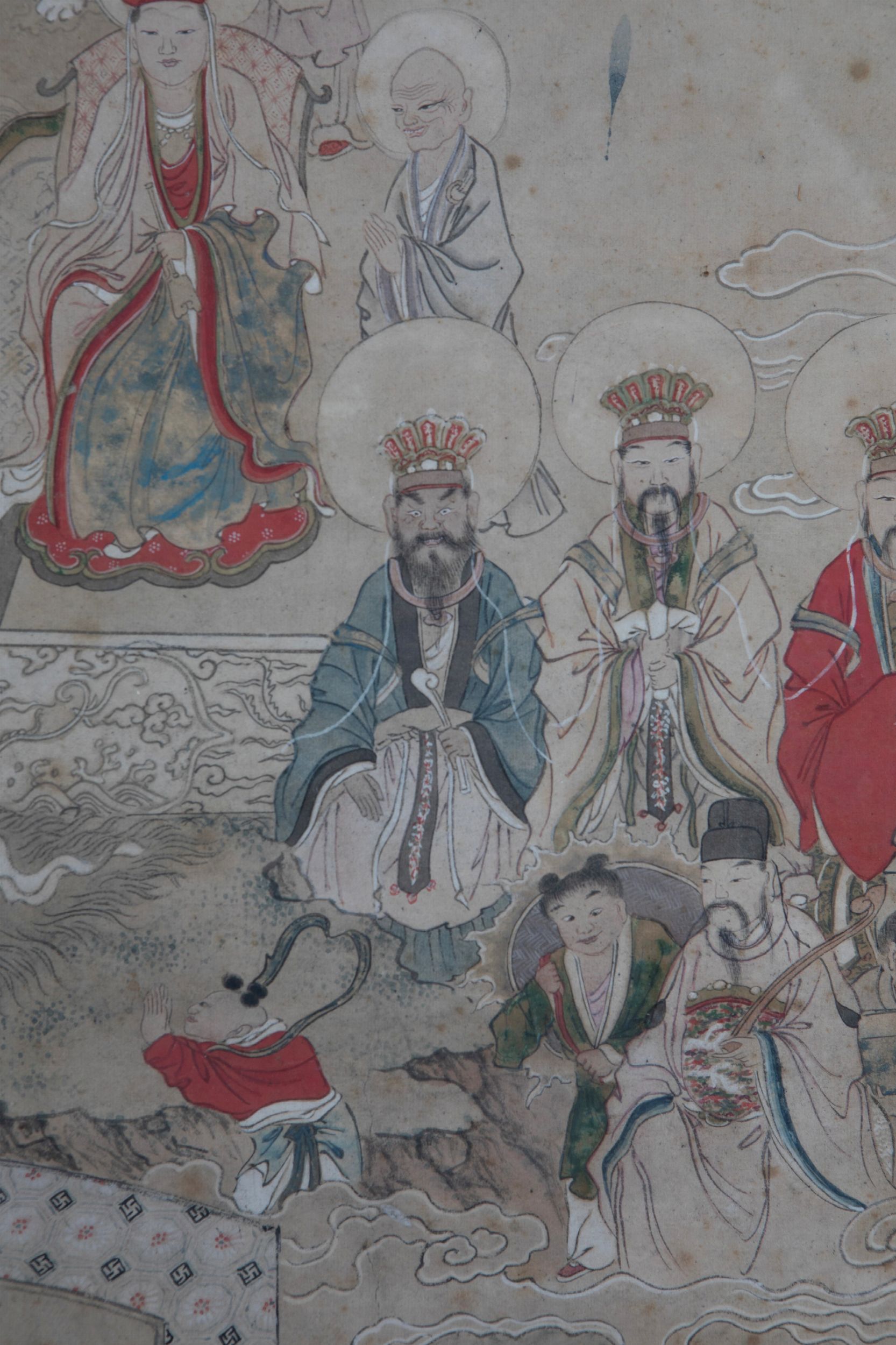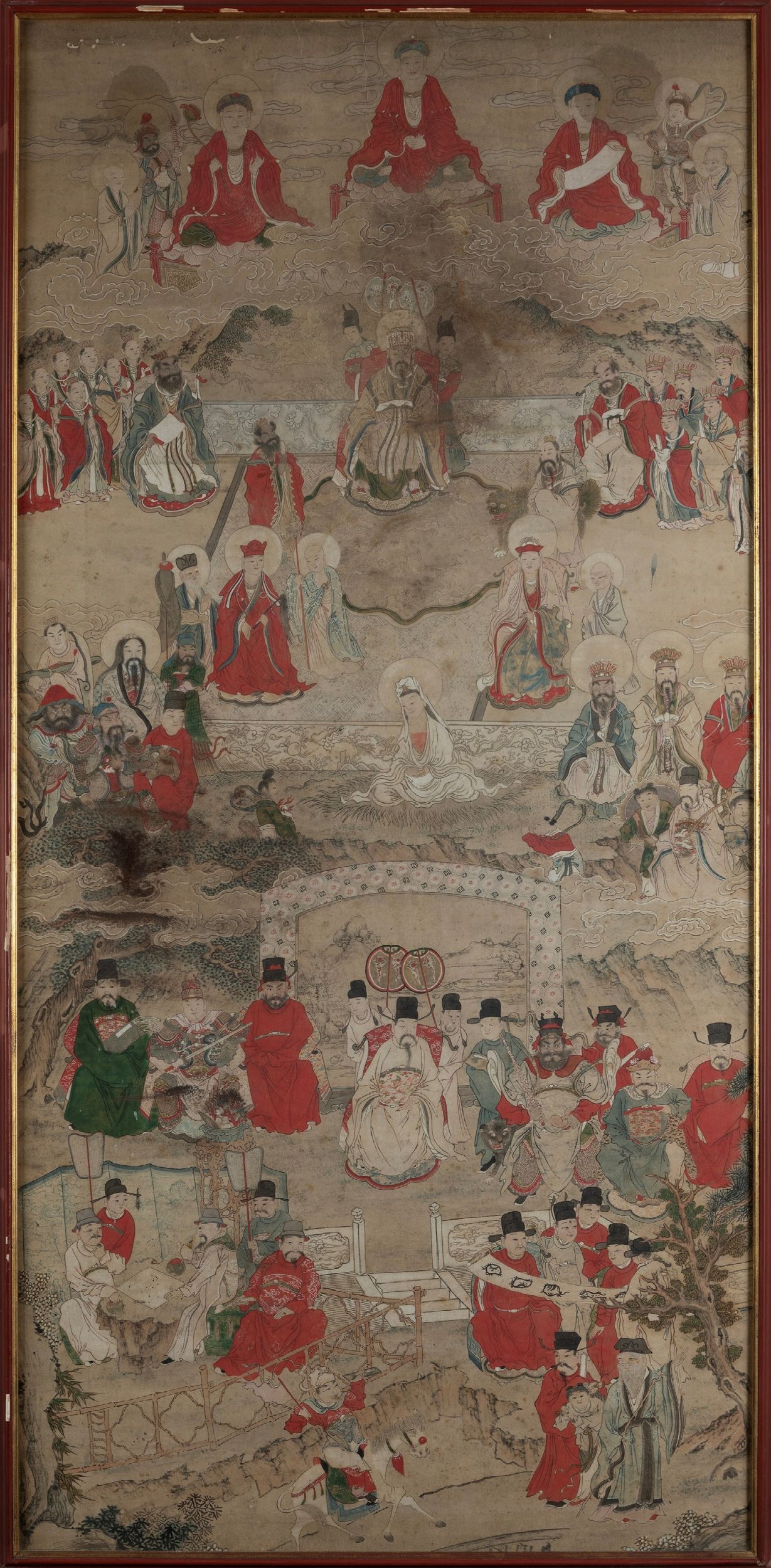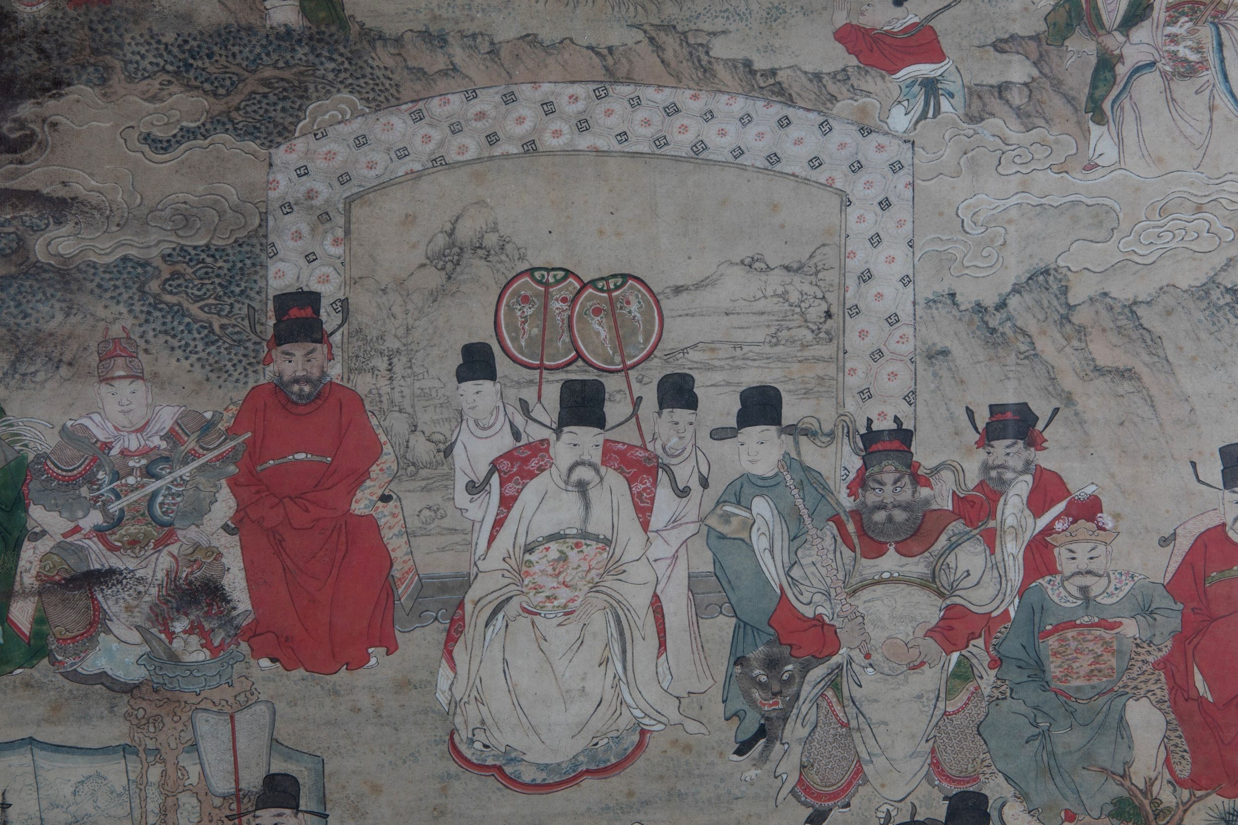 Cina, secolo XIX dipinto a più registri, mostra varie scene di corte con attendenti, saggi, accoliti e diplomatici in un paesaggio montano sormontati da guanyin e divinità taoiste (difetti) 描绘达官贵人大型丝绸画,中国,十九世纪