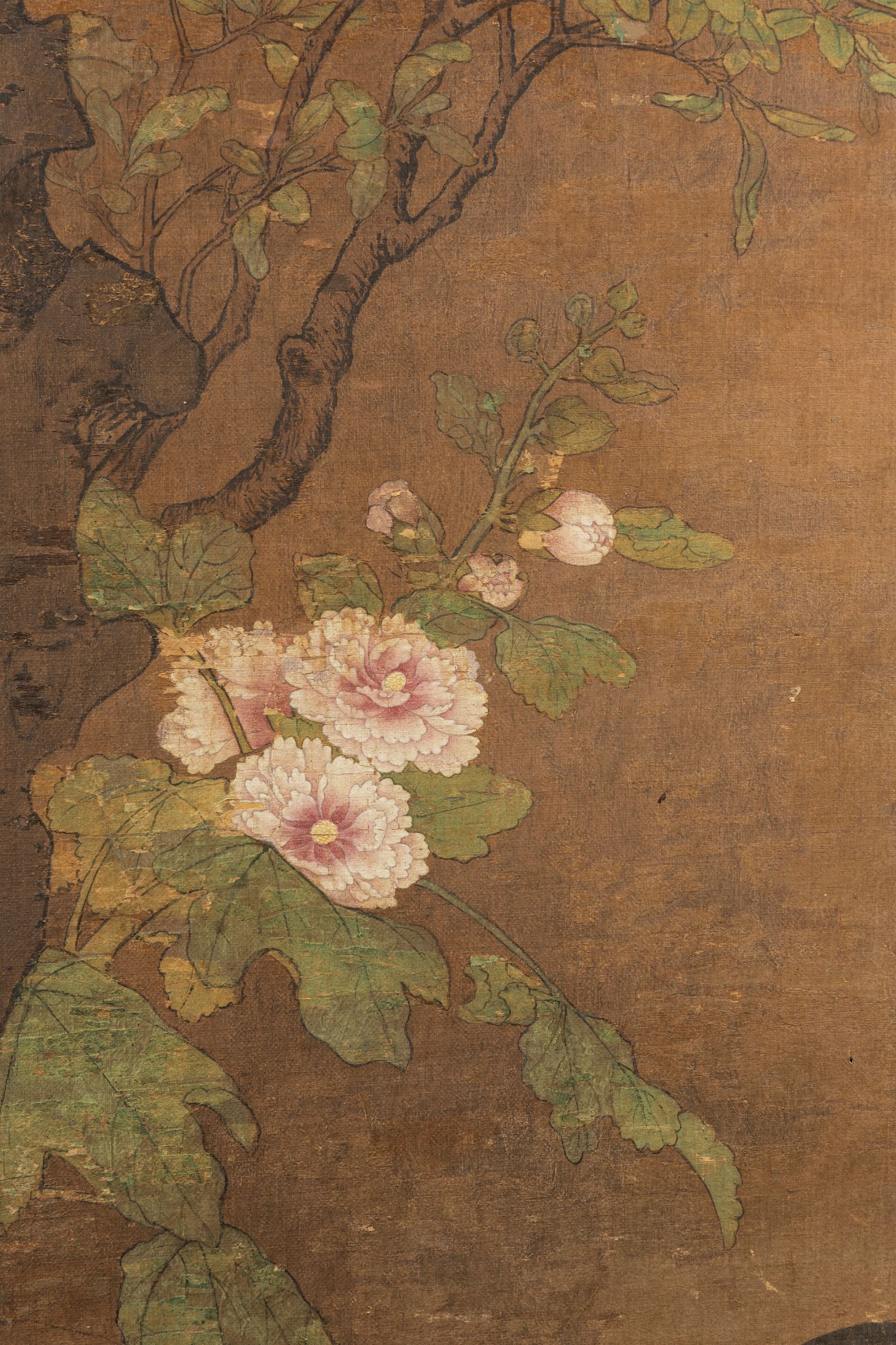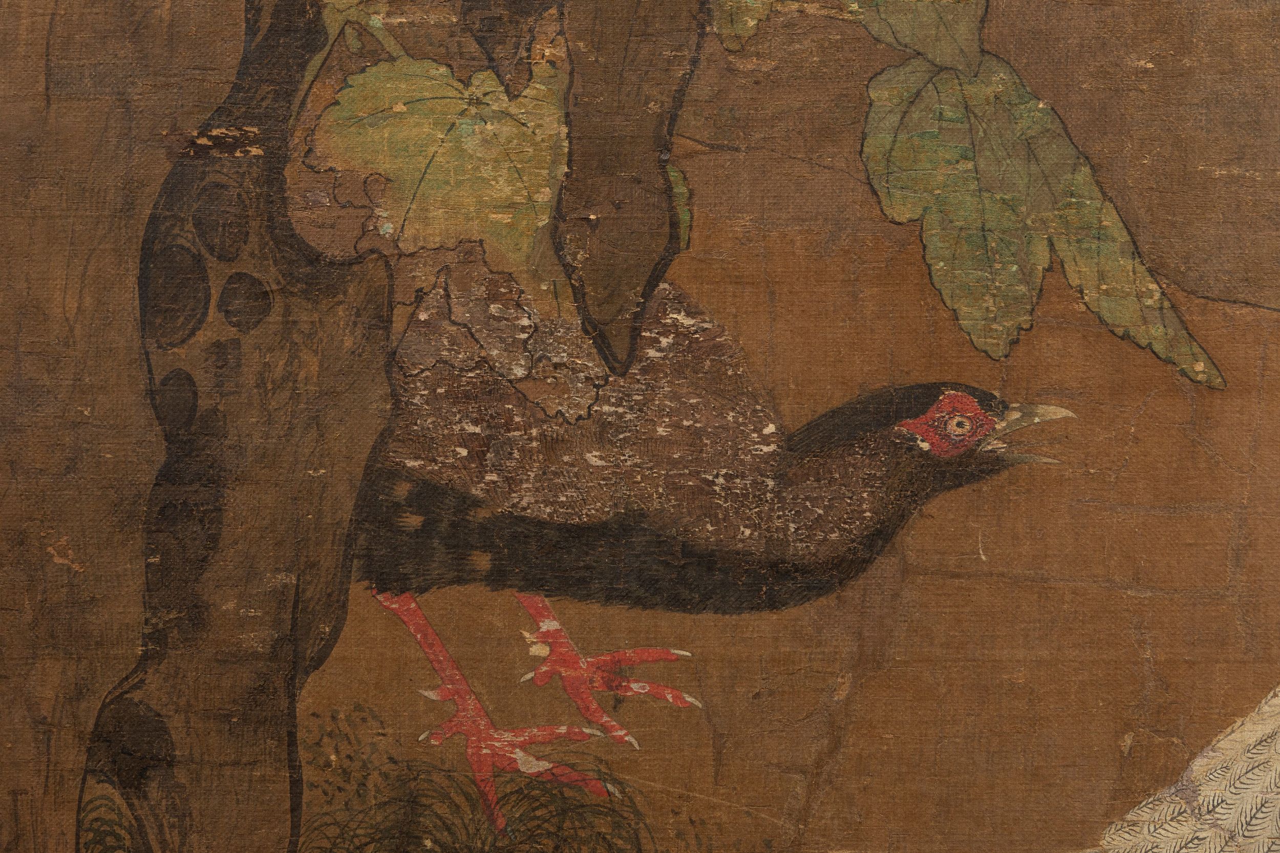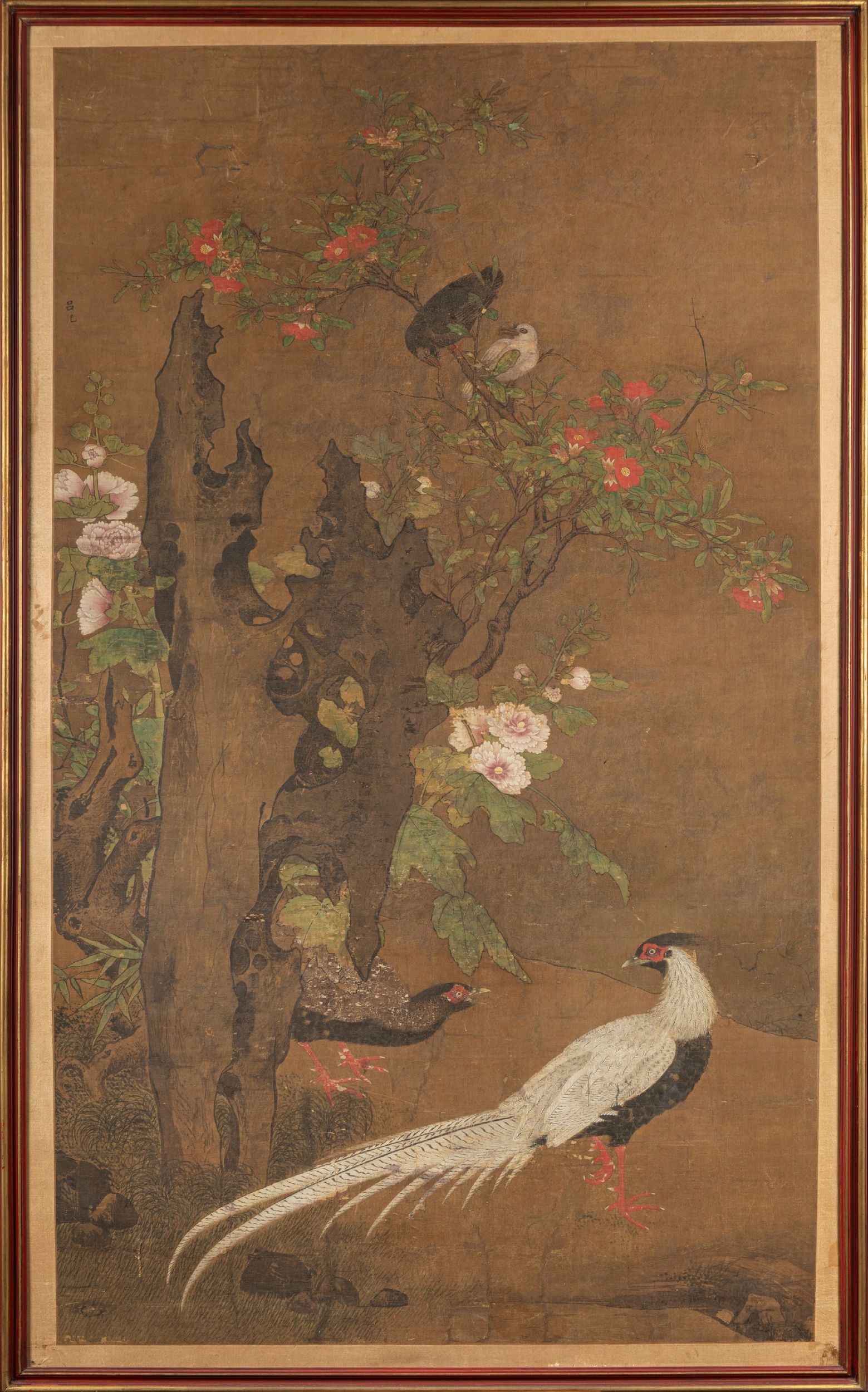 Cina, secolo XIX raffigurante paesaggio floreale con alberi, peonie, uccellini e fagiani; firmato Lǚ Jì (呂紀) 大型雉鸡丝绸画,署名吕纪,中国,19世纪