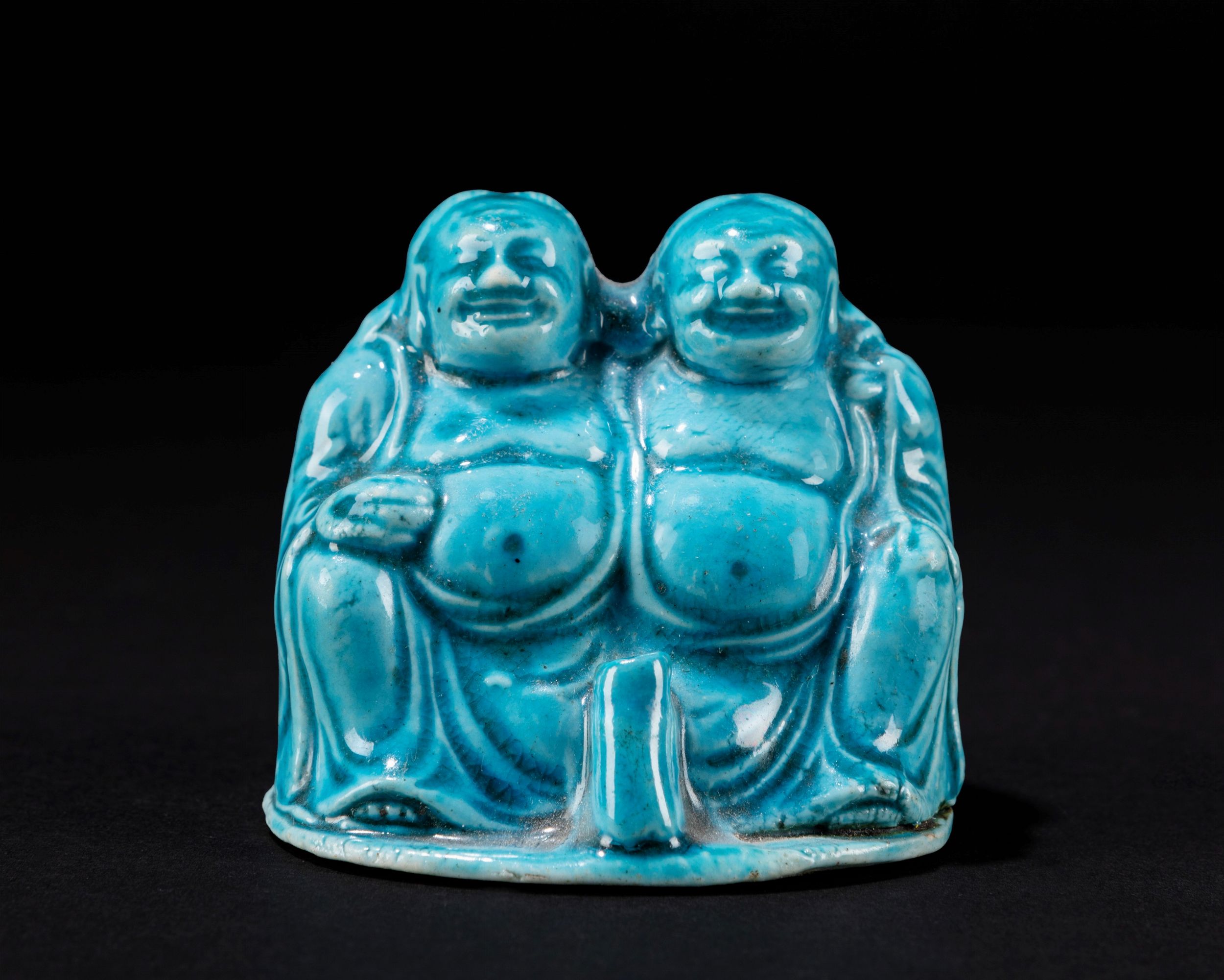 Cina, periodo Kangxi (1661-1722) a forma dei due Immortali He-He Erxian, entrambi seduti e sorridenti mentre si abbracciano vicendevolmente 绿松石釉瓷香炉,康熙时期(1661-1722)
