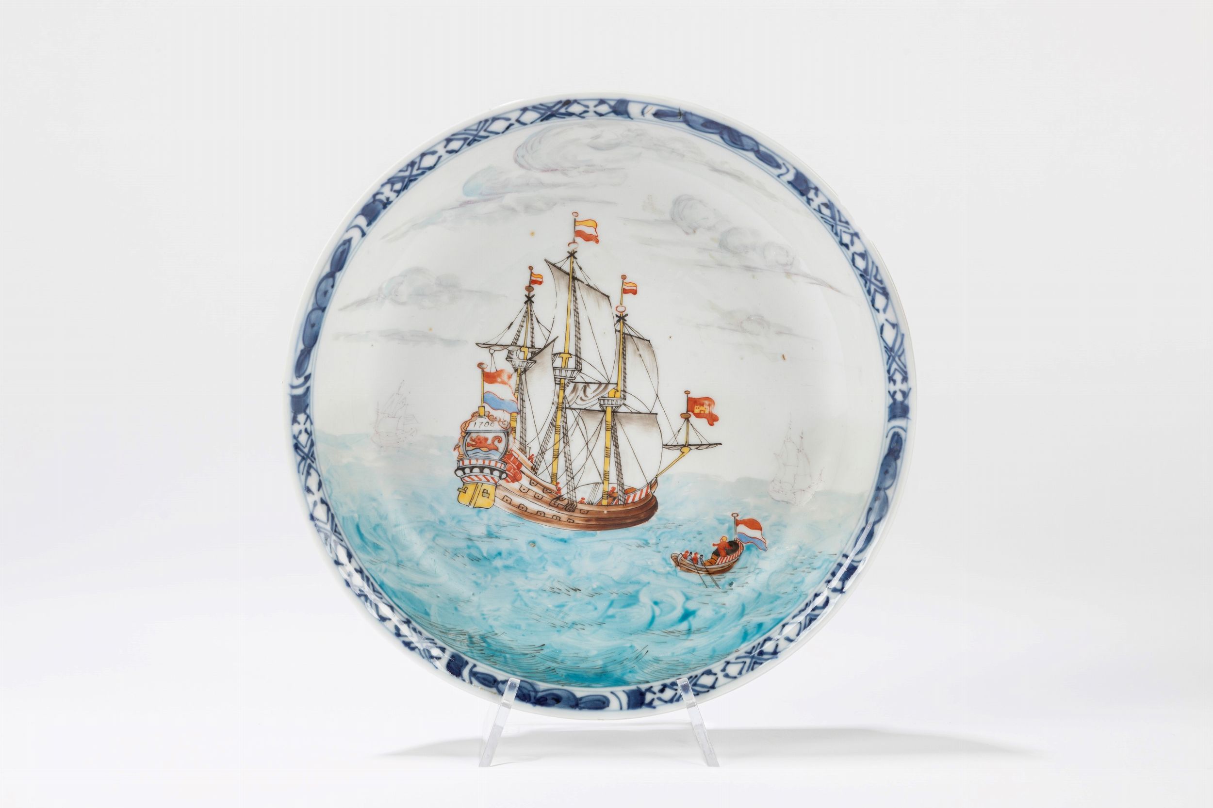 Cina, secolo XVIII decorata con veliero VOC con bandiere olandesi (difetti) 出口小瓷盘,中国,十八世纪