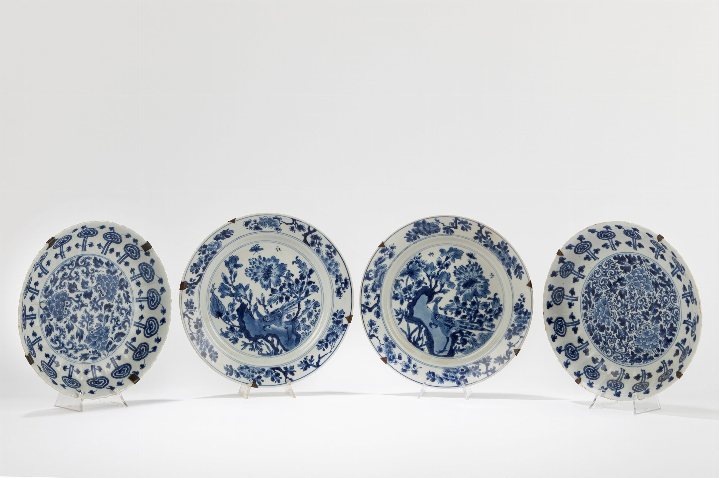 d cm 20 Cina, secolo XVIII due decorati con motivi di peonie e fiori di loto, due con fenici in paesaggio floreale; i primi recano marchio con due doppi cerchi e fiore alla base, gli altri due il marchio apocrifo a sei caratteri Chenghua 青花瓷盘四只,中国,十八世纪