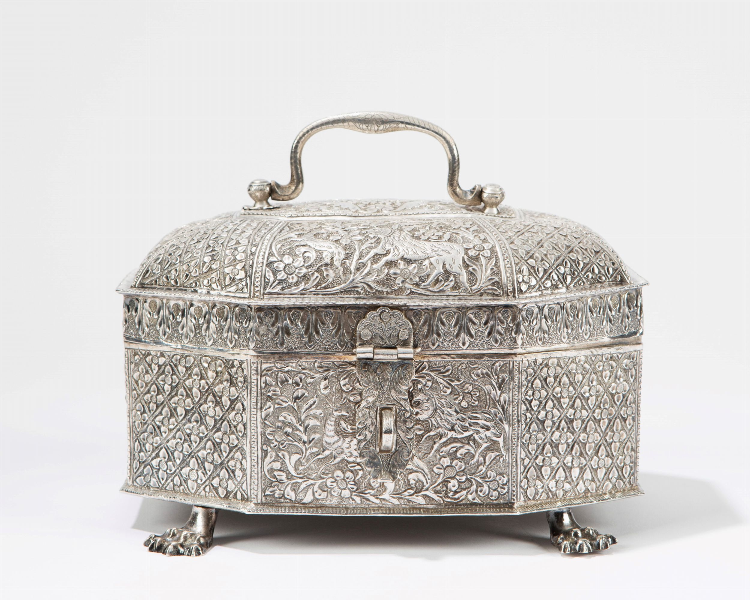 India, secolo XIX poggiante su quattro piedini ferini, decorato a riserve con motivi floreali stilizzati e scene naturalistiche con animali 银製八角宝箱,印度,19世纪