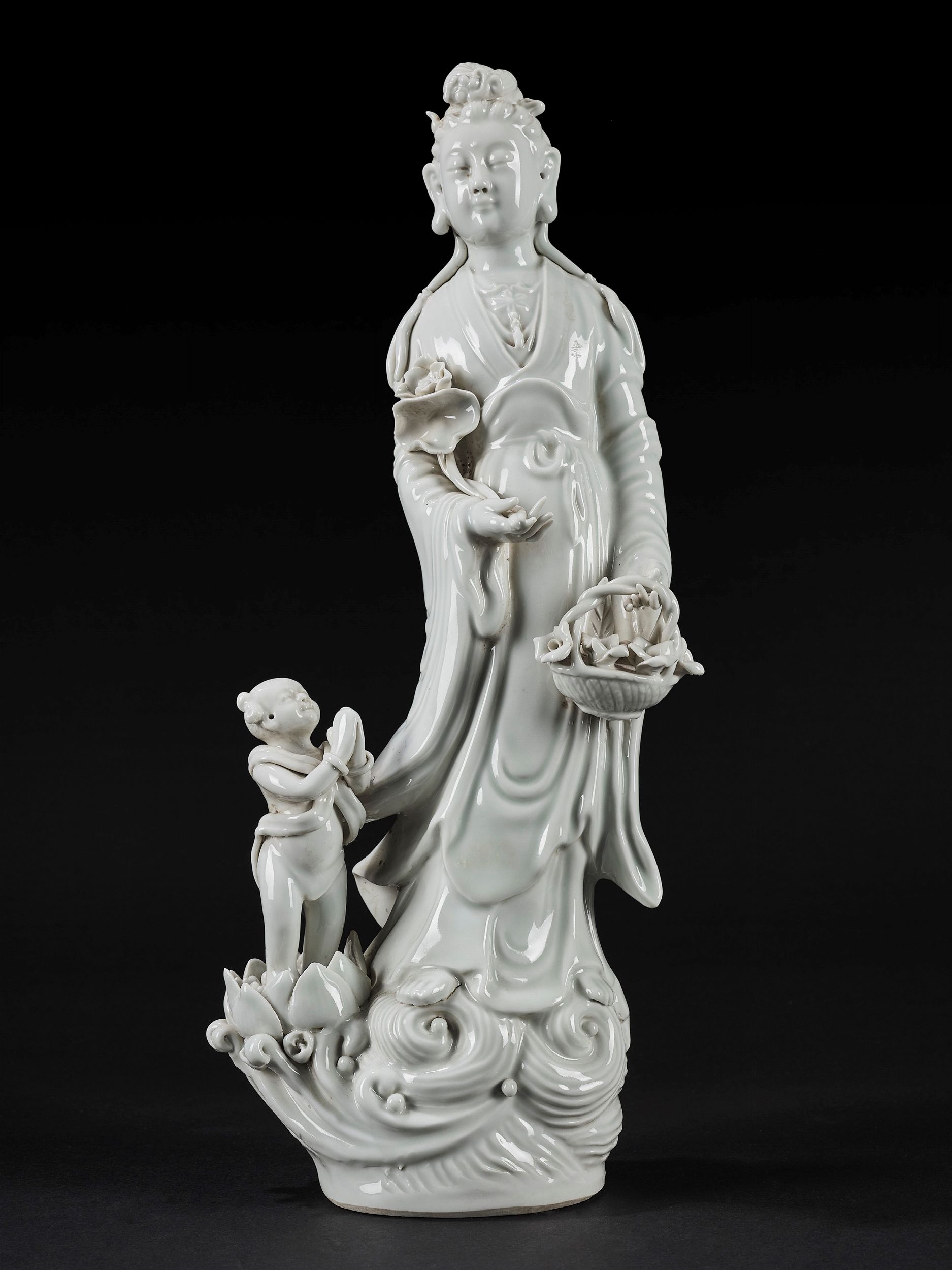 h cm 41 Cina, periodo della Repubblica (1912-1949) raffigurante guanyin stante su una nuvola, con volto sereno regge con una mano un cesto di fiori e con l'altra un ramo fiorito; e un bambino su una base a guisa di fiore di loto con le mani in posizione di preghiera (marcata alla base) 白瓷观音与小童,中国,民国时期 (1912-1949)