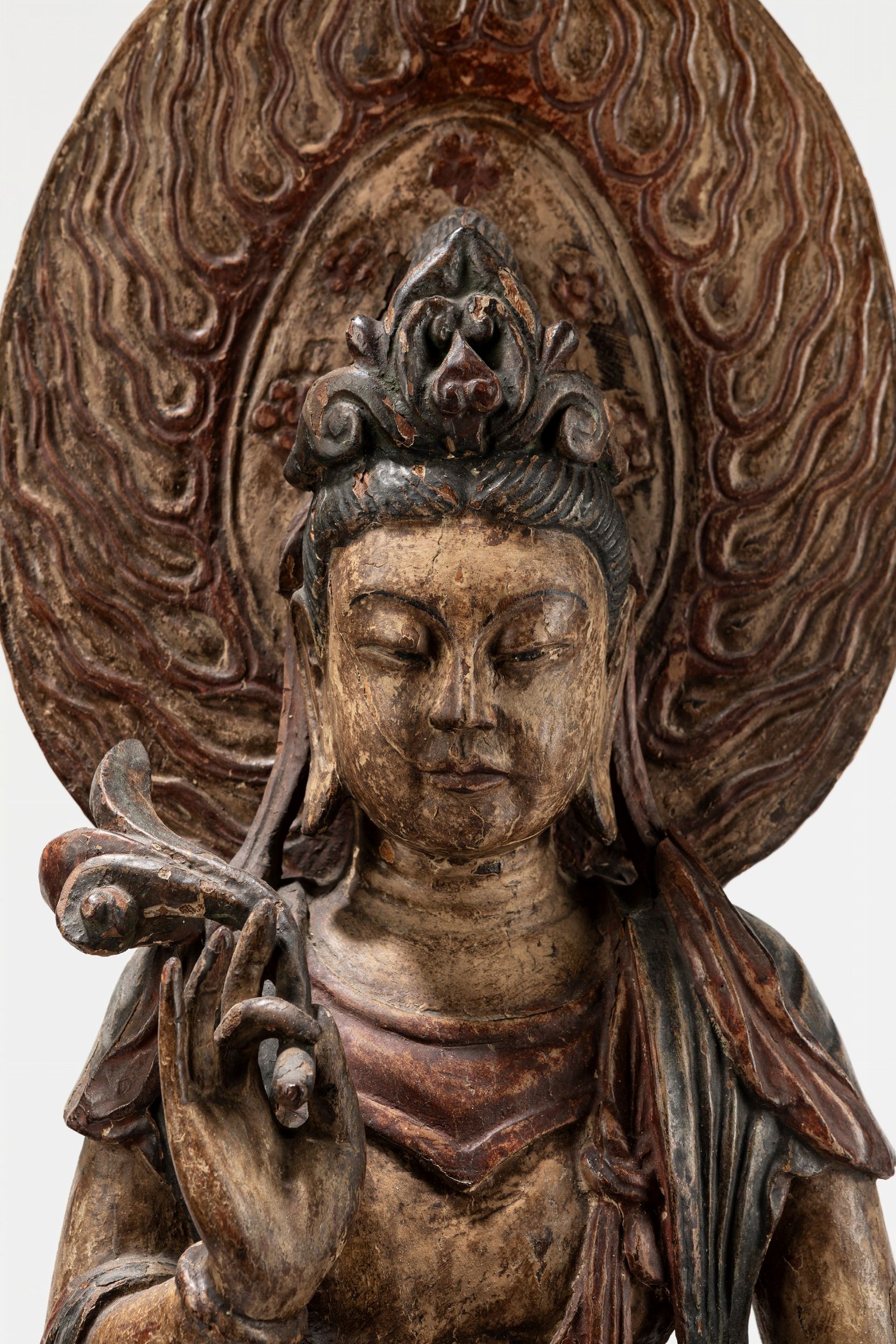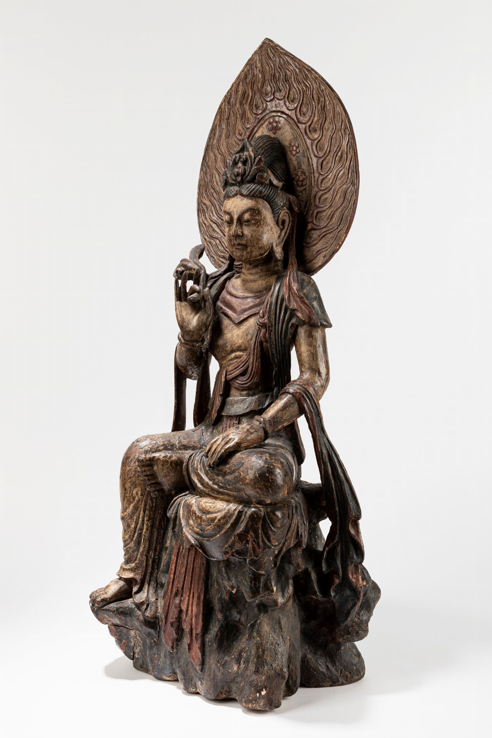 Cina, inizio dinastia Qing, secolo XVIII assisa su una roccia con la gamba sinistra piegata lalitasana; regge, con volto regale e sereno, un ramo fiorito tra le dita della mano destra in mayuramudra 木凋彩观音座像,中国,清朝初期,十八世纪