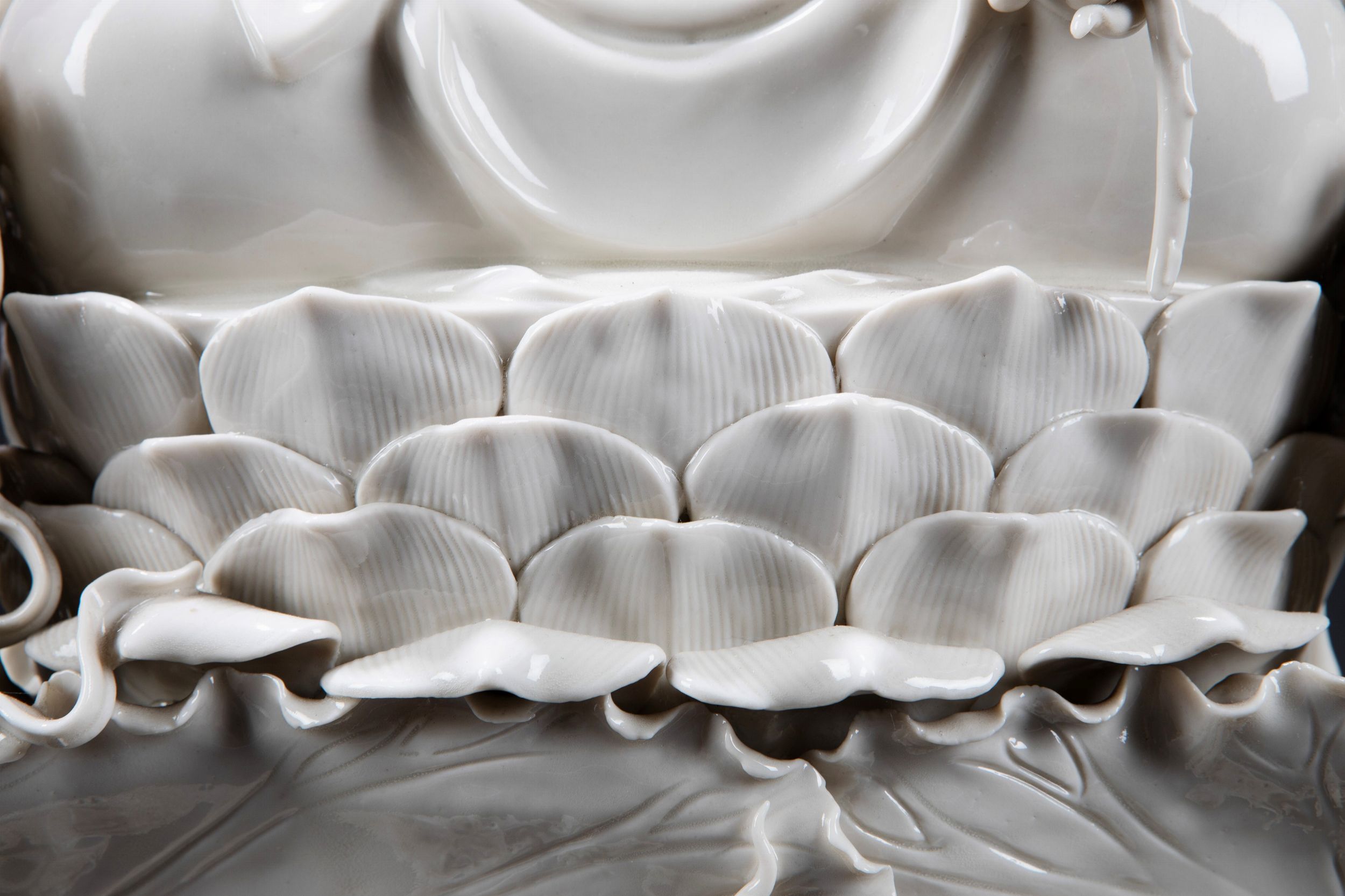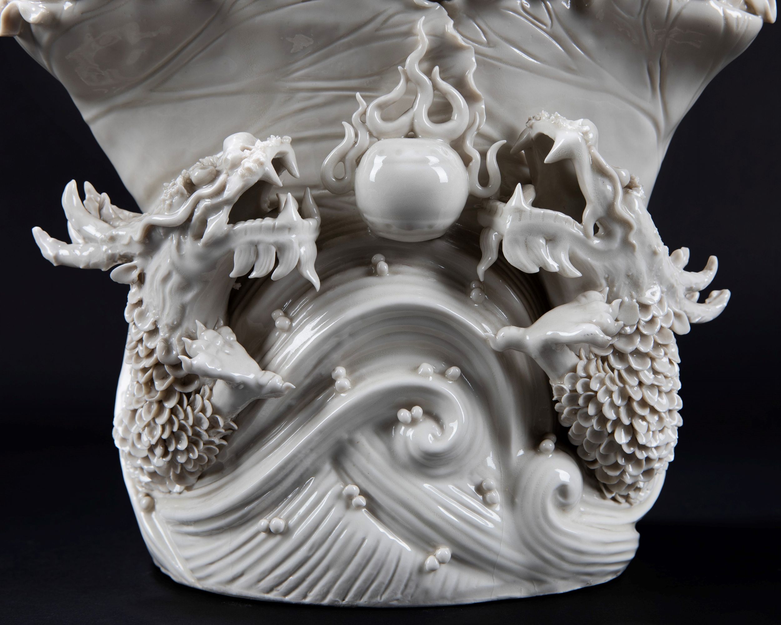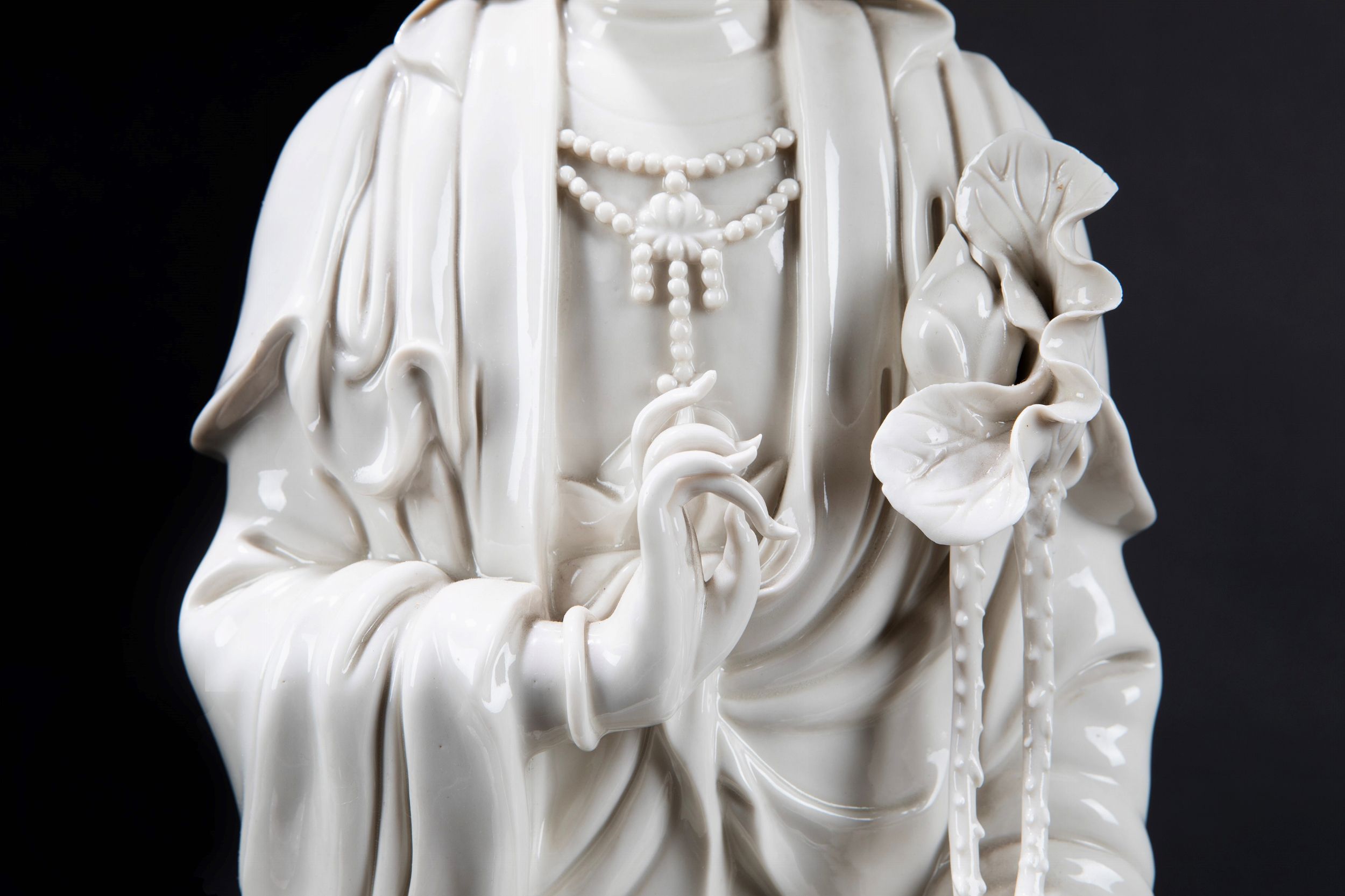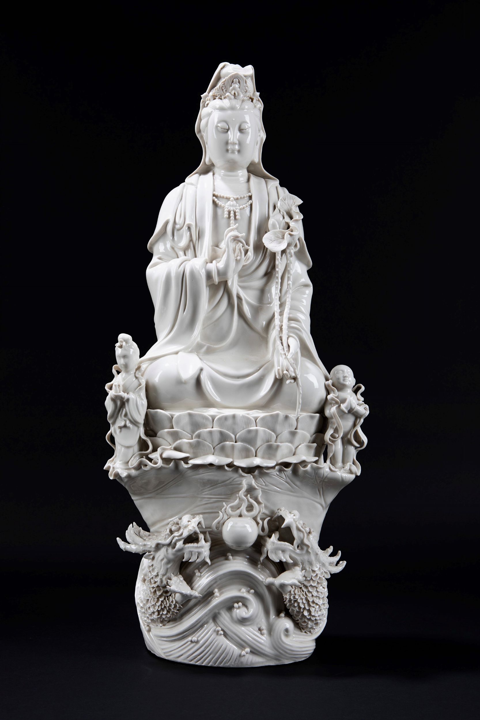 h cm 67,5 Cina, inizio secolo XX raffigurante figura di Guanyin assisa in posizione benedicente su una base a fiore di loto sorretta da due draghi che inseguono la perla fiammante tra nuvole; ai lati della base sono presenti due accoliti elegantemente adornati (difetti) 德化观音瓷像,中国,20世纪初
