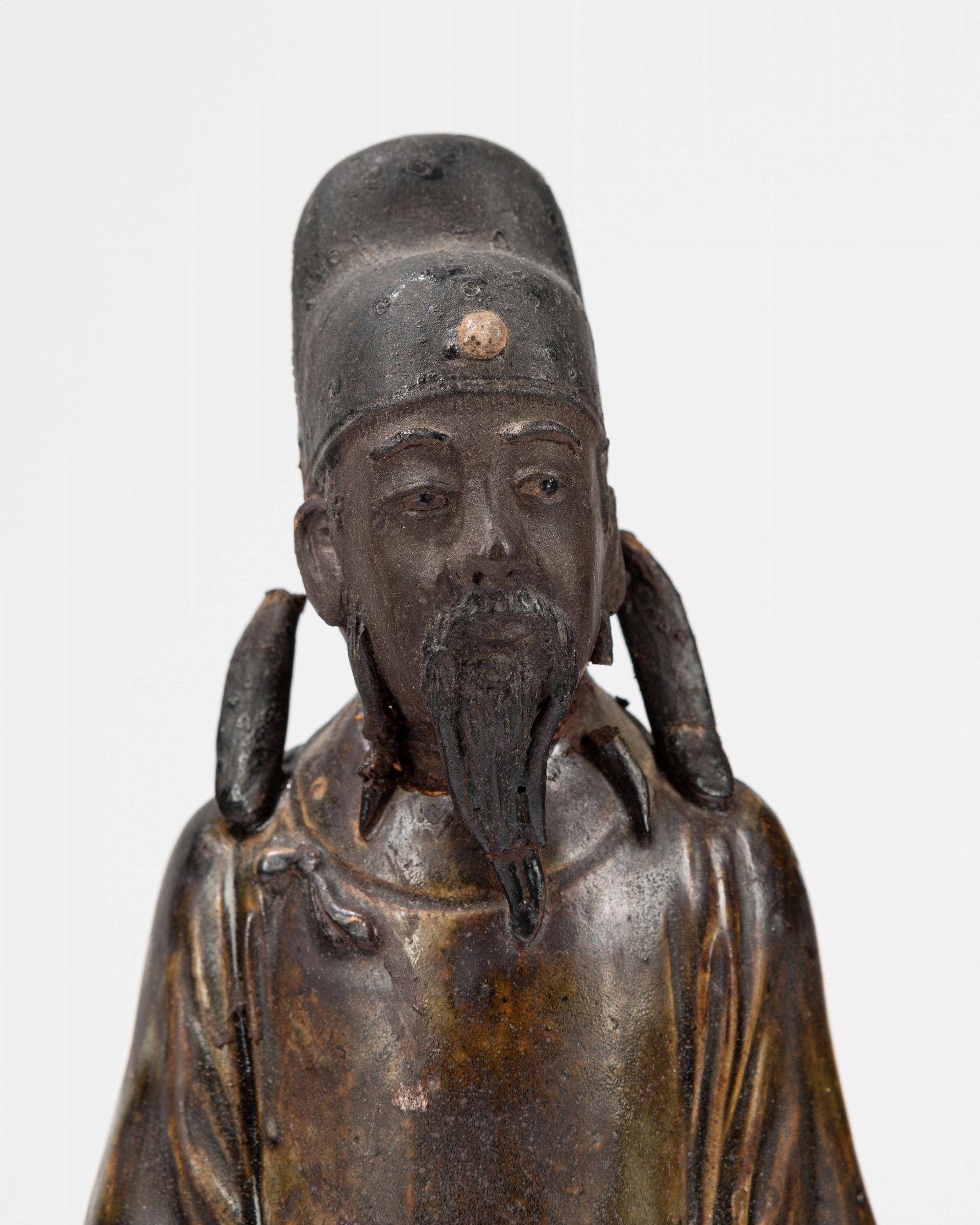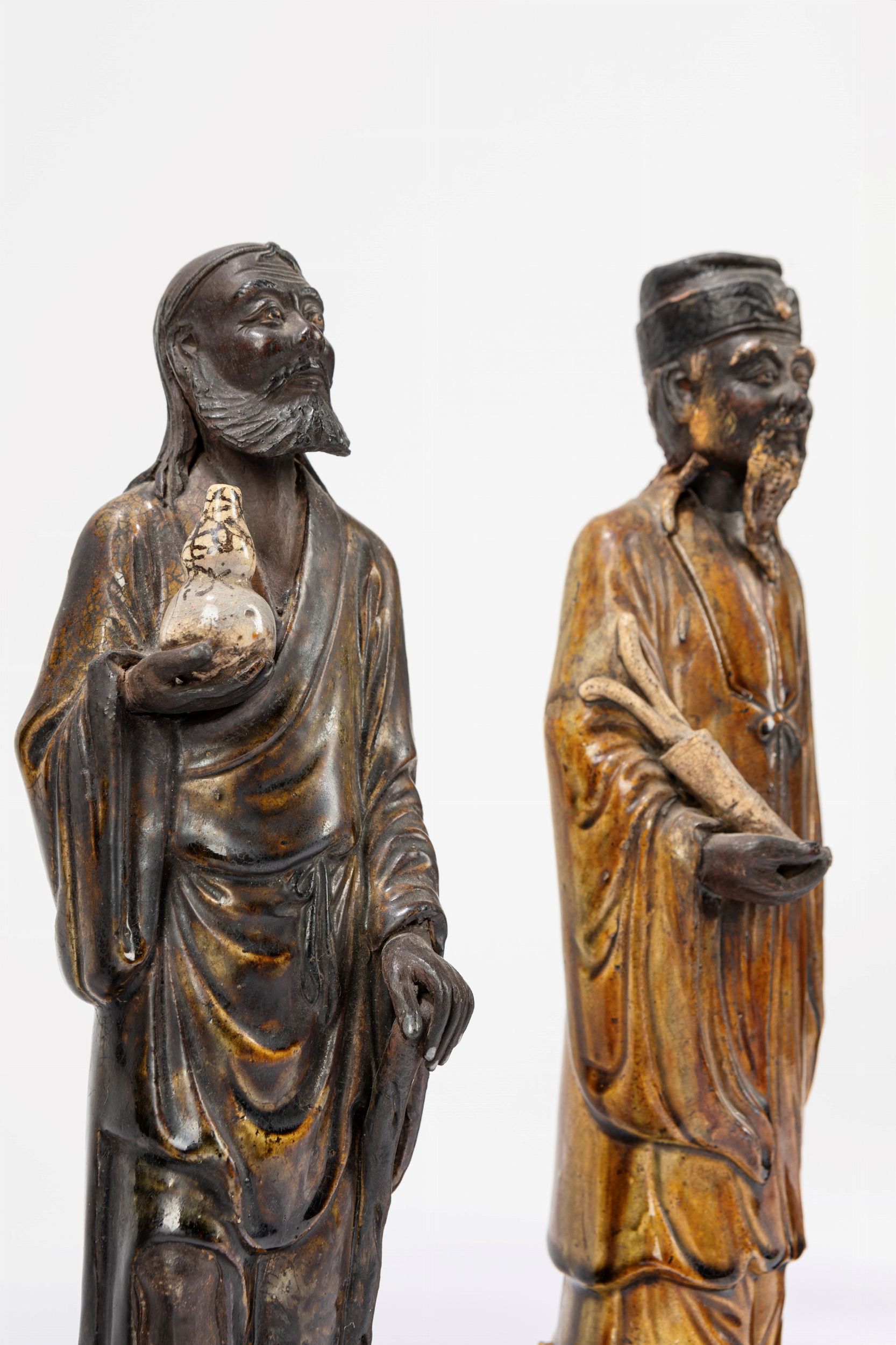 Cina, secolo XIX invetriati e smaltati, raffigurano sei degli Otto Immortali abbigliati nei costumi tradizionali, con basi in legno a finto terreno (difetti) 石湾窑陶瓷凋塑六件,印度,19世纪