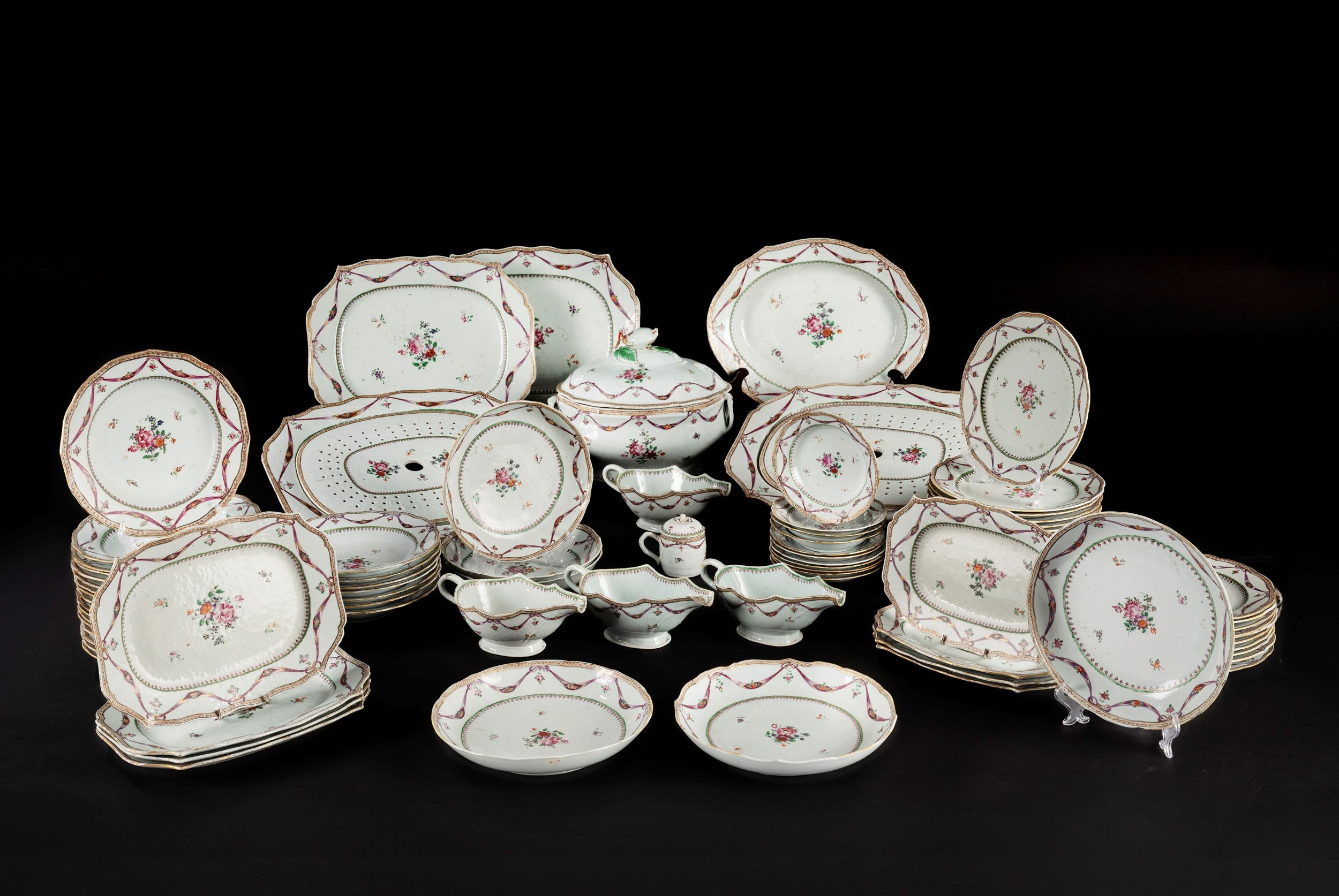 Cina, secolo XVIII composto da 91 pezzi: 1 grande zuppiera ovale con coperchio, 1 piatto fondo per zuppiera, 4 salsiere con manici, 1 mostardiera con coperchio, 29 piatti piani, 24 piatti fondi, 7 piattini da frutta piani, 4 piattini da frutta fondi, 2 grandi piatti da portata, 4 piatti medi da portata, 4 piccoli da portata, 3 piatti fondi da portata, 3 piatti fondi da portata più piccoli, 2 piatti da portata per la carne con 2 interni traforati (difetti e restauri) 出口粉彩陶瓷餐组,中国,十八世纪