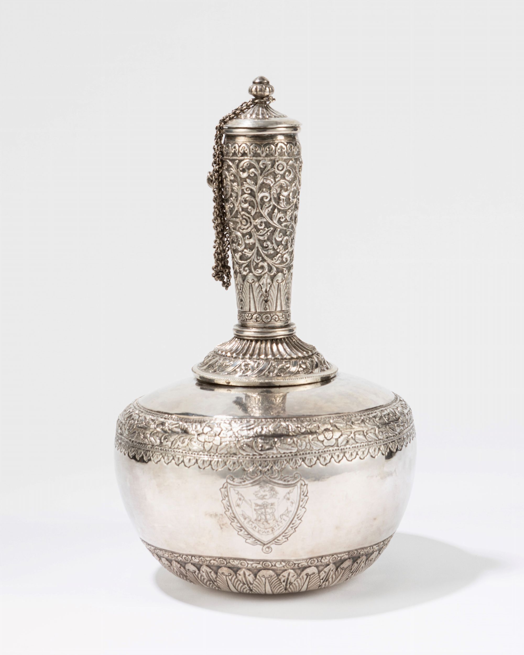 India, fine secolo XIX di forma a bulbo con lungo collo sbalzato, centrato da stemma 'Sarwan State' 银製水器 (surahi),印度,19世纪末