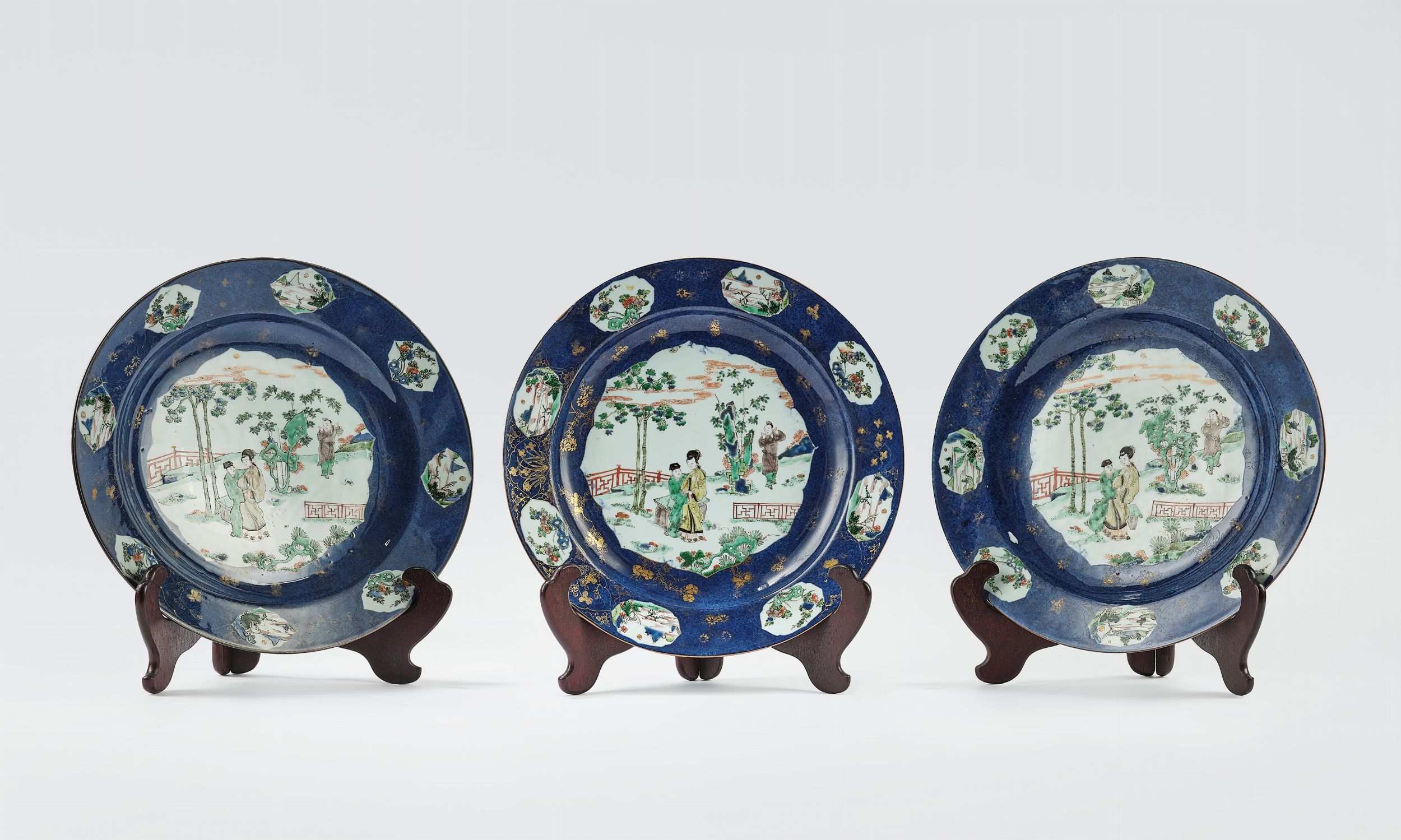 d cm 41 Cina, periodo Kangxi (1661-1722) i lati poco profondi e arrotondati si elevano da un piede corto e affusolato fino ad un ampio bordo svasato, sono ben dipinti all'interno di una riserva ottagonale che raffigura una giovane coppia in un giardino in smalti luminosi color verde, blu rosso e grigio; il bordo è decorato con otto riserve a forma di ruyi che racchiudono scene di paesaggi e di fiori che si alternano; il tutto riservato su un fondo azzurro polvere e dorato a motivi floreali 蓝地粉彩陶瓷大盘三只,中国,清朝康熙时期 (1661-1722)