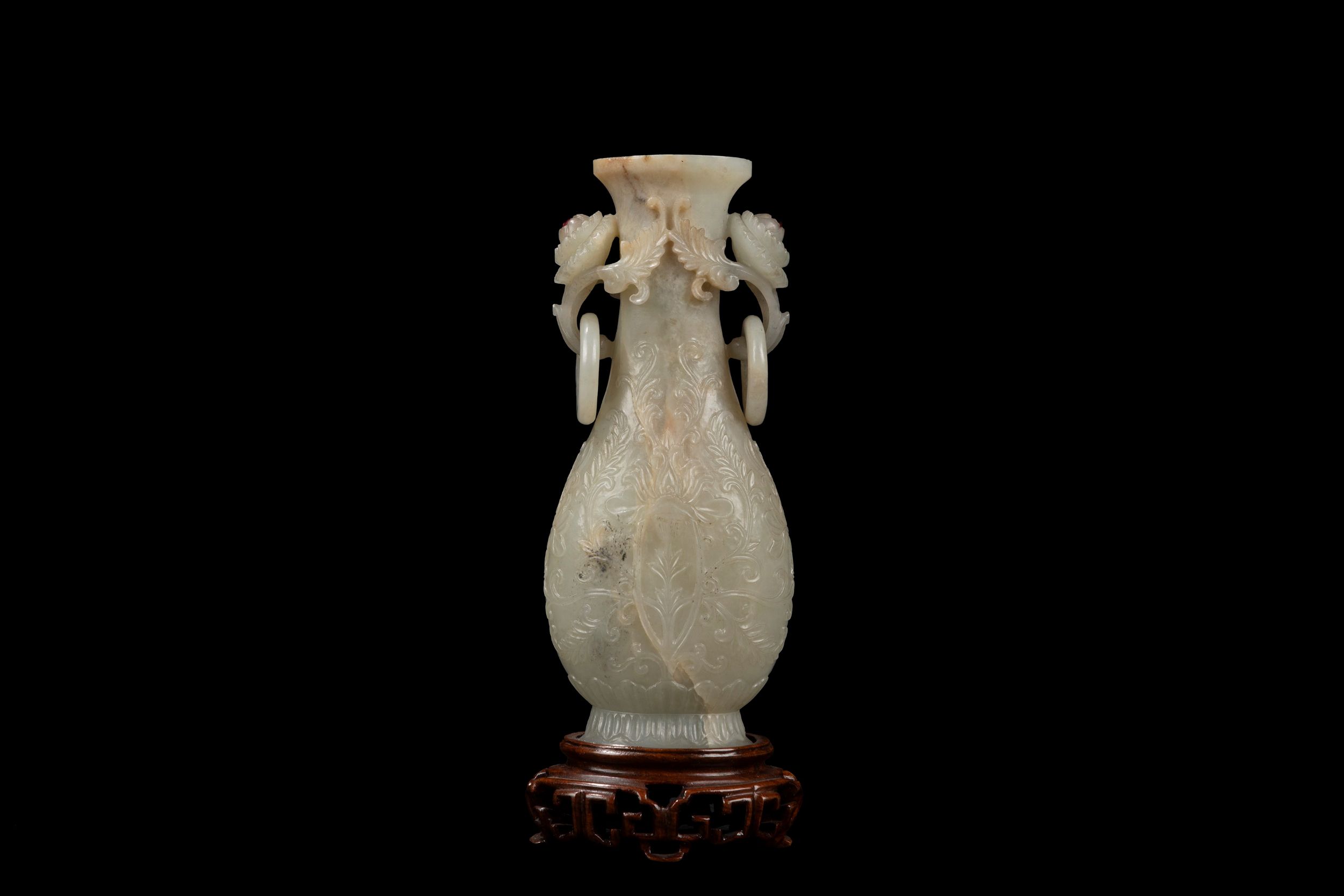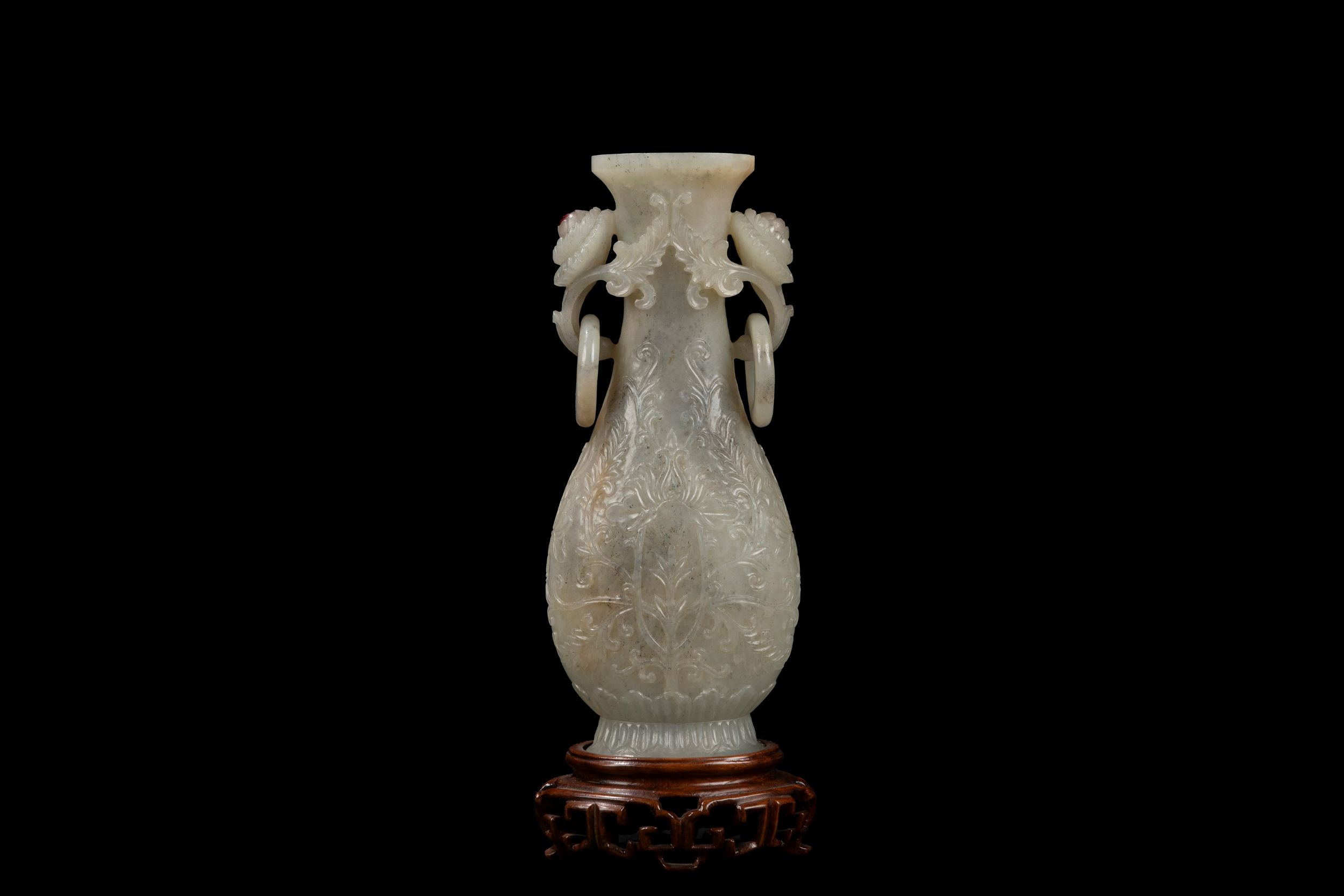 h tot cm 14 Cina, dinastia Qing, XVIII / XIX secolo Il vaso è raffigurato con manici di fiori di peonia che sostengono ciascuno un'ansa ad anello, al centro di ogni manico è incastonato un rubino cabochon. Il corpo presenta disegni a fogliame in stile Mughal 穆格尔式雕刻翡翠花瓶,中国,清朝,19/20 世纪