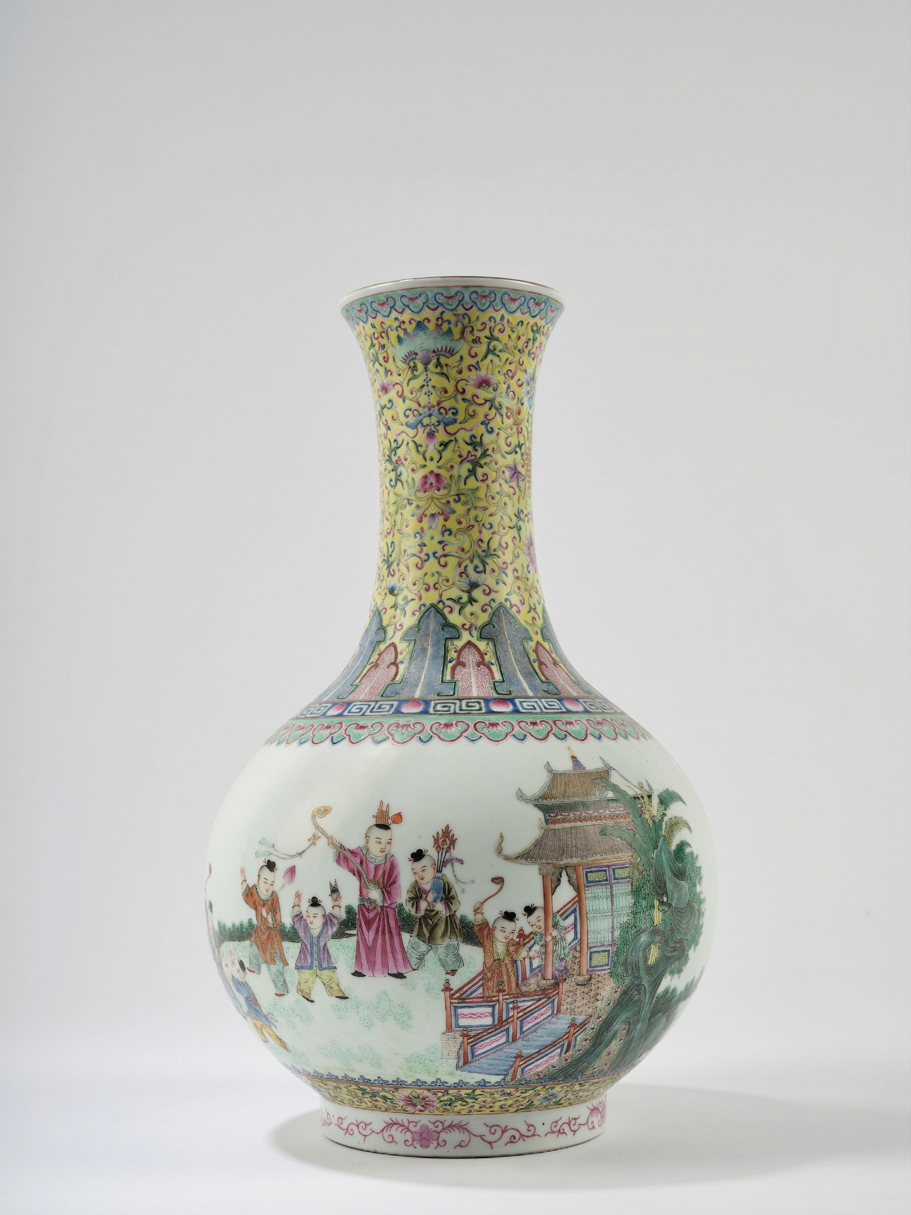 Cina, periodo della Repubblica (1912-1949) dalla forma ovoidale, ben dipinto sul corpo senza soluzione di continuità con nove bambini che giocano in un giardino fiorito con in mano oggetti beneaguranti, il collo dipinto su fondo verde lime con motivi fogliacei, pipistrelli, simboli buddisti e fiori di loto; alla base reca marchio apocrifo Jiaqing 粉彩花瓶,ä¸å›½ï¼Œæ°‘国时期 (1912-1949)