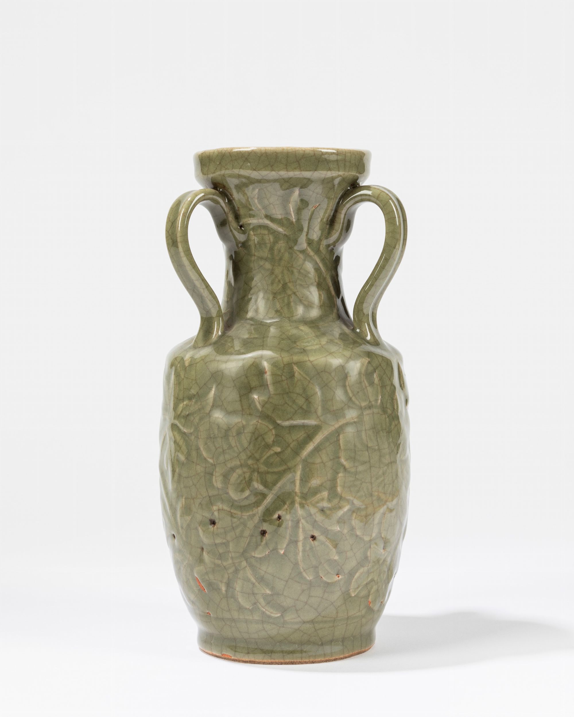Cina, secolo XIX di forma a colonna di balaustra, con tre anse, decorato sul corpo con motivi floreali e fogliacei 龙泉青瓷花瓶,中国,十九世纪