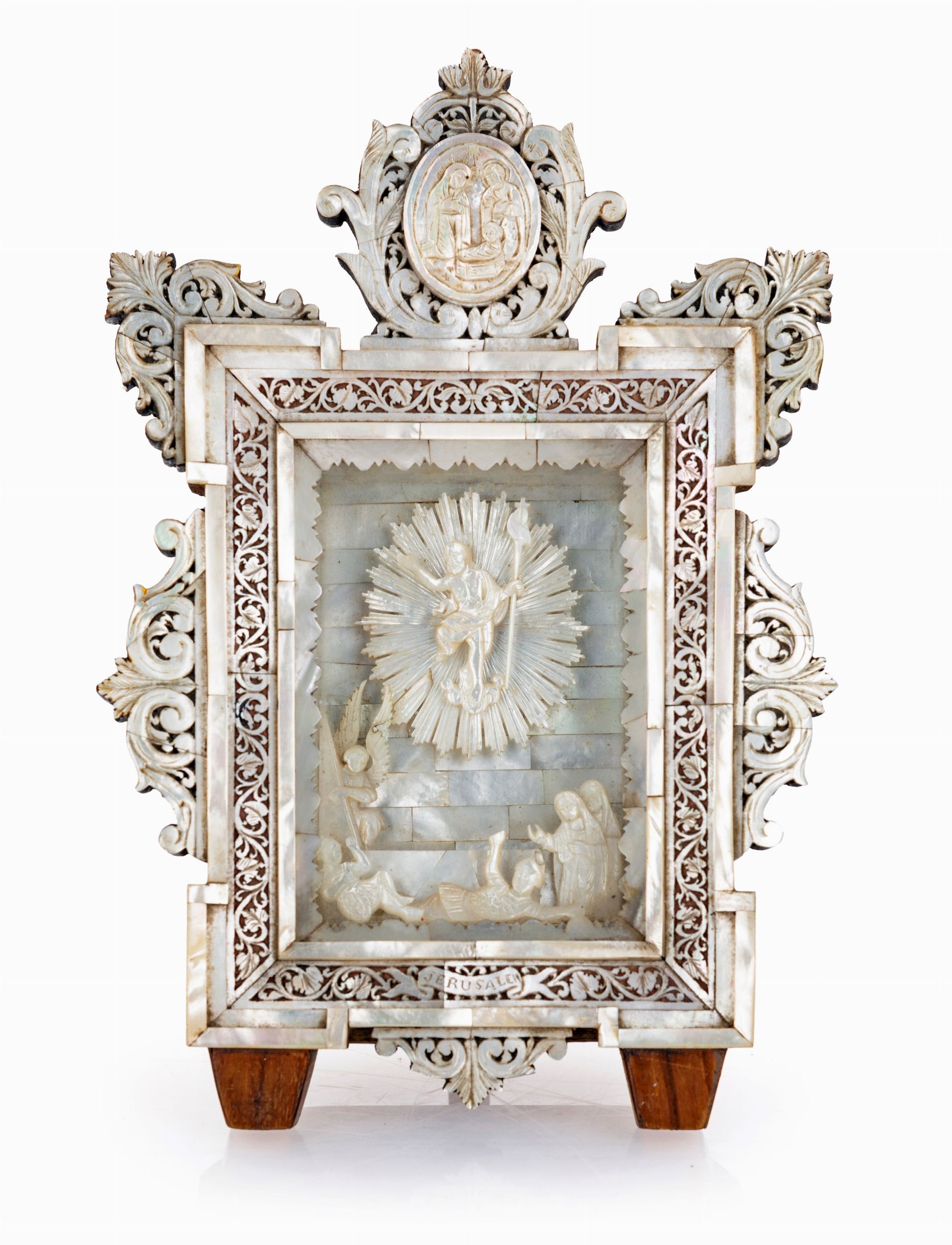 cm 26,5x18x6 raffigurante la resurrezione di Cristo; cornice con angoli cuspidati e fascia percorsa da bordura traforata, sormontata da cimasa con medaglione raffigurante la natività; in basso cartiglio con iscritto 'Jerusalem'