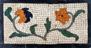 cm 77x130 piano circolare rivestito in pelle rossa, fascia suddivisa in specchiature di cui quattro comprendenti [..]
