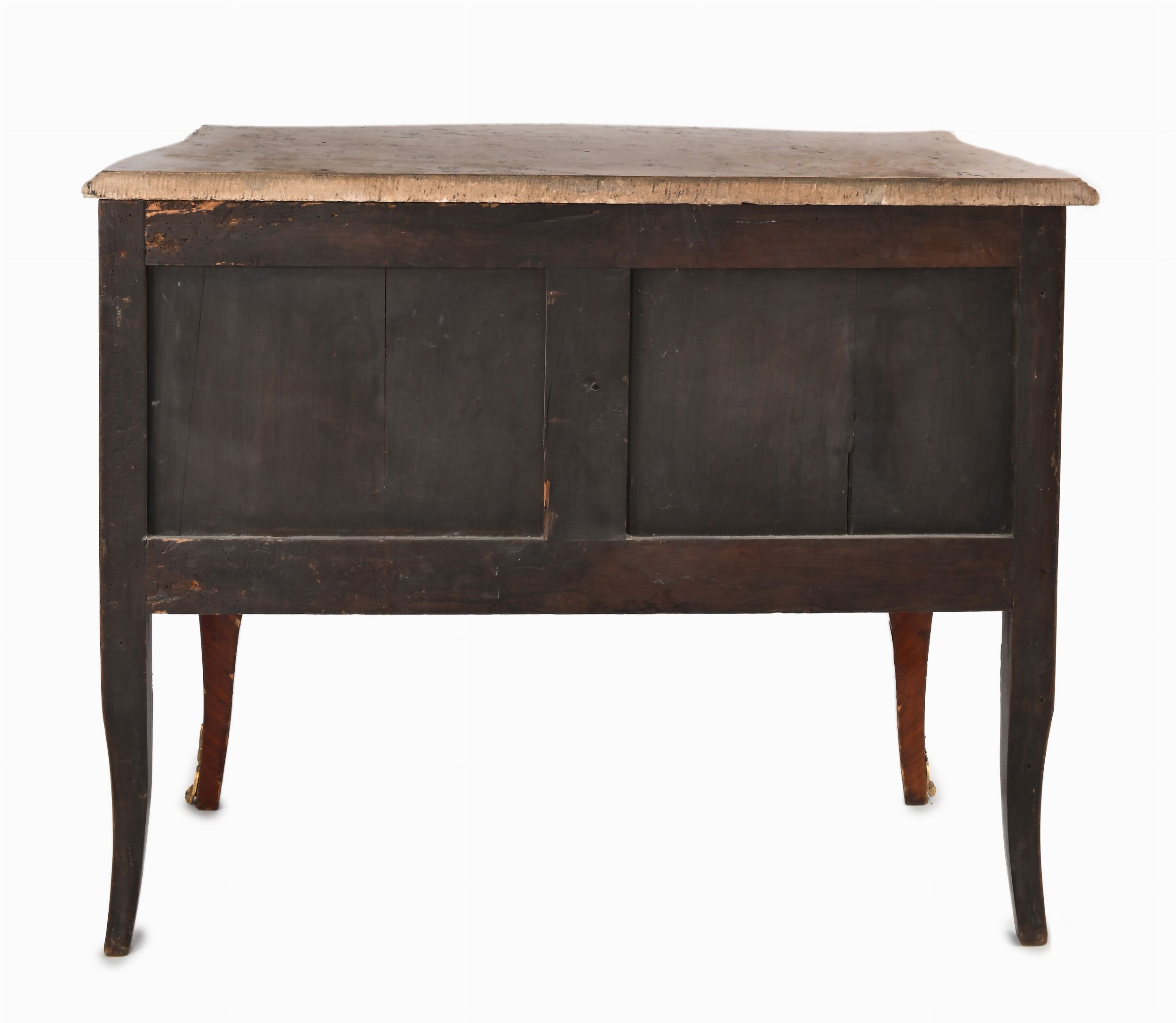 cm 86x108x47 piano sagomato in marmo, facciata lievemente convessa scandita da due cassetti con tralci di fiori intarsiati, bocchette, maiglie e finiture ornamentali in bronzo dorato; gambe sfuggenti