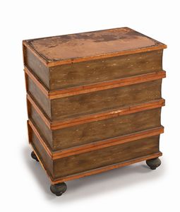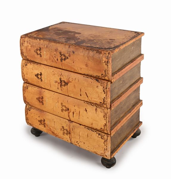 Cassettone simulante libri impilati in legno rivestito in cuoio