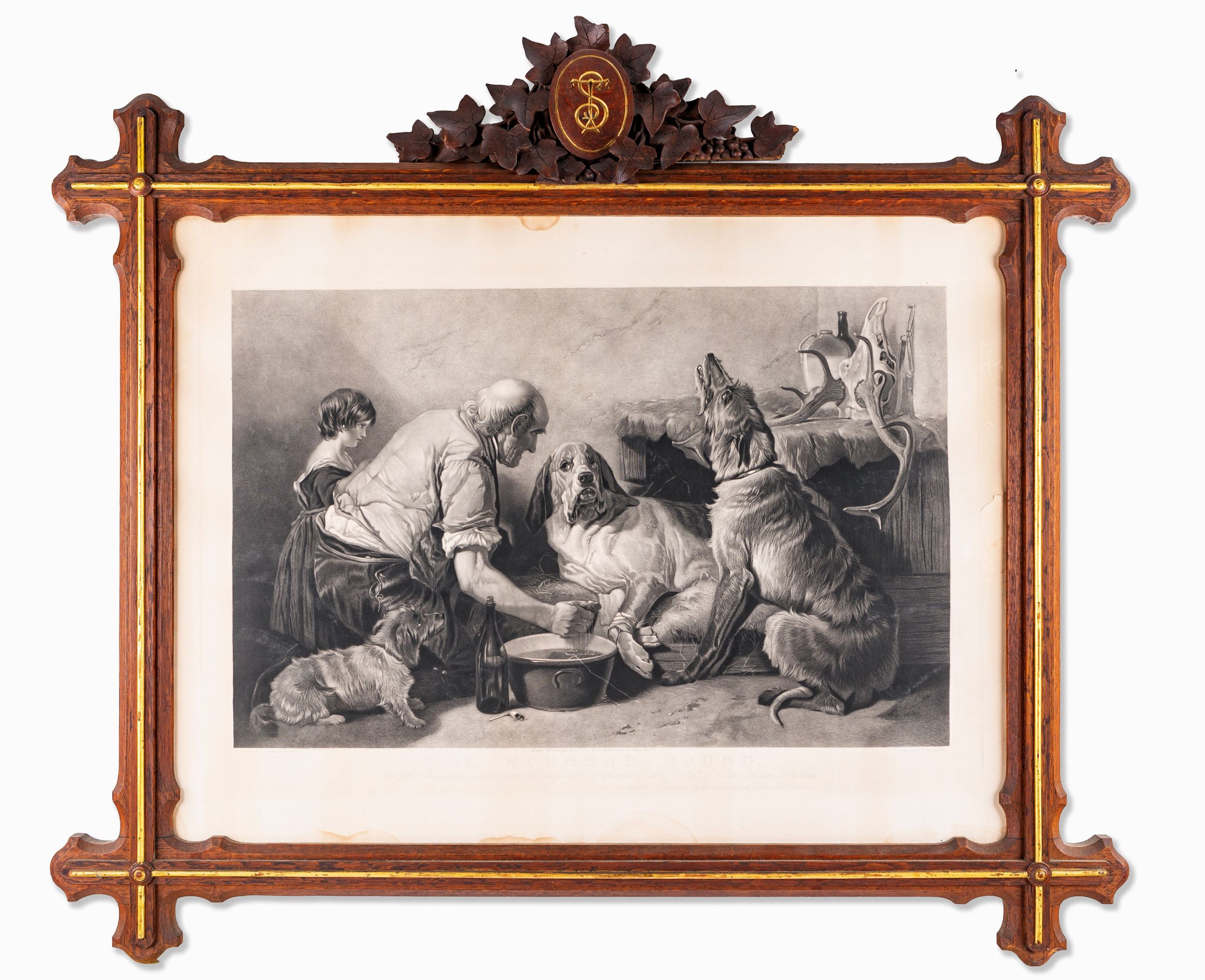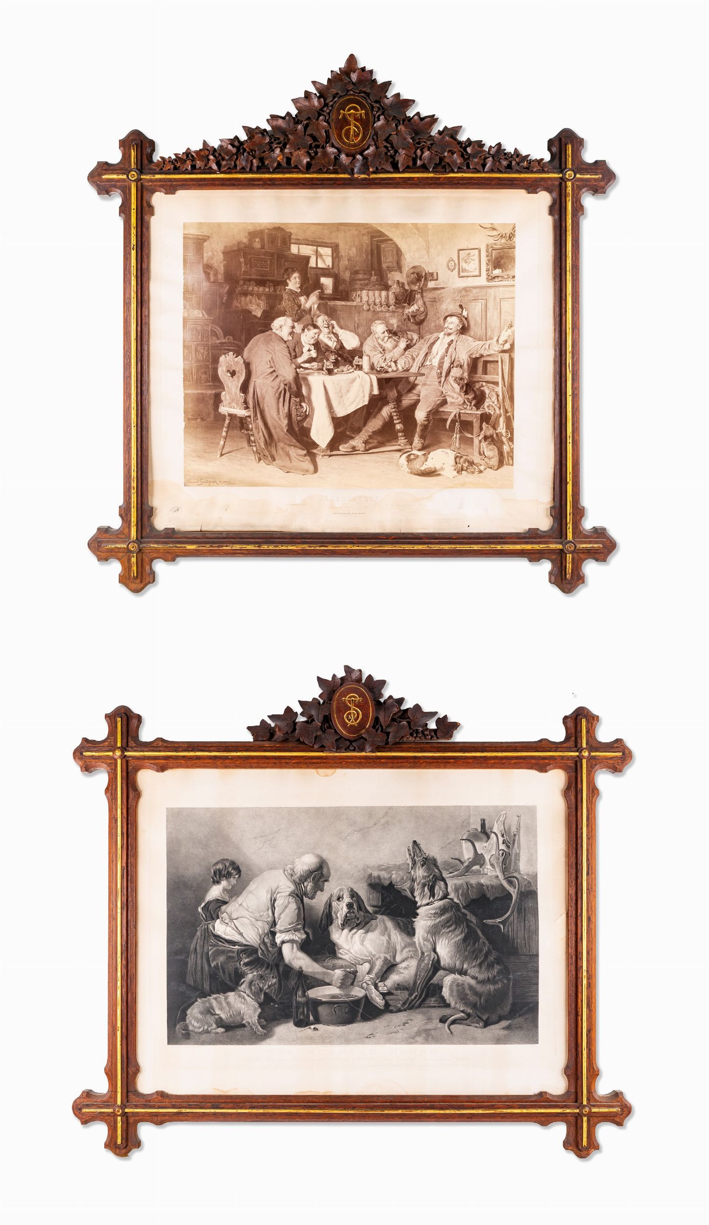 cm 130x127 - luce interna cm 84x98 cimasa in forma di scudo con iniziali ST incise e dorate; all'interno stampe litografiche raffiguranti rispettivamente 'il segugio ferito' (1847) di Richard Ansdell e un 'interno di osteria' da una xilografia di Johannes Burger secondo un dipinto di Eduard Grutzner del 1873