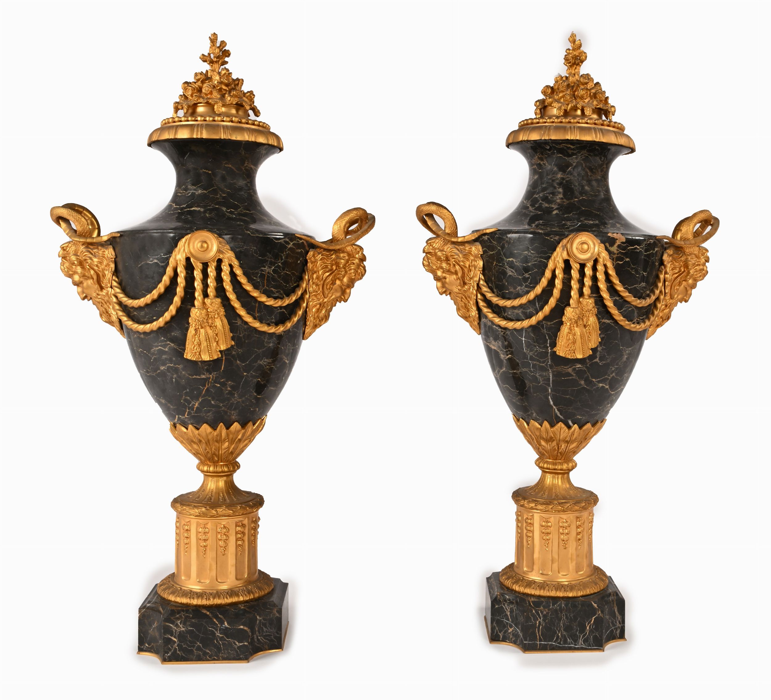 Coppia di grandi vasi ornamentali in marmo portoro e bronzo dorato, XIX secolo
