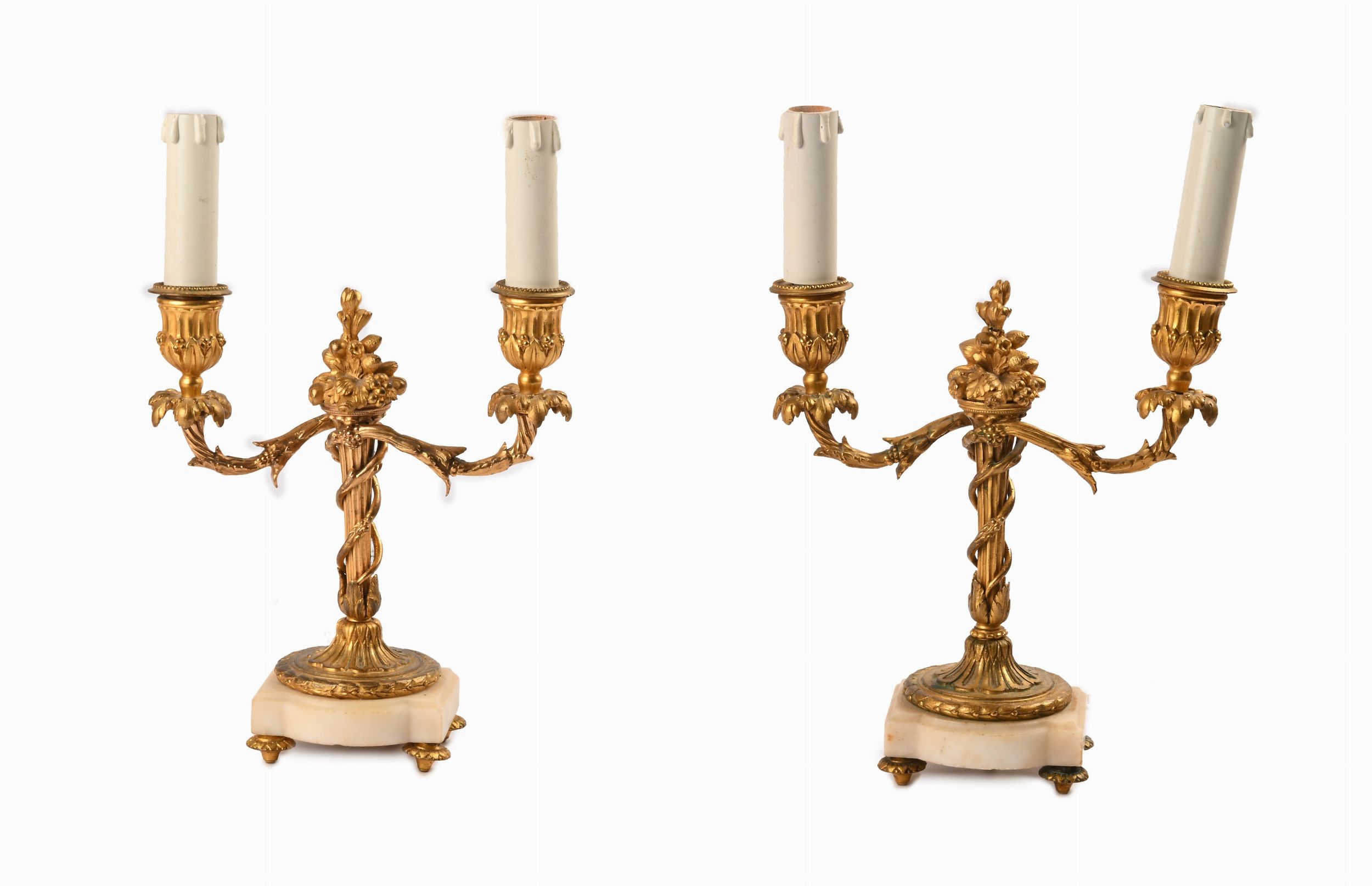 Coppia di lampade in bronzo dorato a due luci, XIX secolo