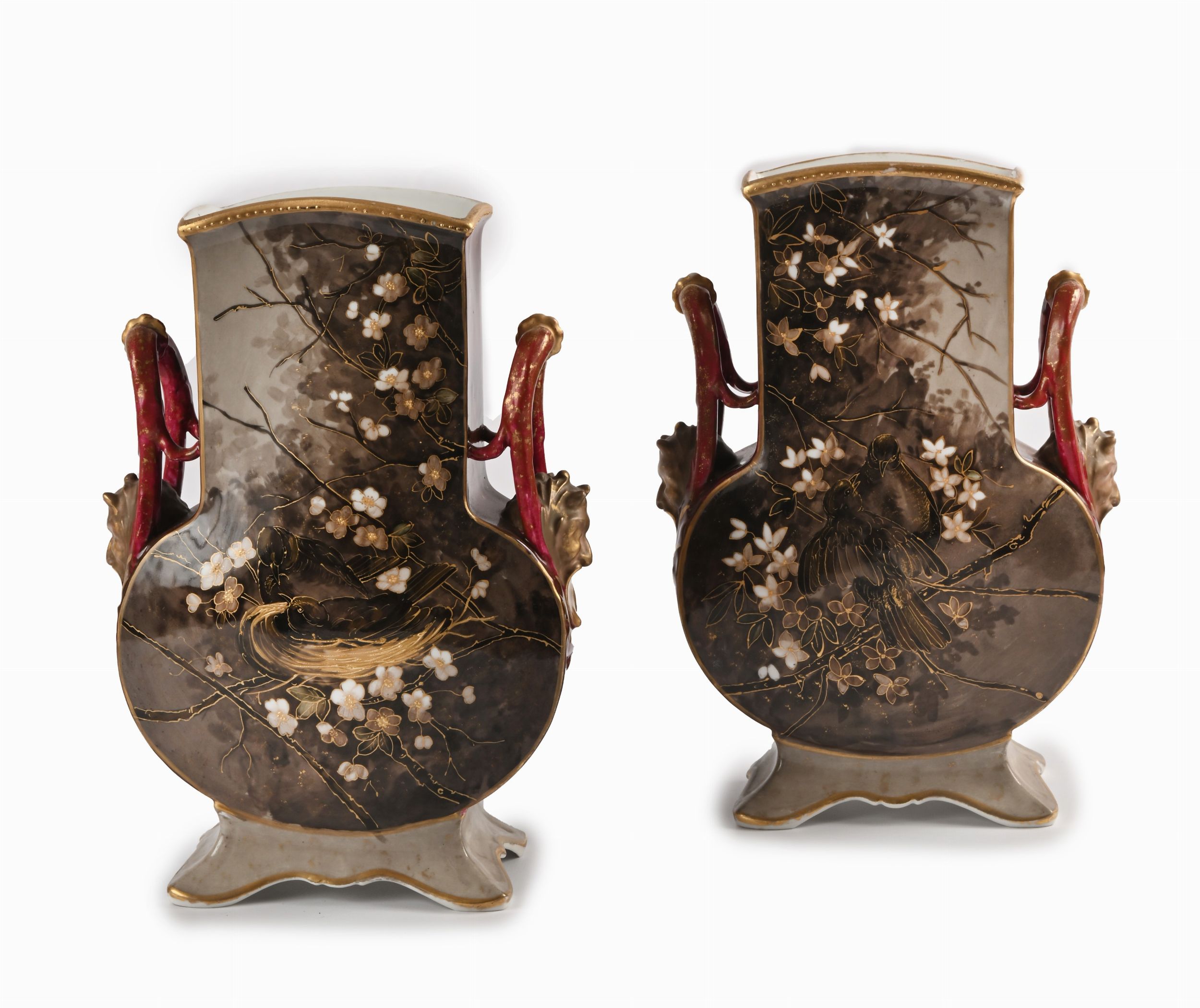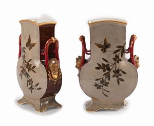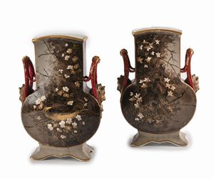 cm 33x22x10 corpo a balaustro schiacciato su base quadrilobata, decorato nei toni del bruno con lumeggiature dorati al recto da figure di volatile e rami di ciliegio ed al verso da un tralcio fiorito con farfalla; anse rosso amaranto che si dipartono da mascheroni plastici. Rotture e mancanze
