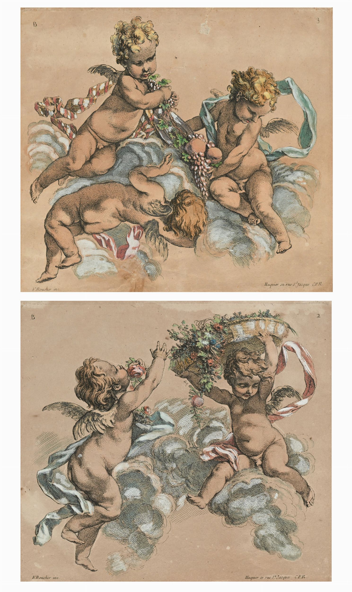 coppia di incisioni acquerellate con interventi di biacca, cm 24x27 - in cornice cm 39x41