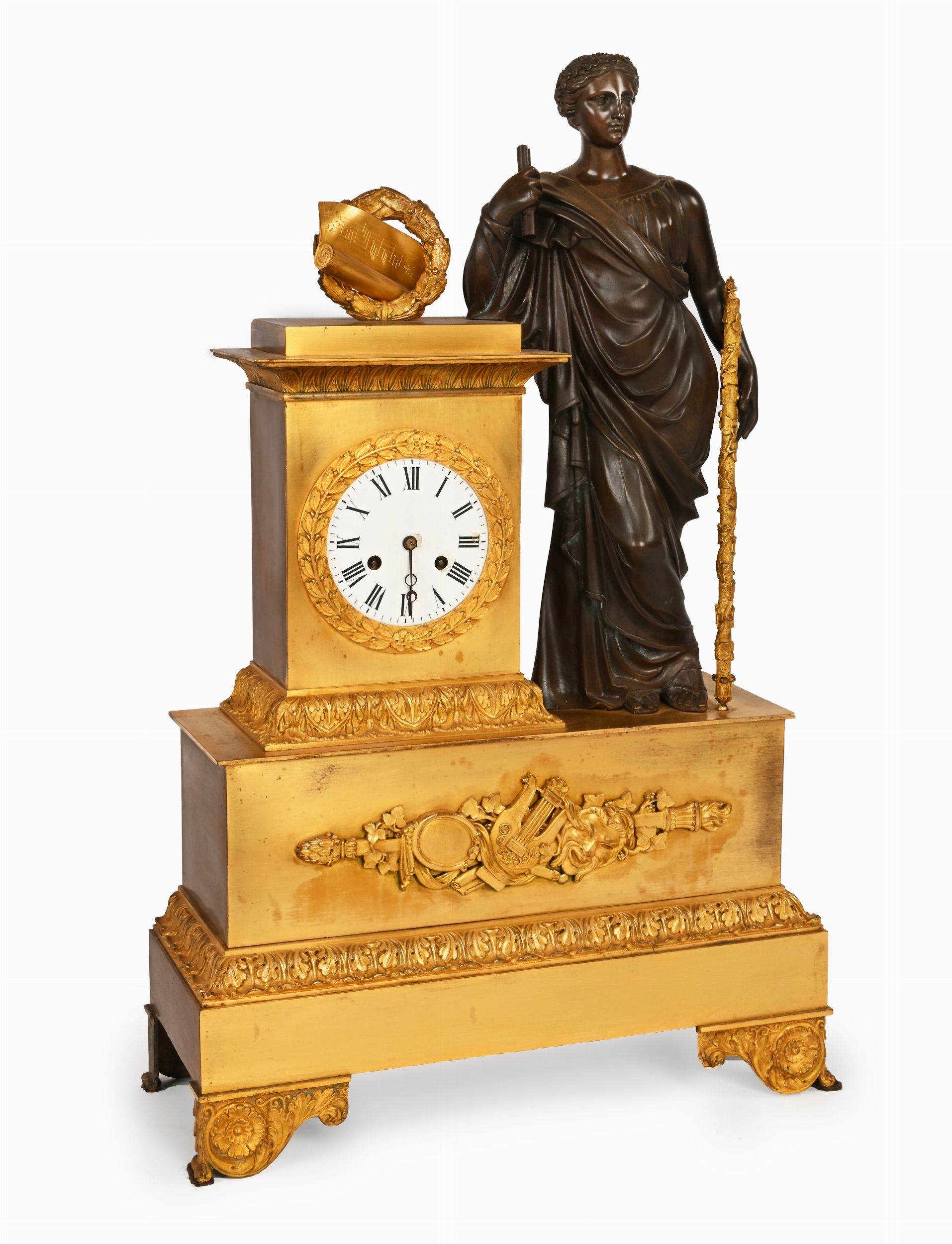 cm 66x41x15 cassa squadrata sormontata da una corona d'alloro che trattiene uno spartito musicale, affiancata da figura di musa; quadrante in smalto bianco a due fori e numeri romani; base rettangolare abbellita da un fregio raffigurante un trofeo degli attributi delle arti