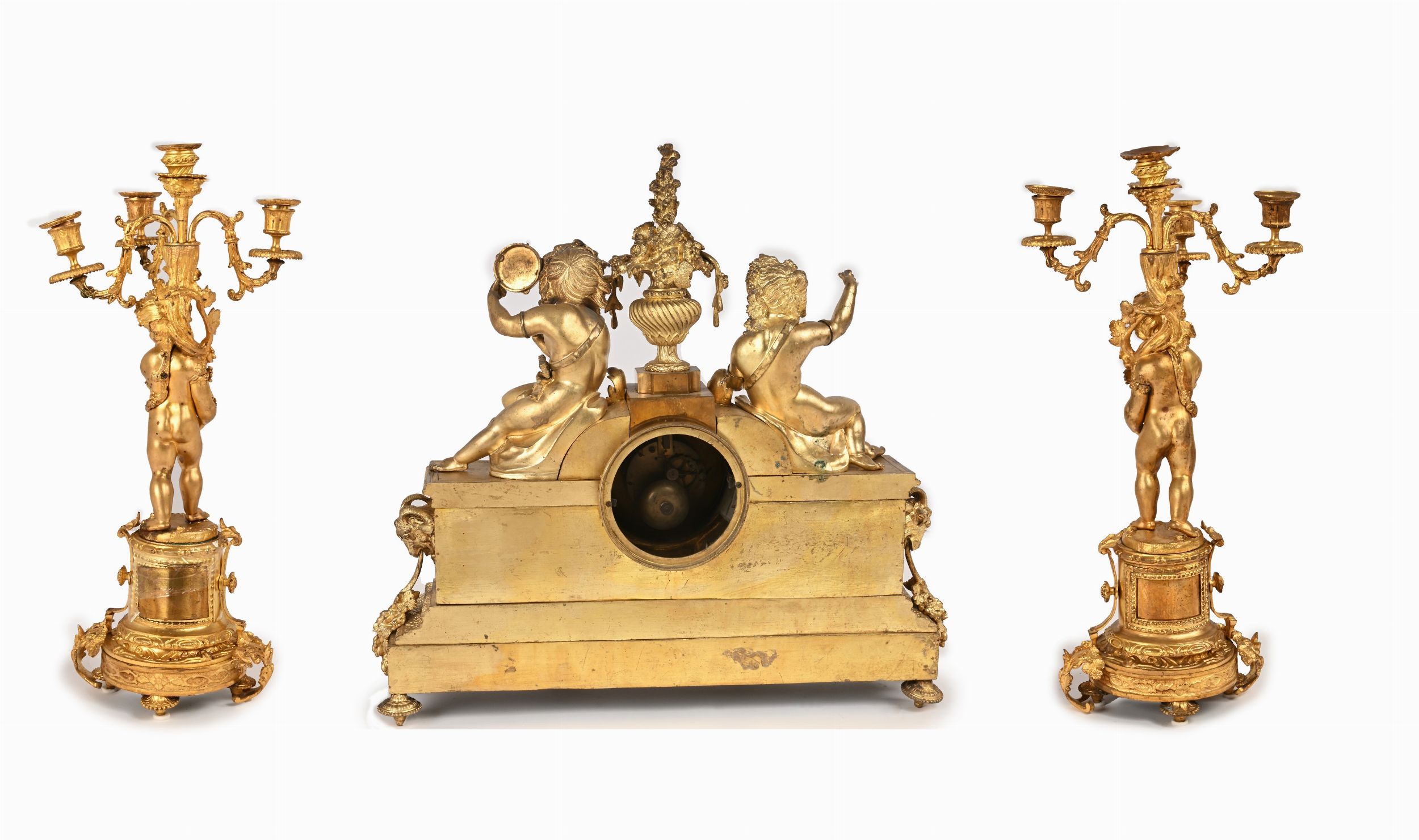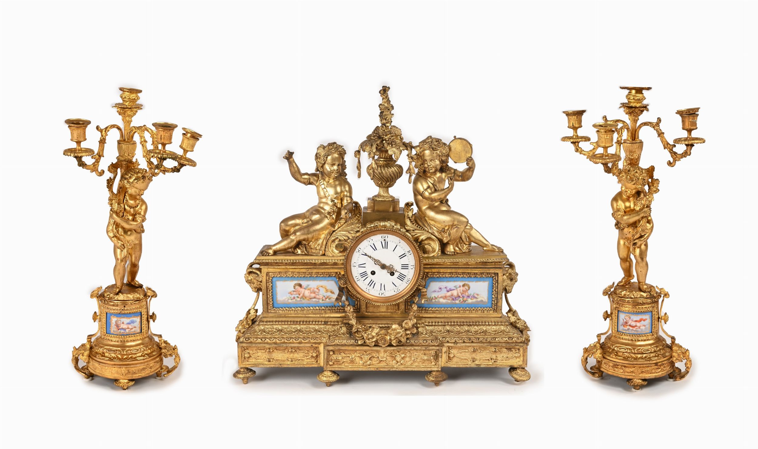 cm 57x60x18 e altezza cm 56 composto da un orologio ed una coppia di candelabri a quattro luci; il primo è caratterizzato da figure di amorino con cimbali e uva fra i capelli posti sulla sommità del basamento decorato da placche in porcellana; al centro quadrante circolare a due fori di carica con indicazione oraria a numeri romani ed arabi per i minuti; i candelabri recano bracci sagomati emergenti da un tralcio di vite sorretto da figura di amorino