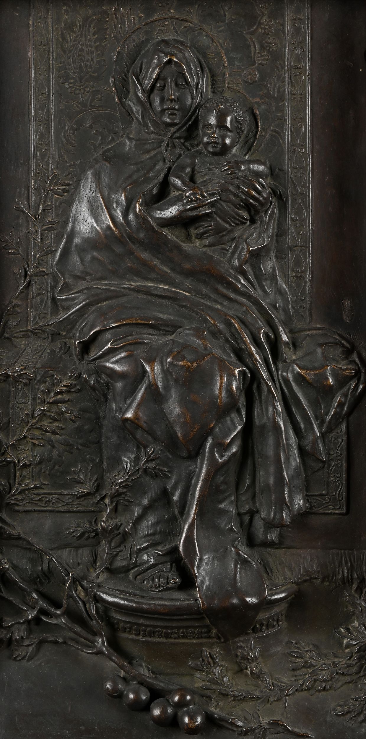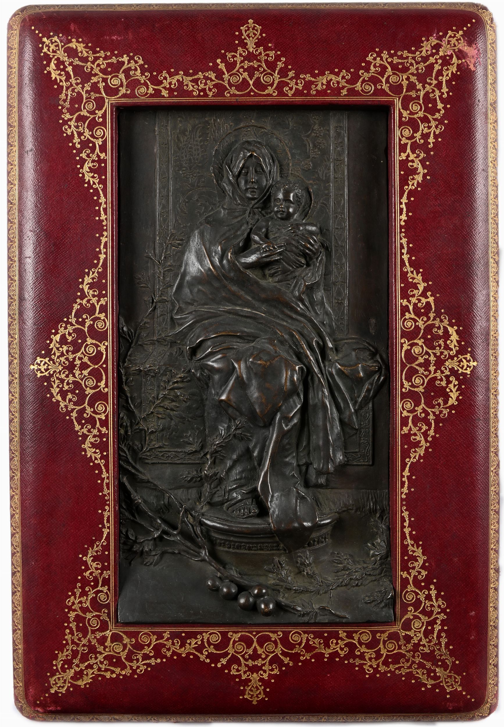 bassorilievo in bronzo Quasi Oliva Speciosa In Campis entro cornice in pelle rossa con decorazione impressa in oro