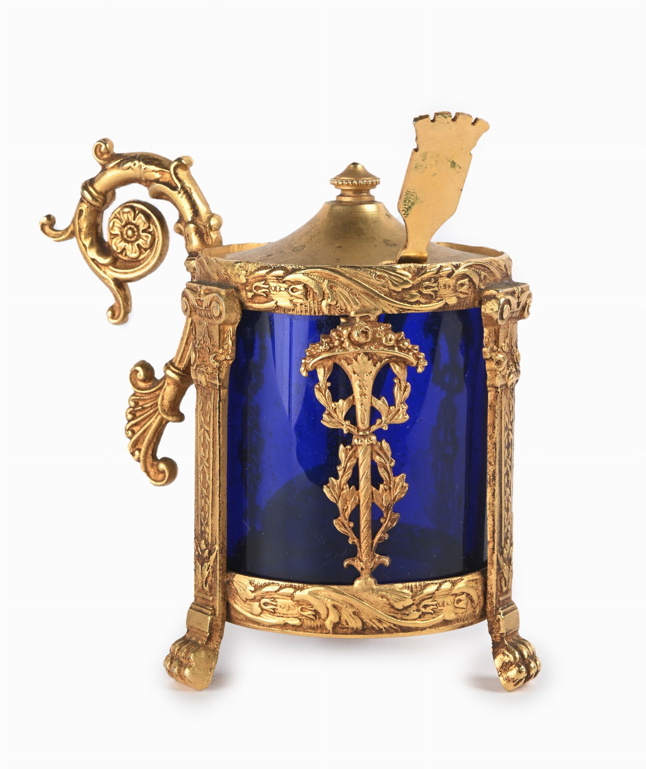 contenitore cilindrico in vetro blu entro struttura costituita da due anelli percorsi da motivi vegetali, riuniti da fregi di gusto Impero arricchiti da rami d'ulivo alternati a tre lesene minuziosamente cesellate terminanti a piede ferino che fungono da sostegno; coperchio a pagoda, manico sagomato con estremità a ricciolo centrato da corolla; completa di cucchiaio con impugnatura dominata da scudo sormontato da corona turrita