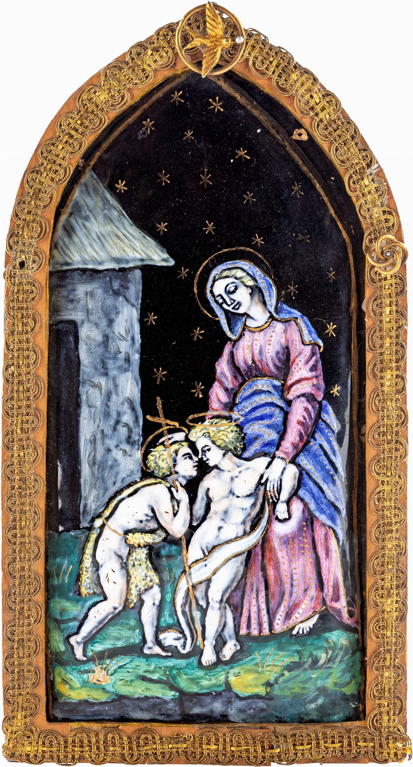 smalti policromi su rame, cm 19,5x10,5 raffigurante Madonna col Bambino e San Giovannino; supporto in legno con profilo percorso da passamaneria dorata e due piccoli ornamenti in metallo a forma di corolla stilizzata e di colomba. Al verso timbro in ceralacca. Lievi difetti