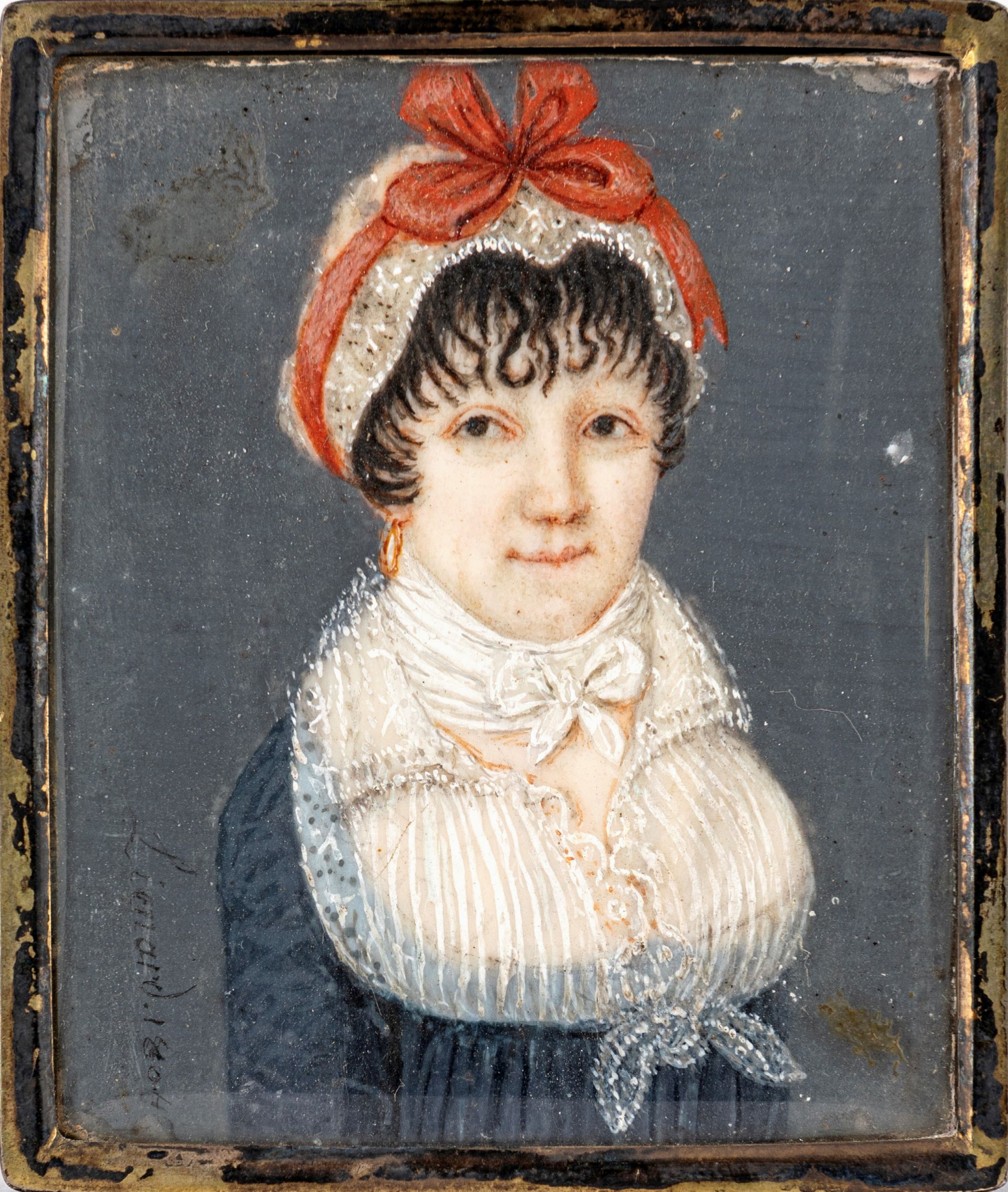 entro medaglione quadrangolare. Firmata e datata in basso a sinistra: Leonard 1804. Al verso monogramma A.W. costituito da capelli intrecciati