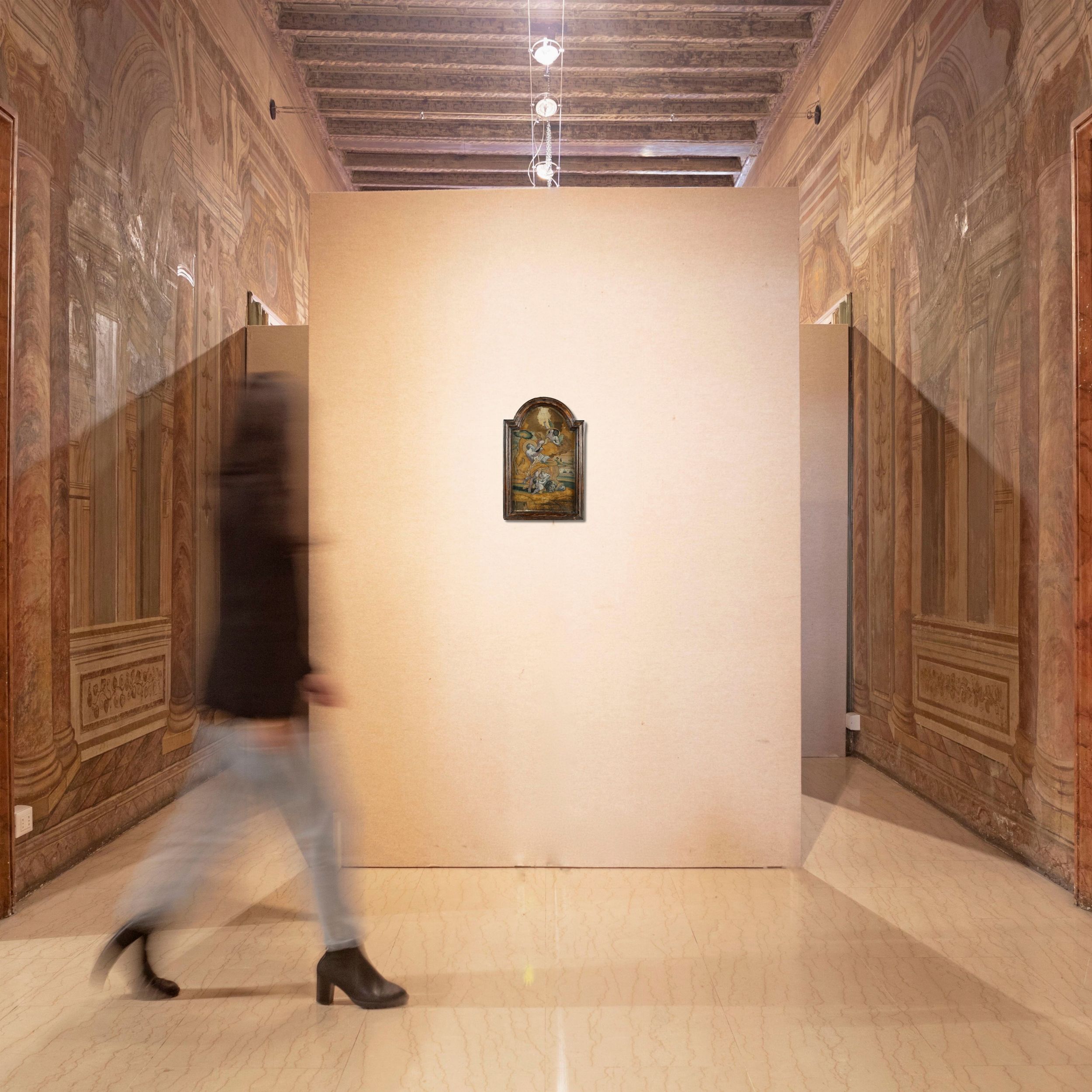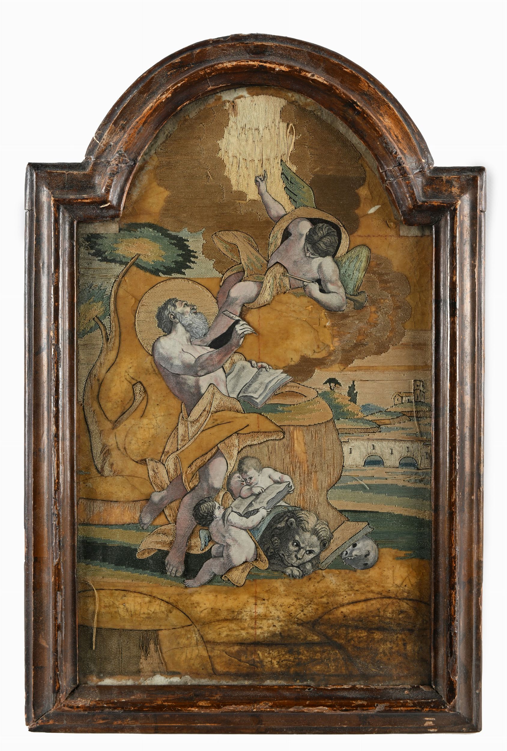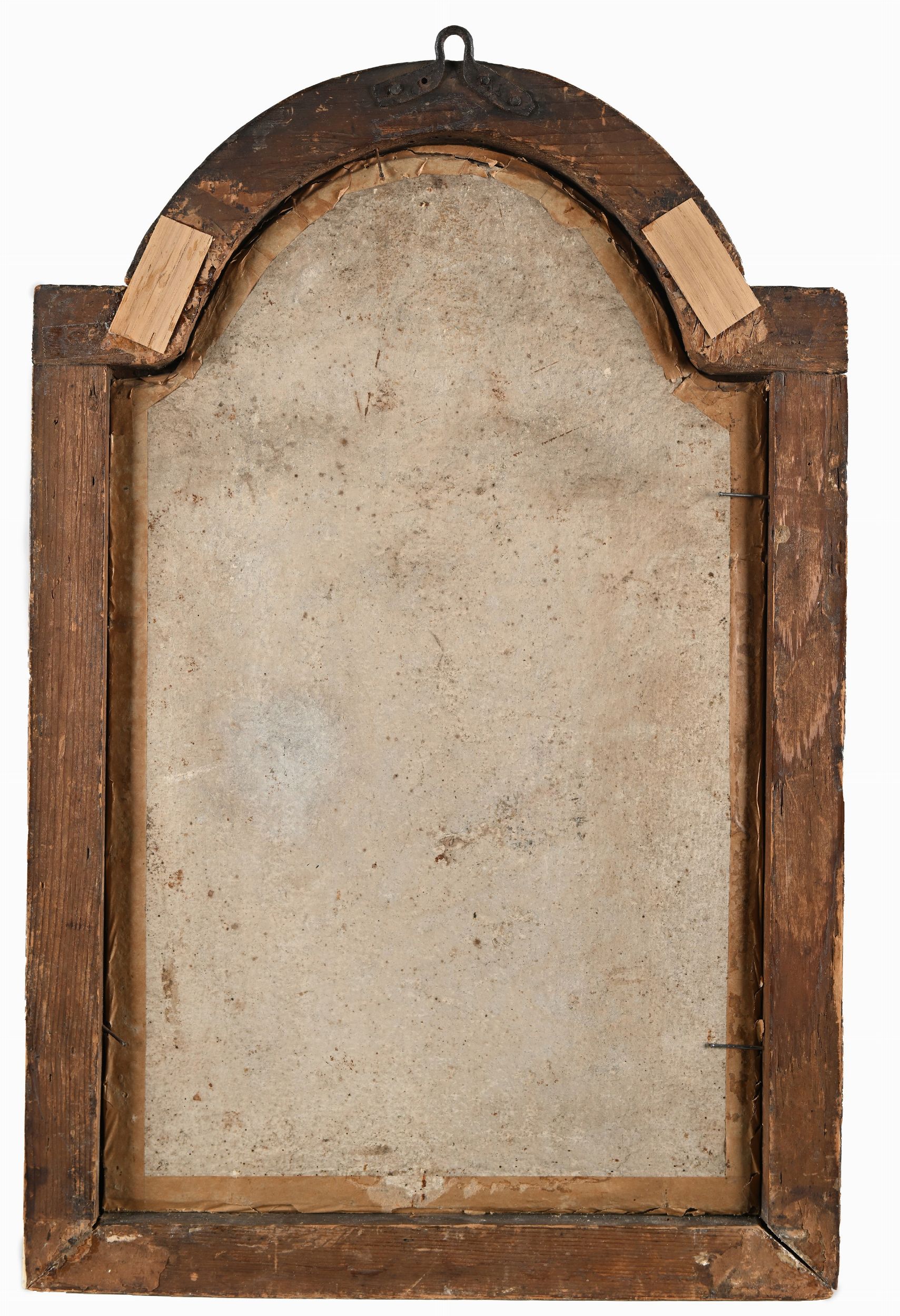 realizzato con fili ocra, gialli e verdi e parti di ritagli di incisioni corrispondenti ai volti, agli arti ed ai tronchi delle figure; cornice modanata in legno con sommità centinata
