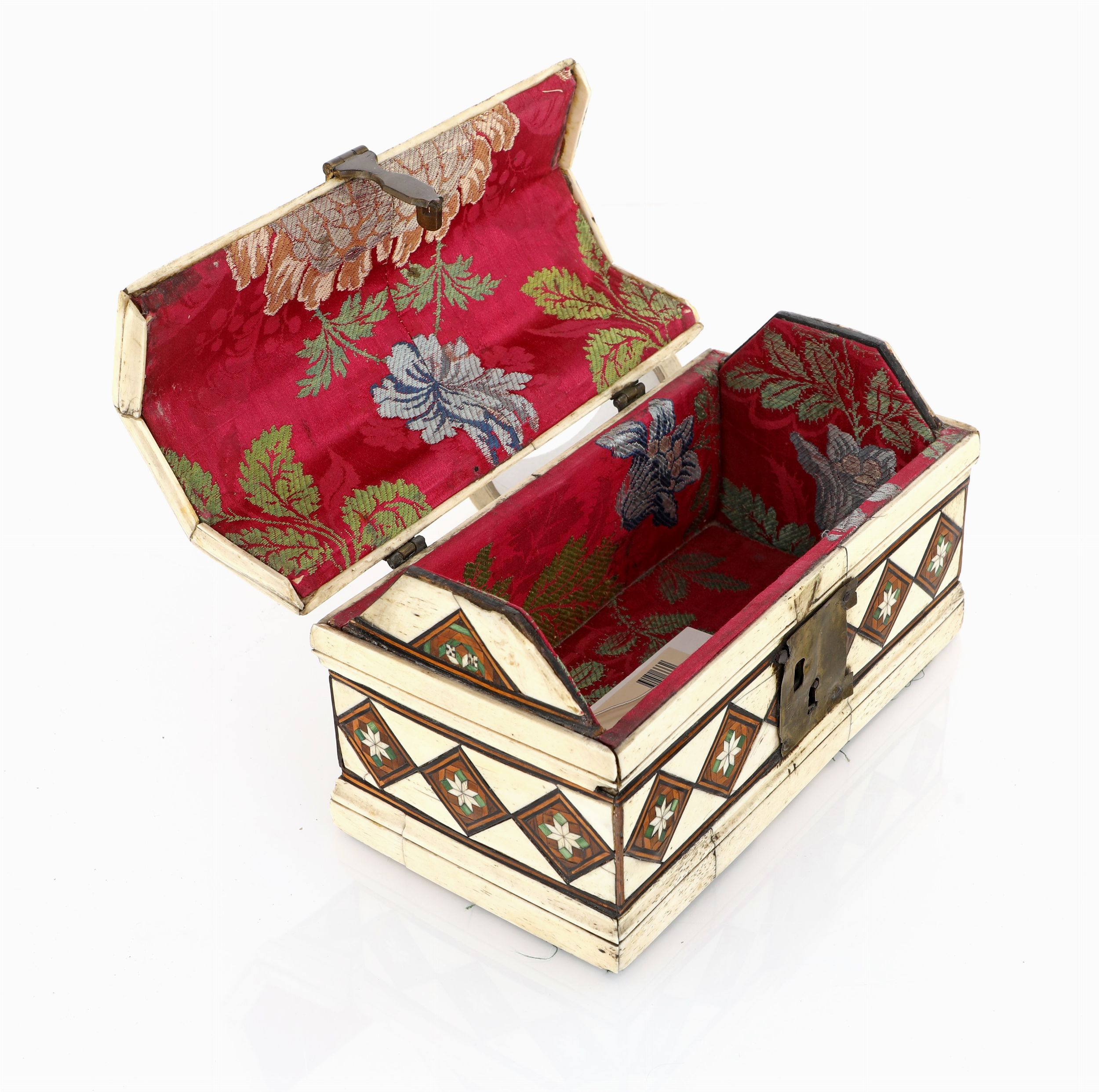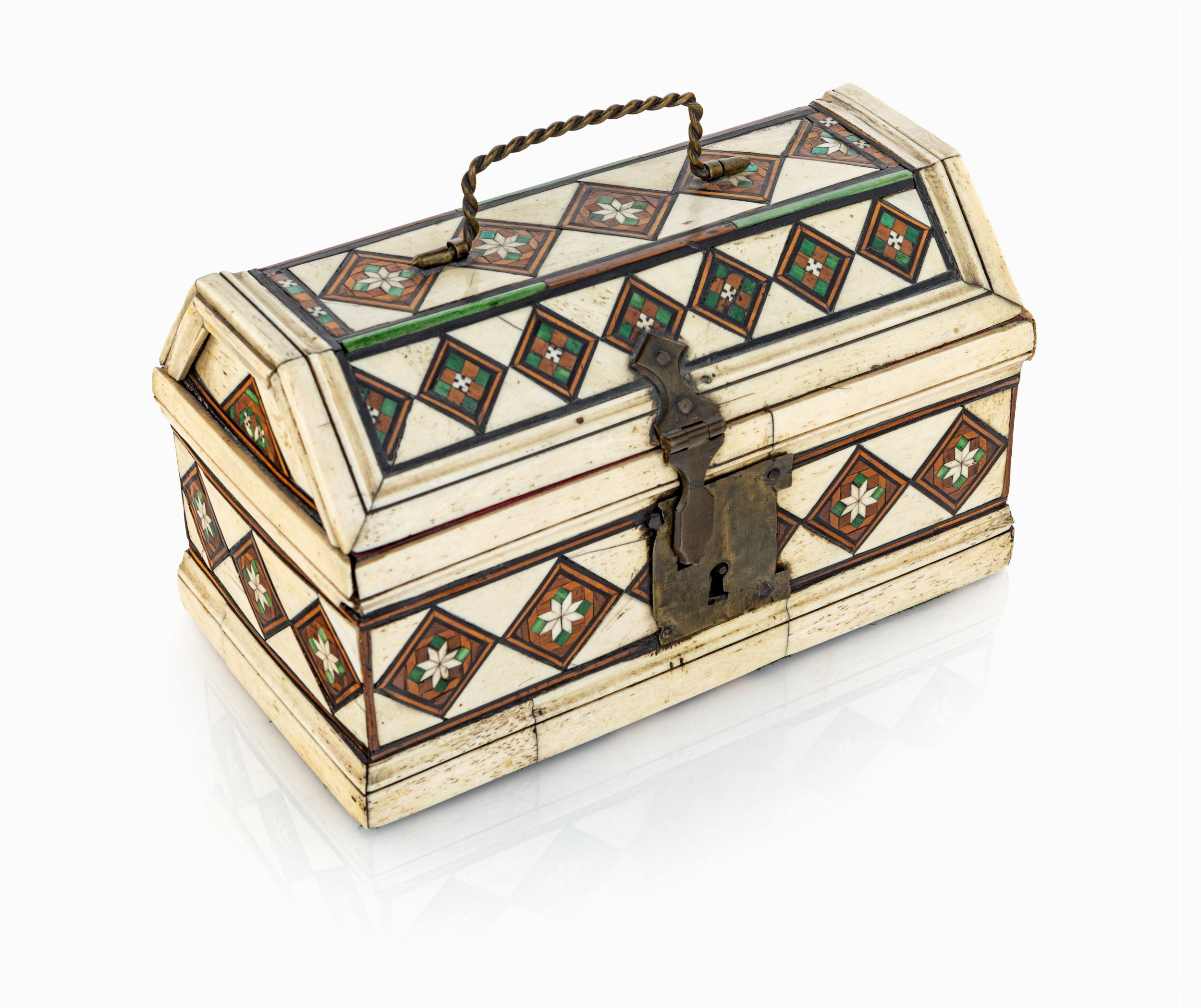 cm 13x22x12 – peso complessivo gr. 834 coperchio ad urna incernierato ed interno rivestito in tessuto. Base intarsiata a motivi geometrici. Maniglia e serratura in bronzo