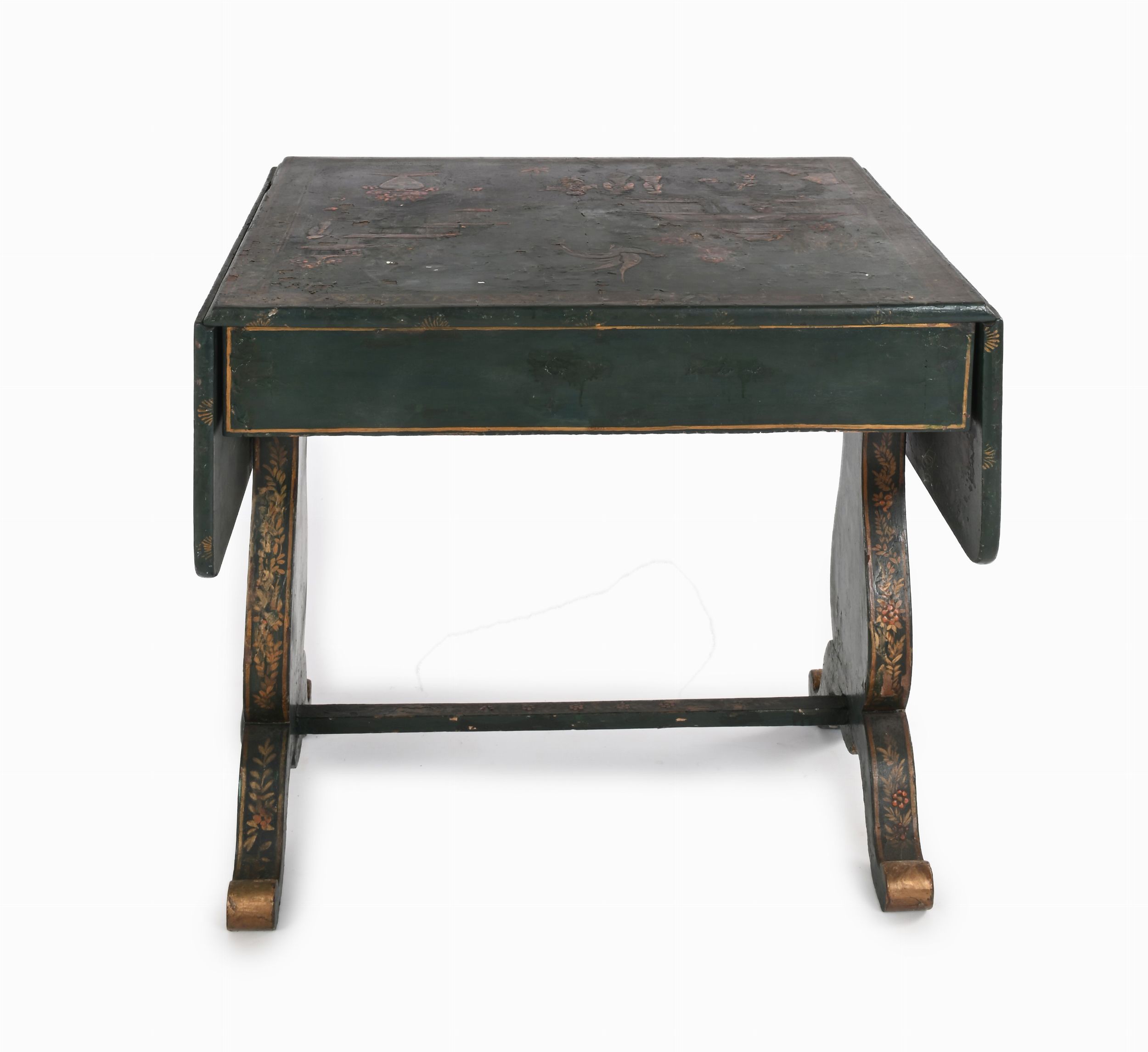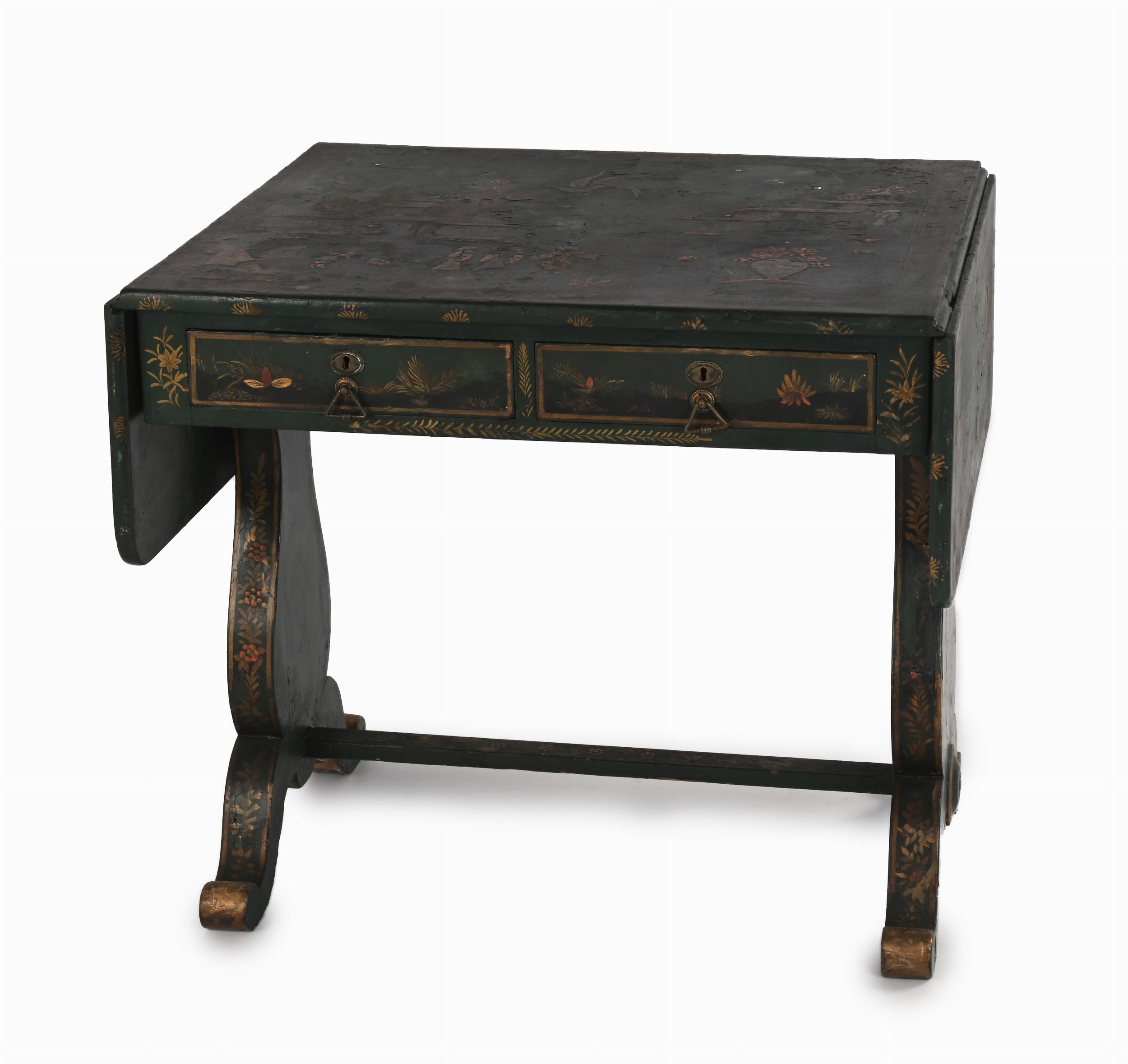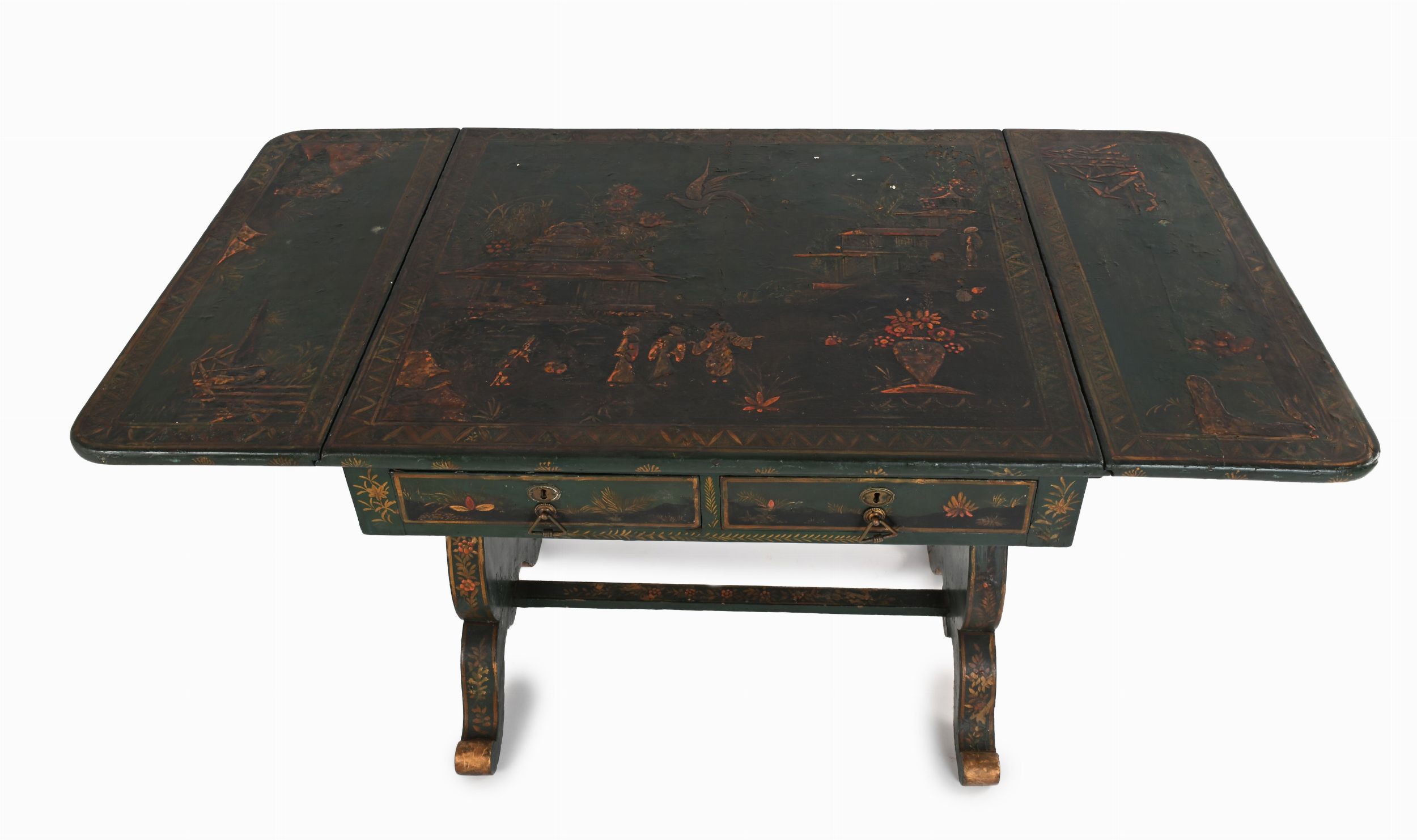 cm 71x78x68 - il piano aperto cm 132 decorato sul piano da un paesaggio arricchito da architetture, personaggi, figure di volatile, motivi vegetali e floreali di gusto orientale; piano rettangolare, due cassetti in linea nella fascia, montanti laterali sagomati riuniti da traversa. Difetti
