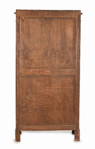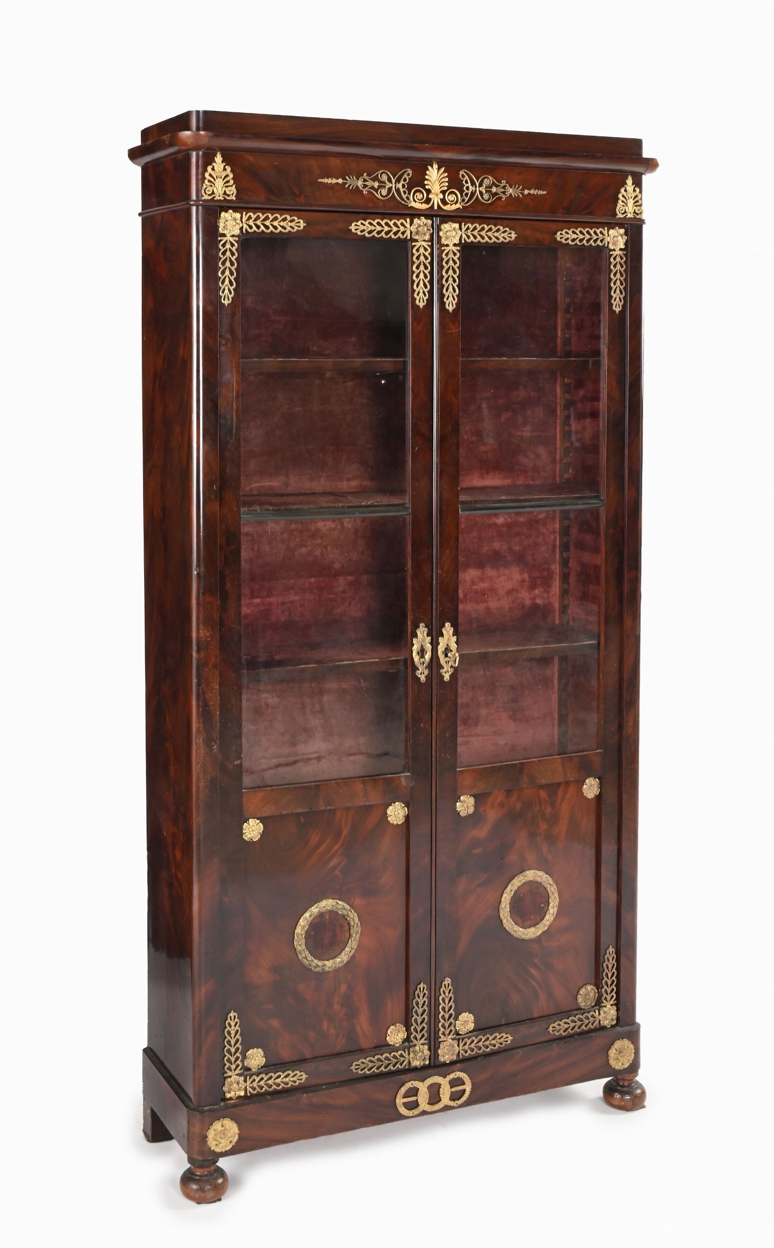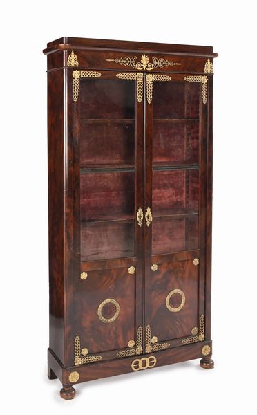 di minute proporzioni con due ante a vetri, è impreziosita da applicazioni in bronzo dorato e poggia su sfere schiacciate