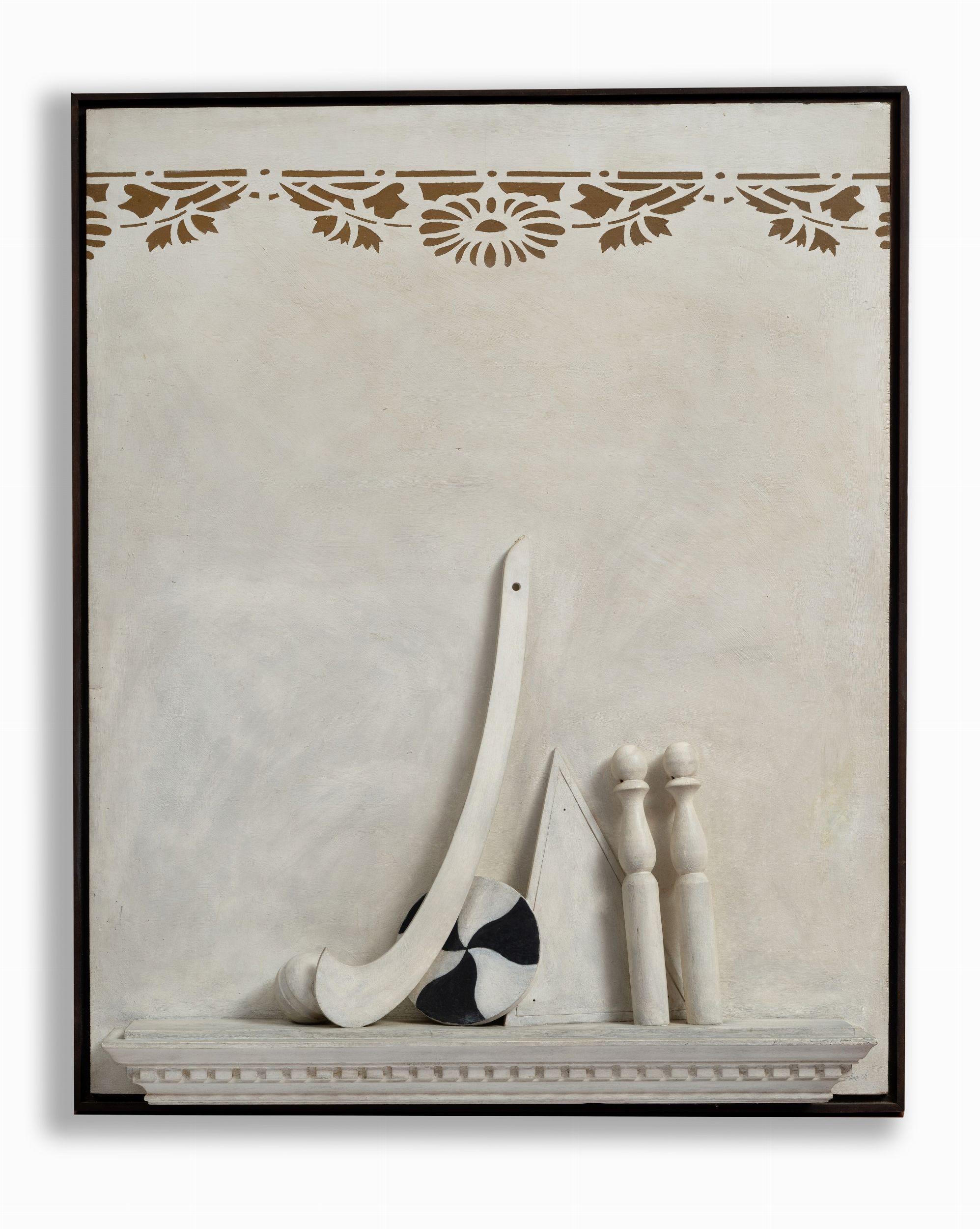 1963 Provenienza: Brerarte srl, Milano; Studio Arti Visive Oggetto srl, Caserta; Salvatore Serio, Napoli (come da timbro sul retro); Collezione B. Luongo, Napoli (come da timbro sul retro); Studio Morra, Napoli; Collezione privata, Napoli Esposizioni: Adami, Del Pezzo, Romagnoni, Galleria La Bussola, Torino, Novembre 1964 (come da etichetta sul retro); pubblicato sul Catalogo della Mostra, a cura della Galleria d'Arte La Bussola, Torino 1964 (illustrato) Opera registrata presso l'Archivio delle opere di Lucio Del Pezzo, a cura della Galleria Vinciana, Milano con il numero 07299 Fotocopia del certificato di archiviazione _ Lucio Del Pezzo (Napoli, 1933) è tra i fondatori del Gruppo 58 e da sempre molto vicino ad altre avanguardie, come il Movimento Nucleare di Enrico Baj, quello Spoor di Monaco, Phases di Parigi e Boa di Buenos Aires. La produzione dell’artista si concentra sull'uso di oggetti comuni che, arricchiti con materiali diversi, superano il confine tra dipinto e scultura e spesso, come nel caso dell’opera del 1963 qui presentata, richiamano i paesaggi metafisici di de Chirico o le nature morte di Morandi. Registrata presso l’archivio dell’artista, l’opera si compone di un olio con rilievi in legno armonicamente disposti su tavola all’interno di una teca in plexiglass. Apparentemente semplici e intuitive, le opere di Del Pezzo sono in realtà complesse e piene di contrasti, ridondanti di simboli, segni e forme disparate e ricorrenti. Il linguaggio unico attraverso il quale si esprime l'immaginazione dell’artista appare sempre in bilico tra spirito metafisico ed elementi ludici. (Tratto dalla biografia dell’artista a cura della Fondazione Marconi, Milano). Nel 1967 Pierre Restany scriveva: «I rilievi di Del Pezzo sono extra-dimensionali, sono delle note tolte al diapason dello spazio. La nostra epoca ha bisogno di una nuova preziosità che non corrisponde a un lusso del raffinamento ma a un’immagine indispensabile del linguaggio, a una profilassi della visione».