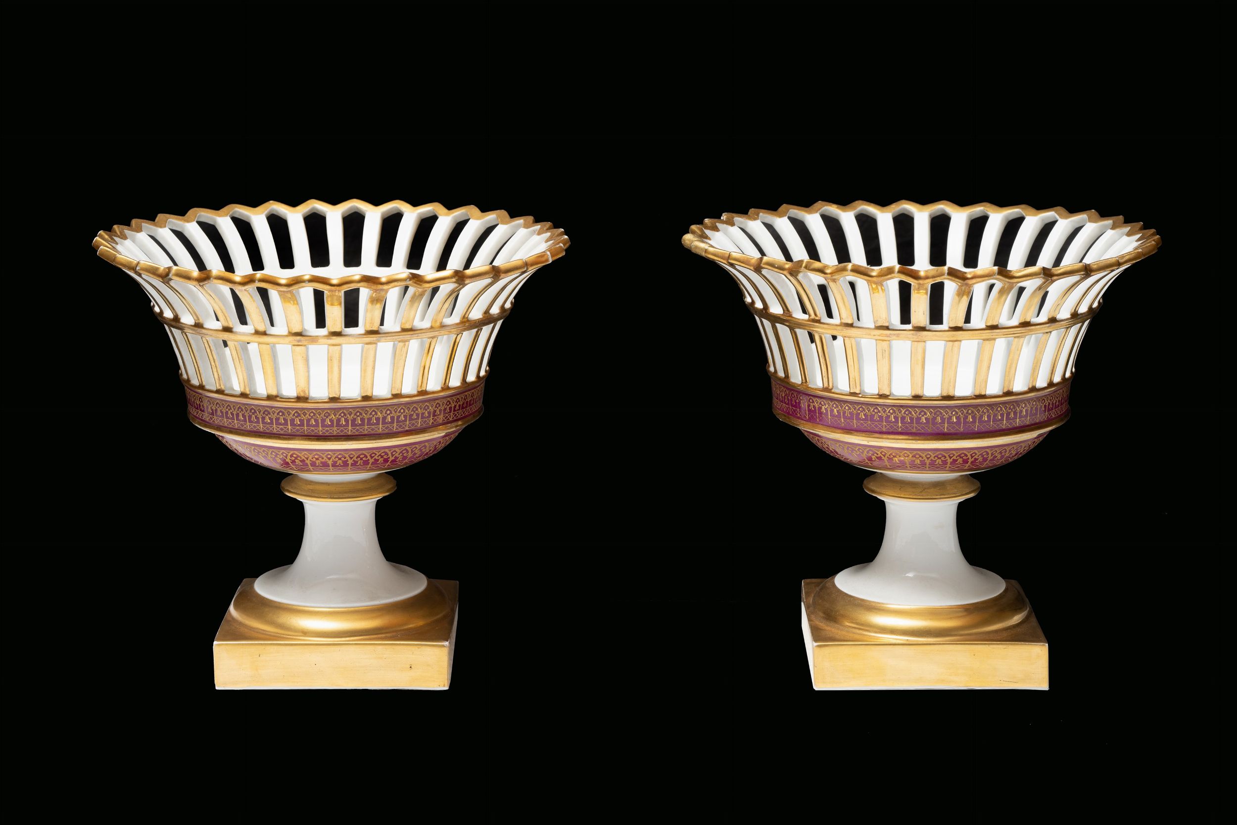 a cestino traforato con decoro bordeaux e dorato, h. cm 23