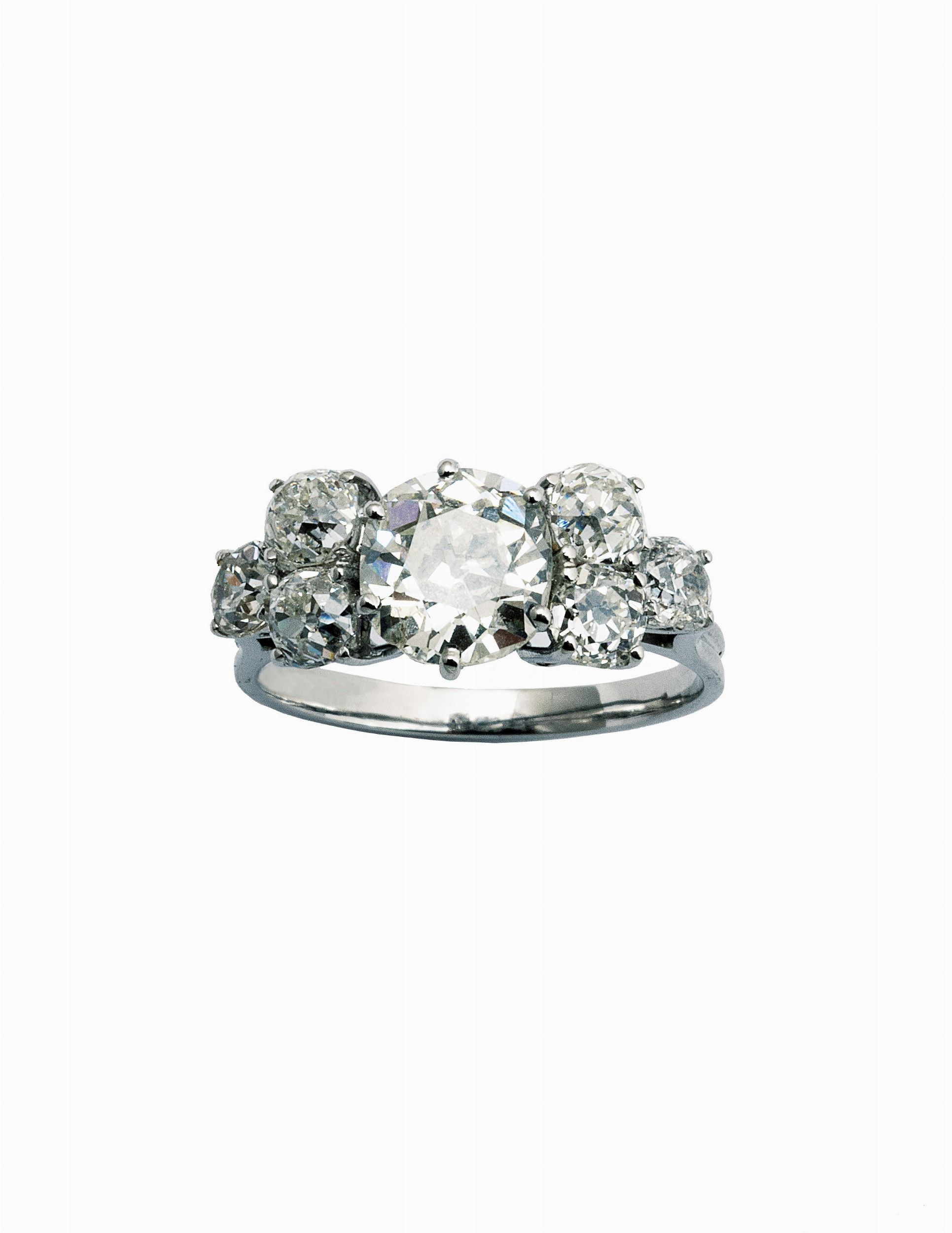 incastonato con un diamante centrale taglio antico del peso di 2 carati ca. colore I/J purezza SI2, e 6 diamanti laterali del peso complessivo di 1,30 carati ca. colore M/I purezza VS/SI