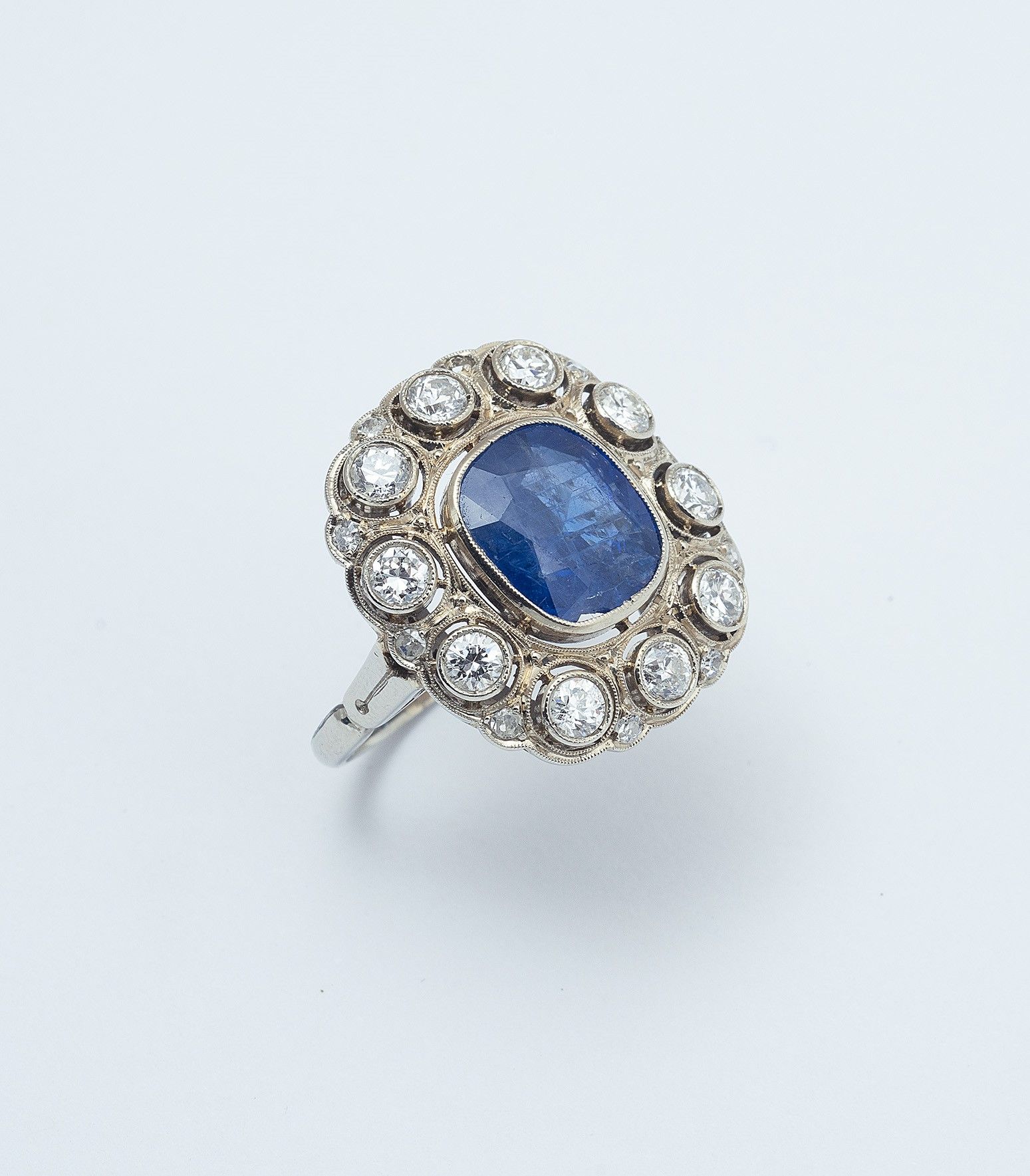dalla particolare lavorazione, incastonato con: 1 zaffiro naturale non riscaldato, forma cuscino taglio misto, del peso di 3,90 carati circa, provenienza Burma, Myanmar; 1,30 carati ca. di diamanti tondi taglio antico colore G purezza SI Zaffiro corredato di certificato gemmologico rilasciato dall’Istituto Gemmologico Nazionale, Roma, a cura del dott. Flavio Butini