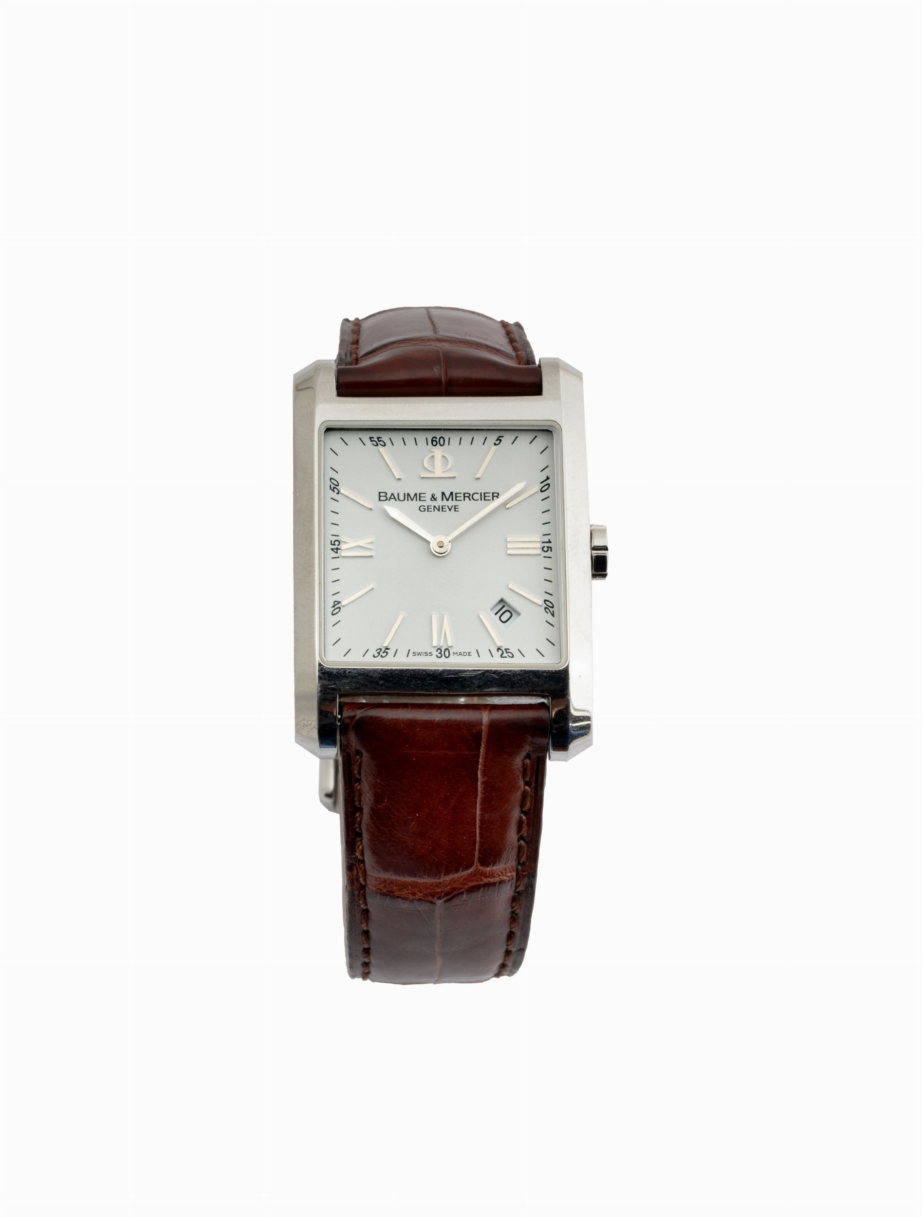Movimento svizzero al quarzo 2 sfere con datario Cassa di forma carrè impermeabile in acciaio con fondo a viti Quadrante bianco con indici applicati in acciaio Cinturino in pelle stampa cocco C4 Q5 M3