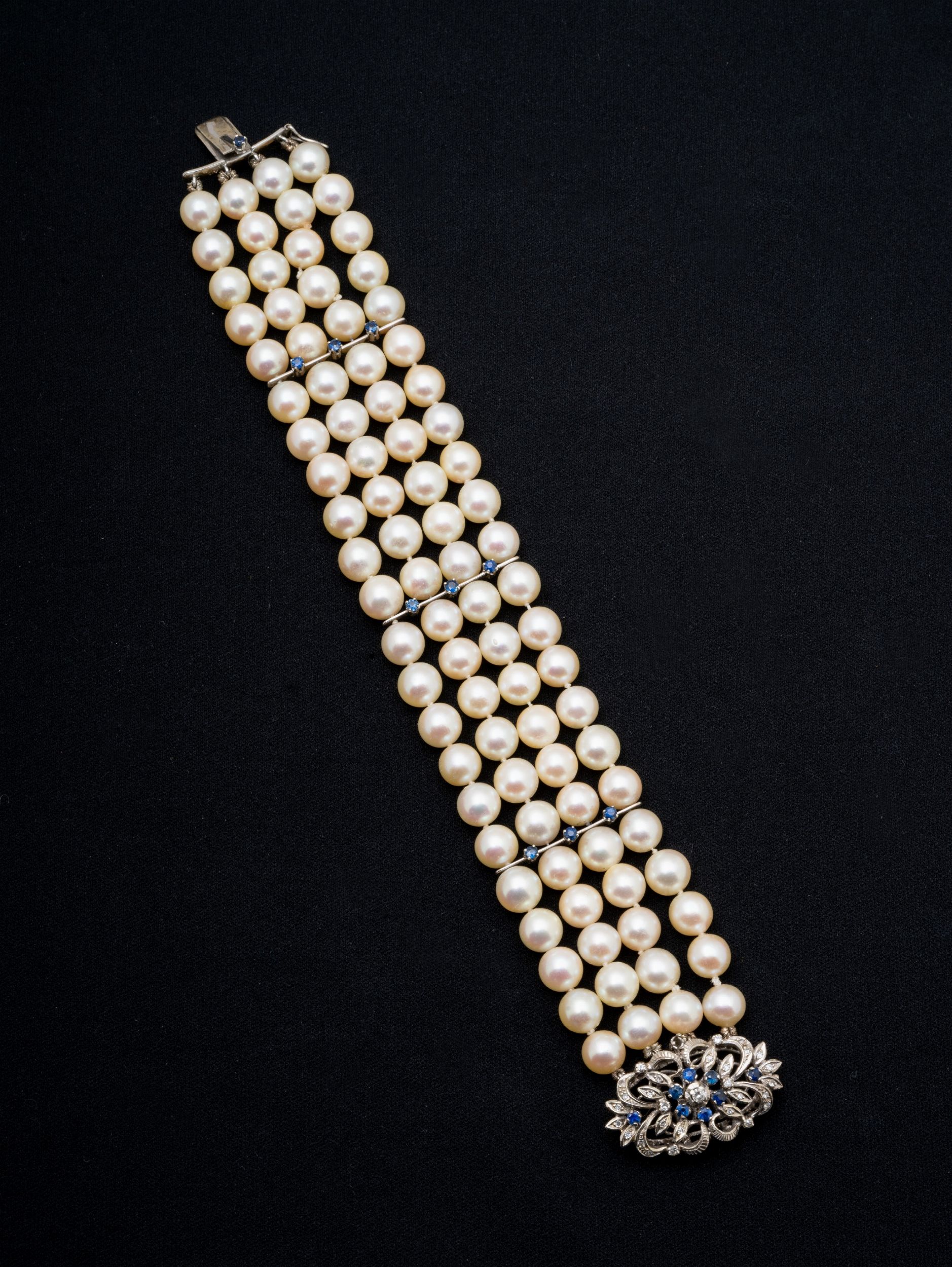 composto da 4 fili di perle di 7 mm ca. intervallate da 3 becchette in oro bianco 18 carati e chiusura in oro bianco 18 carati, con 18 piccoli zaffiri e piccoli diamanti taglio huit-huit