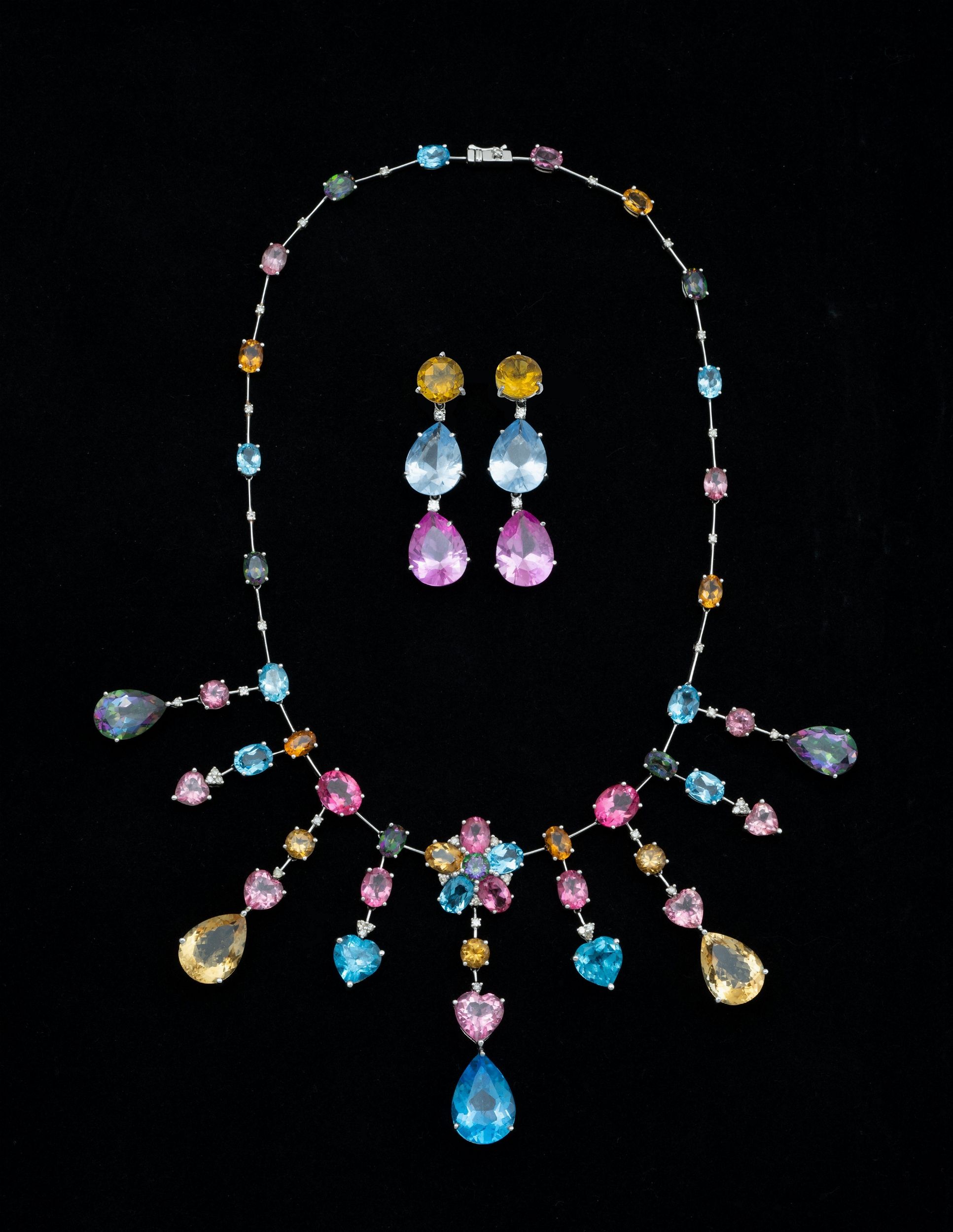 composta da collier e orecchini pendenti incastonati con pietre sintetiche di diversa entità e colore, e piccoli diamanti piquet e di colore giallo