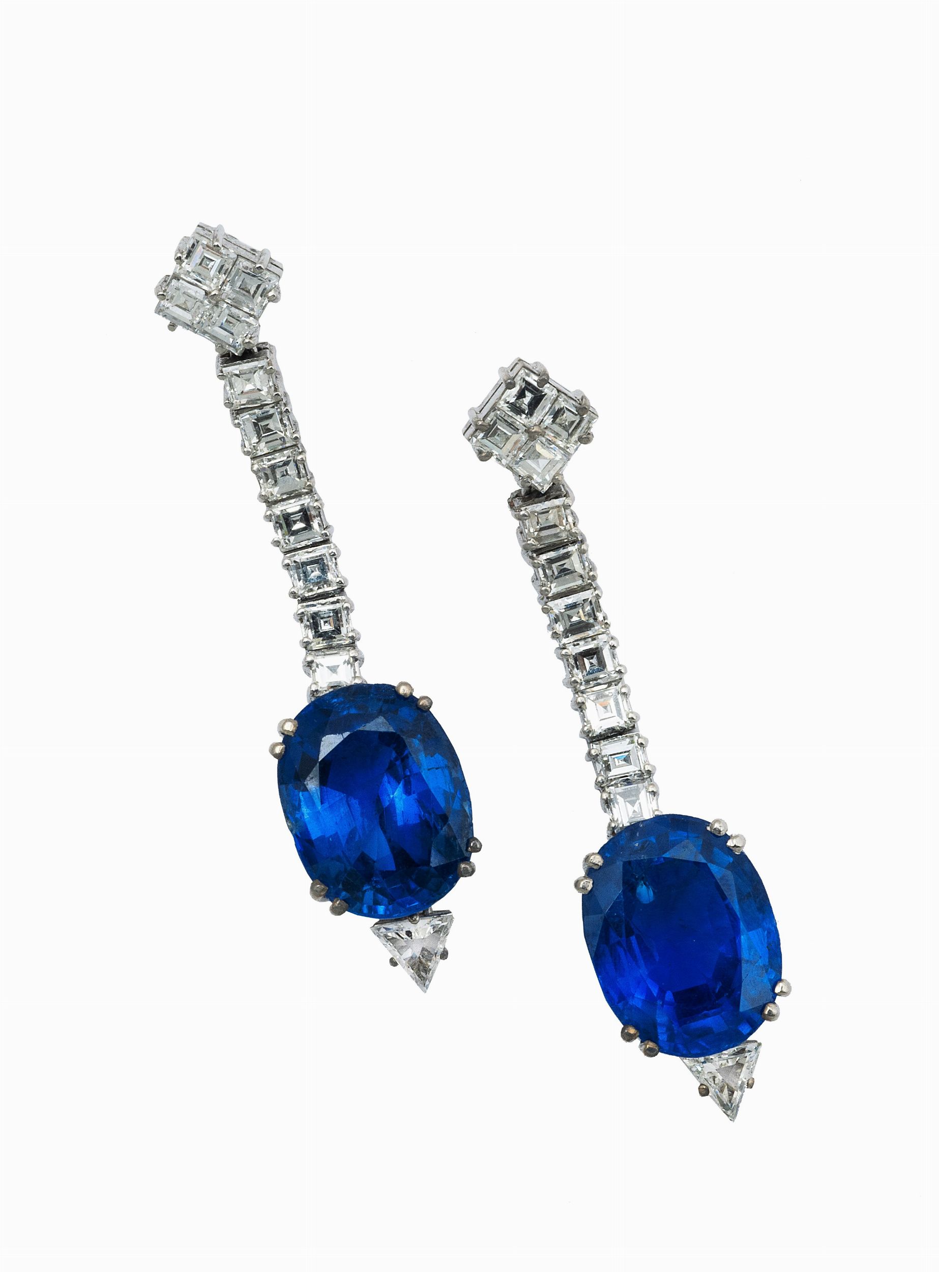 incastonati con: 1 zaffiro naturale non riscaldato forma ovale taglio misto, del peso di 5,60 carati circa, provenienza Burma, Myanmar; 1 zaffiro naturale non riscaldato forma ovale taglio misto, del peso di 5,90 carati circa, provenienza Celyon, Sri Lanka; 2 diamanti taglio triangolare a gradini da 0,24 carati circa, colore G/H, purezza VVS; 2,20 carati circa di diamanti taglio carrè, colore G/H, purezza VVS Zaffiri corredati di certificato gemmologico rilasciato dall’Istituto Gemmologico Nazionale, Roma, a cura del dott. Flavio Butini