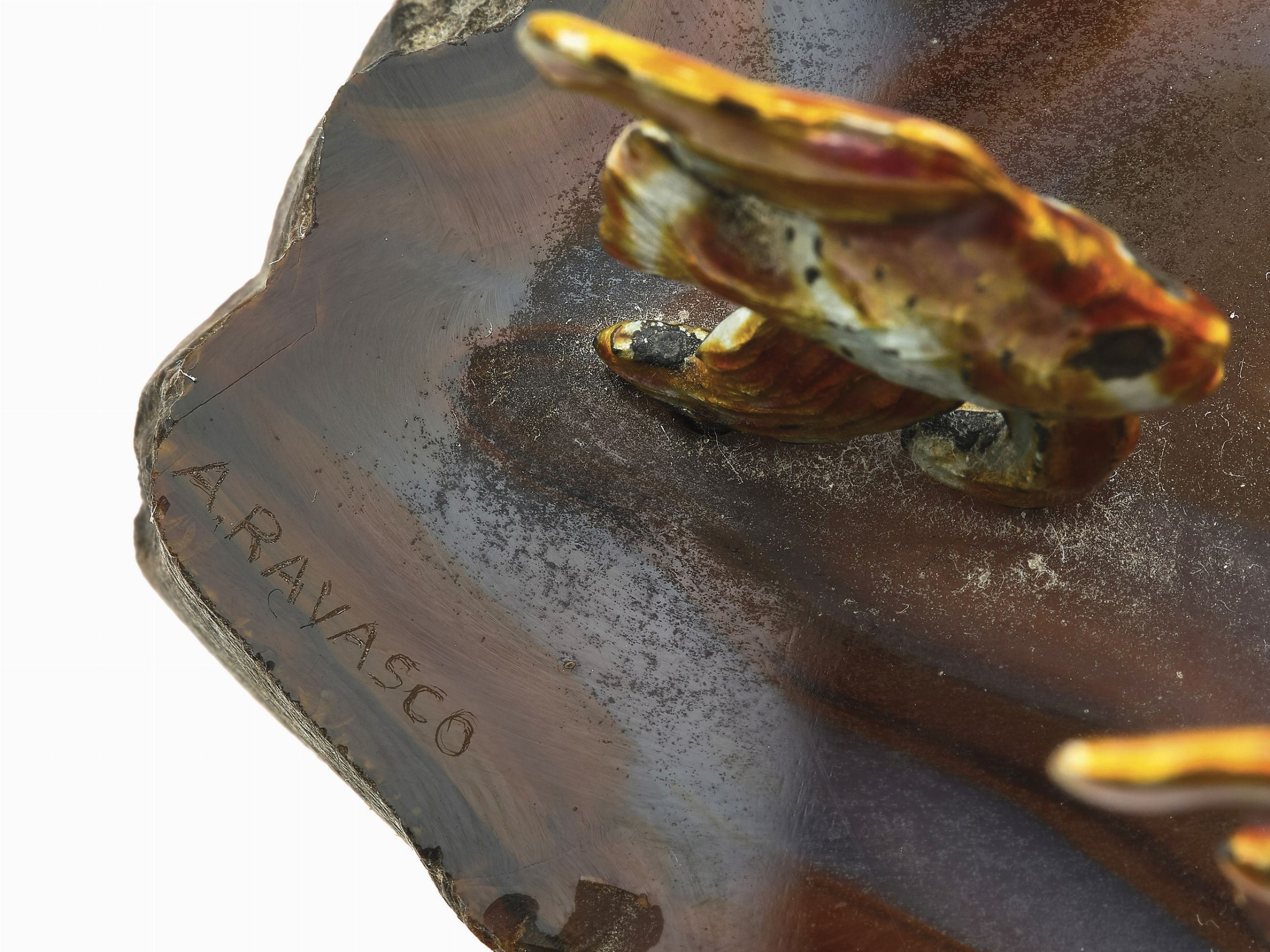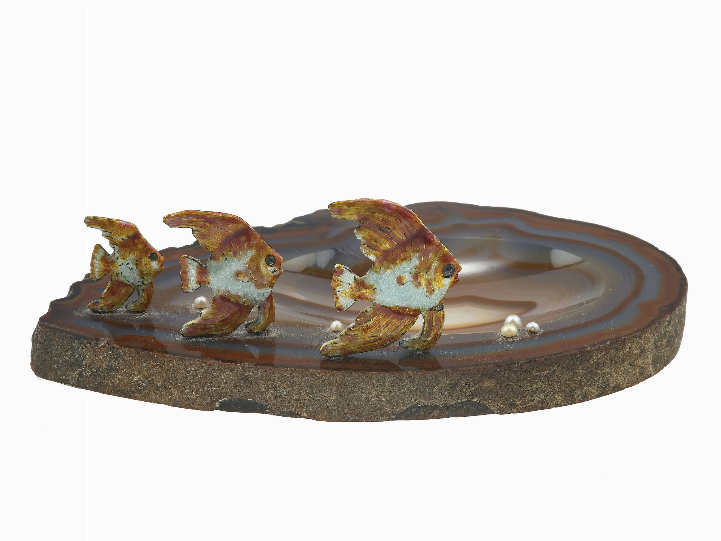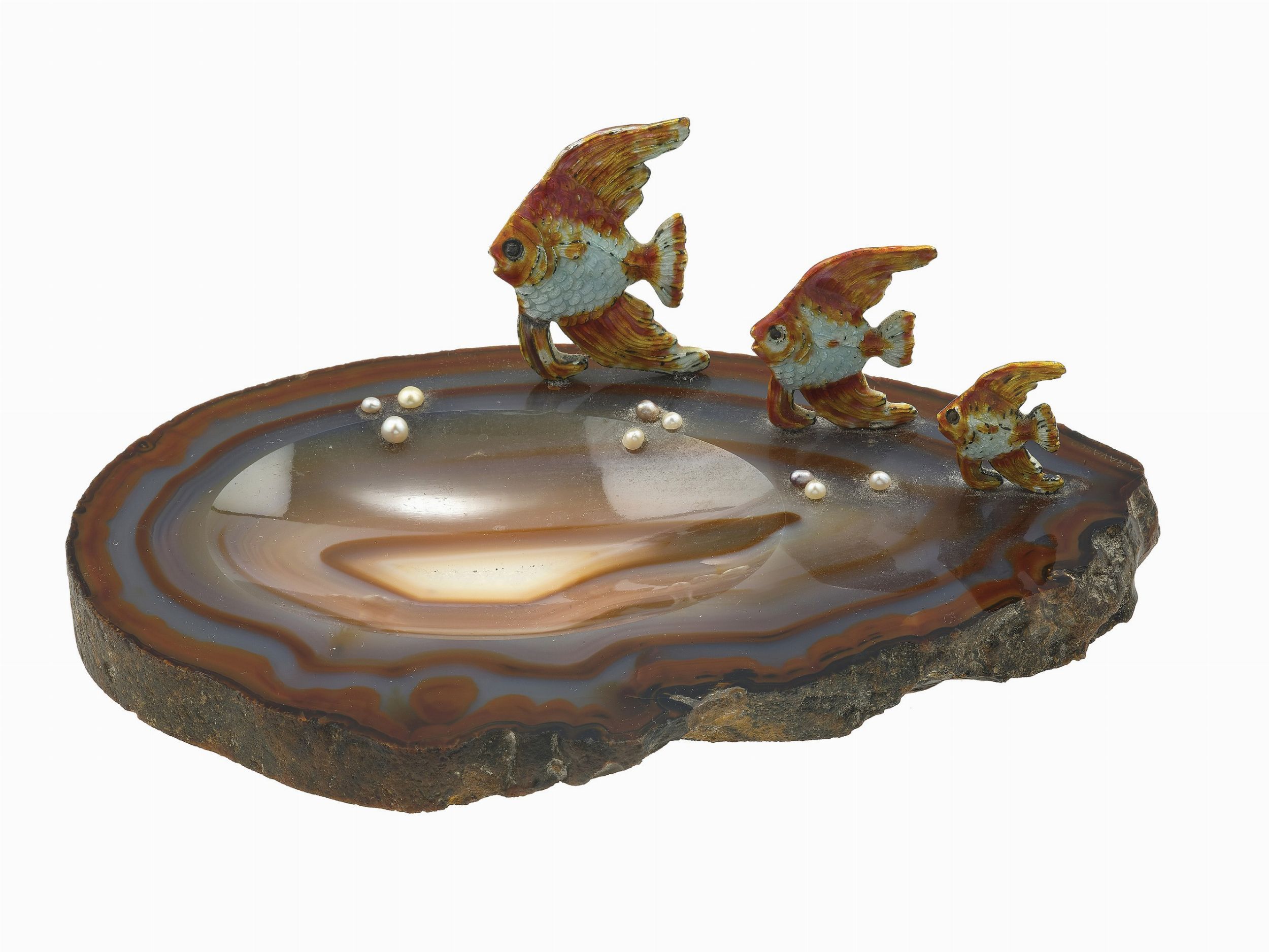 Alfredo Ravasco. Portaoggetti in agata e perle con tre pesci farfalla in metallo [..]