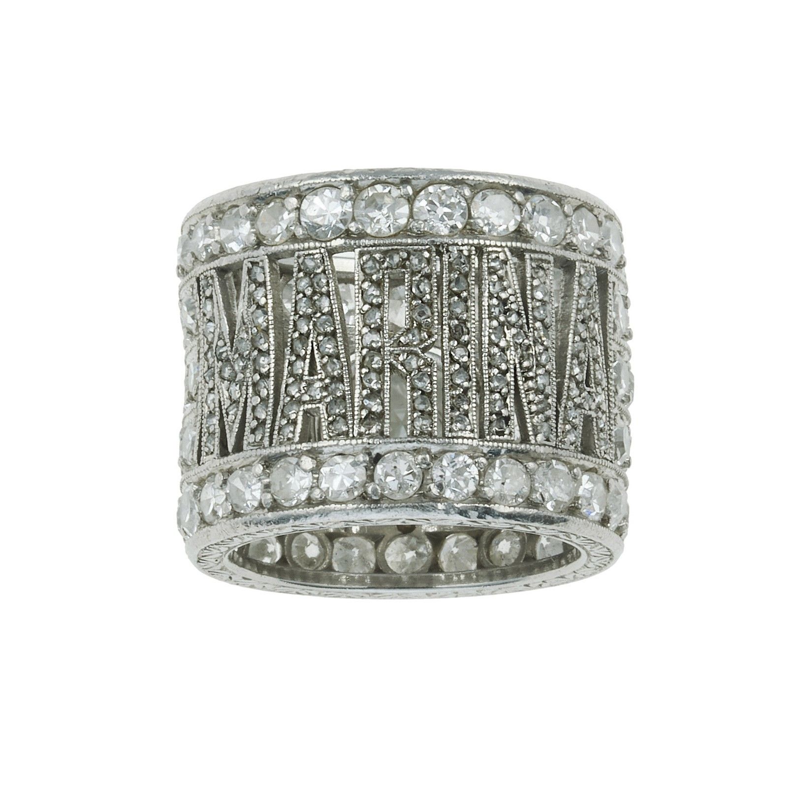 Anello a fascia con diamante di vecchio taglio e la scritta Marina a retro