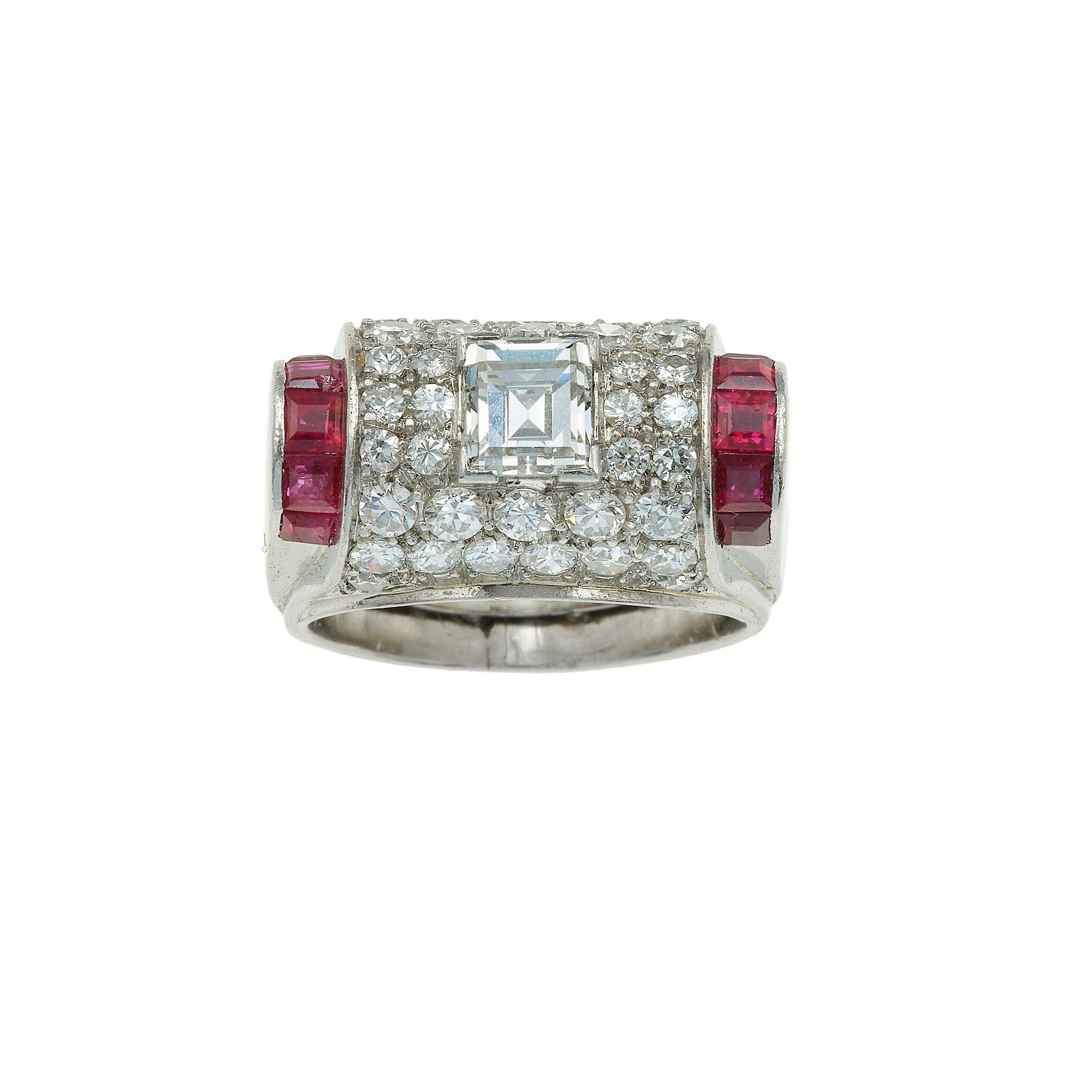 Anello con diamante centrale taglio baguette di ct 0.80 circa, diamanti a contorno [..]