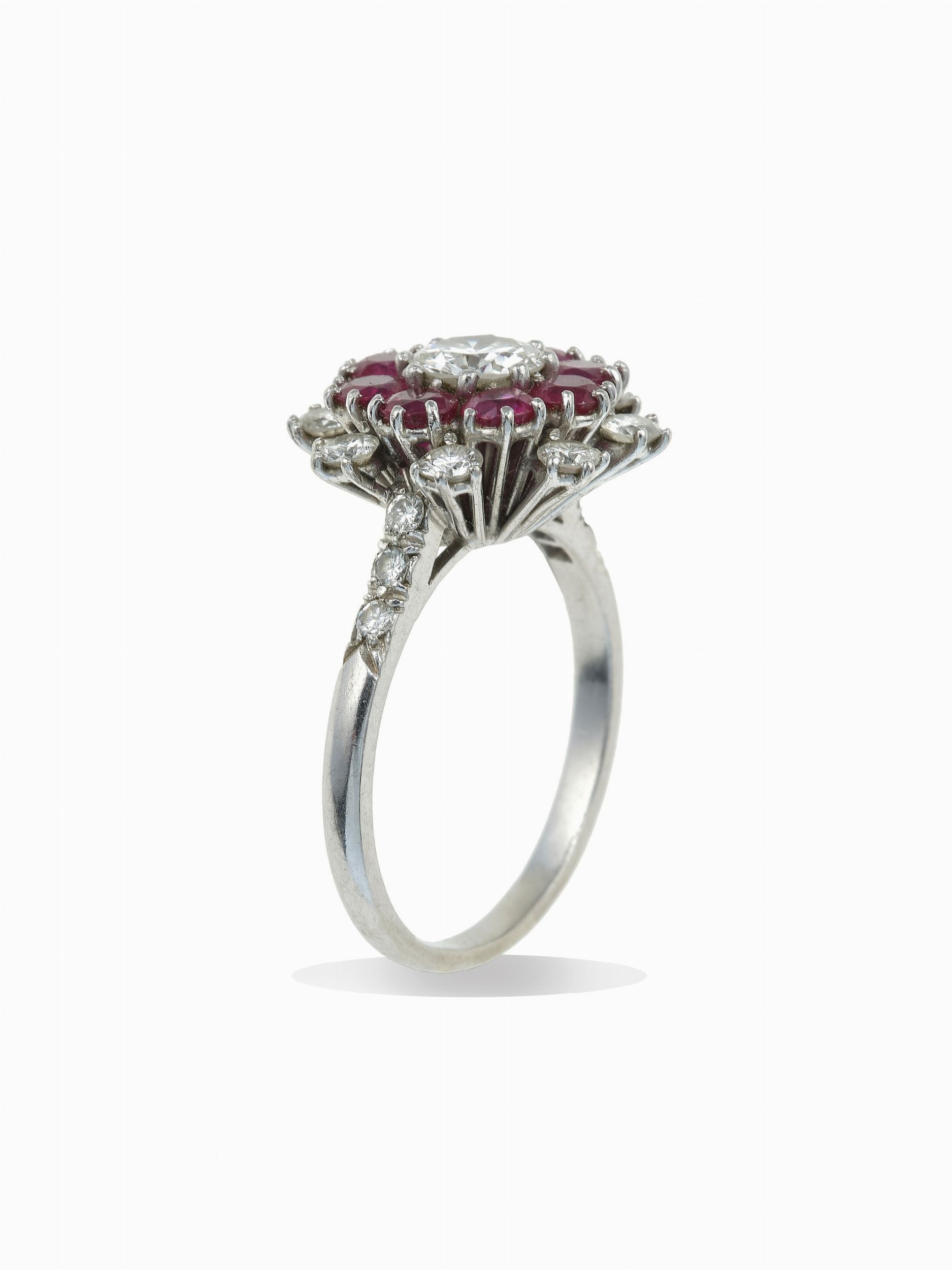 Anello con diamante centrale taglio brillante di ct 0.70 circa, rubini e diamanti [..]
